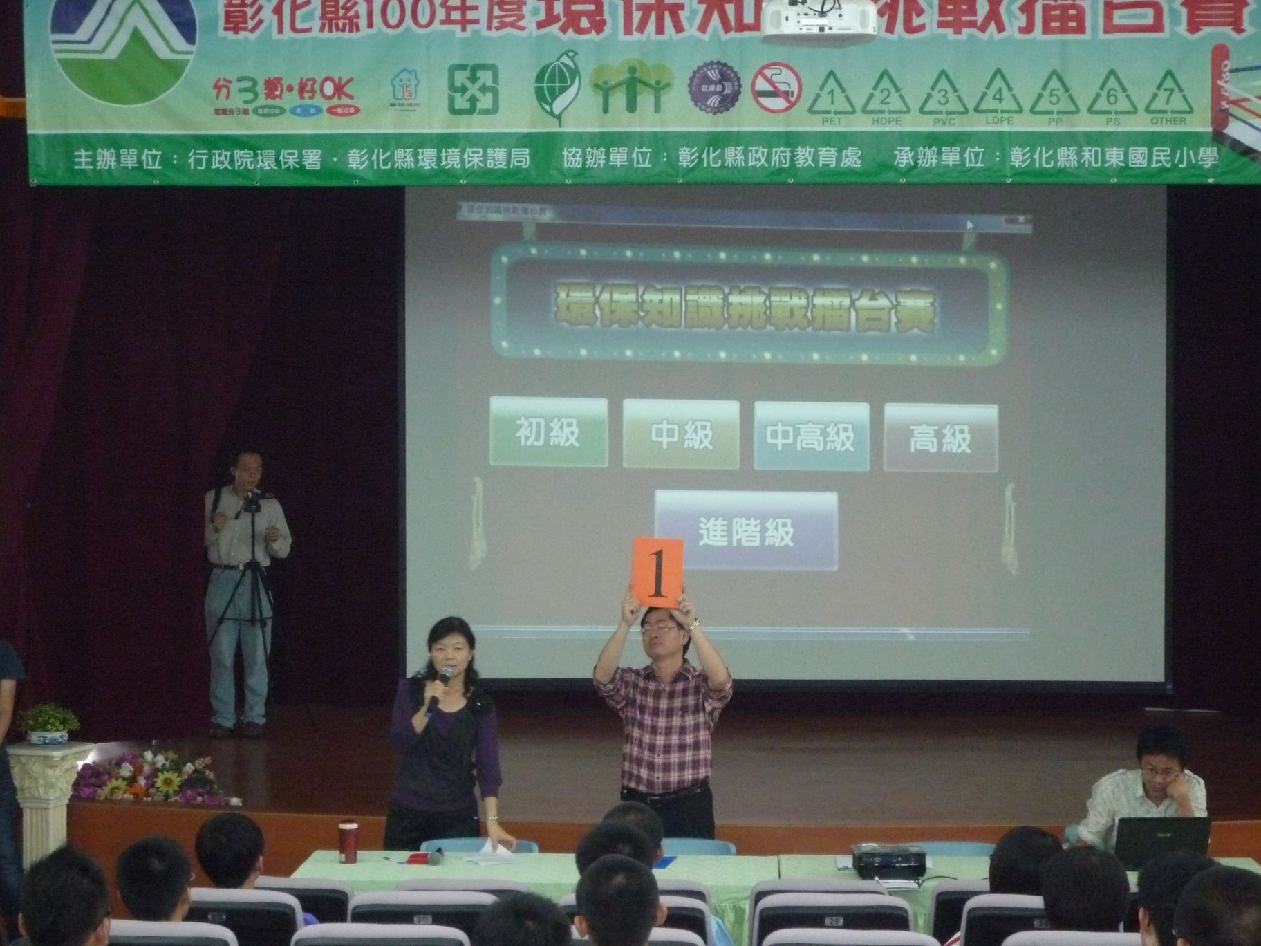 為使學生透過環保知識轉化為日常生活技能與環保行動力,彰化縣環境保護局於11月17日在和美鎮和東國民小學舉辦「100年度環保知識擂台賽」,是近年來的首場!首次辦理就有400位學生參加,透過激烈的搶答方式採逐題淘汰,最後選出明正國小楊淯潔、和群國中朱新庭及二林工商吳書宇等30位同學獲選為優勝者,這30位優勝者將於12月10日代表彰化縣進軍台北參加環保署舉辦之全國總決賽,與全國各路環保好手一起pk較勁!