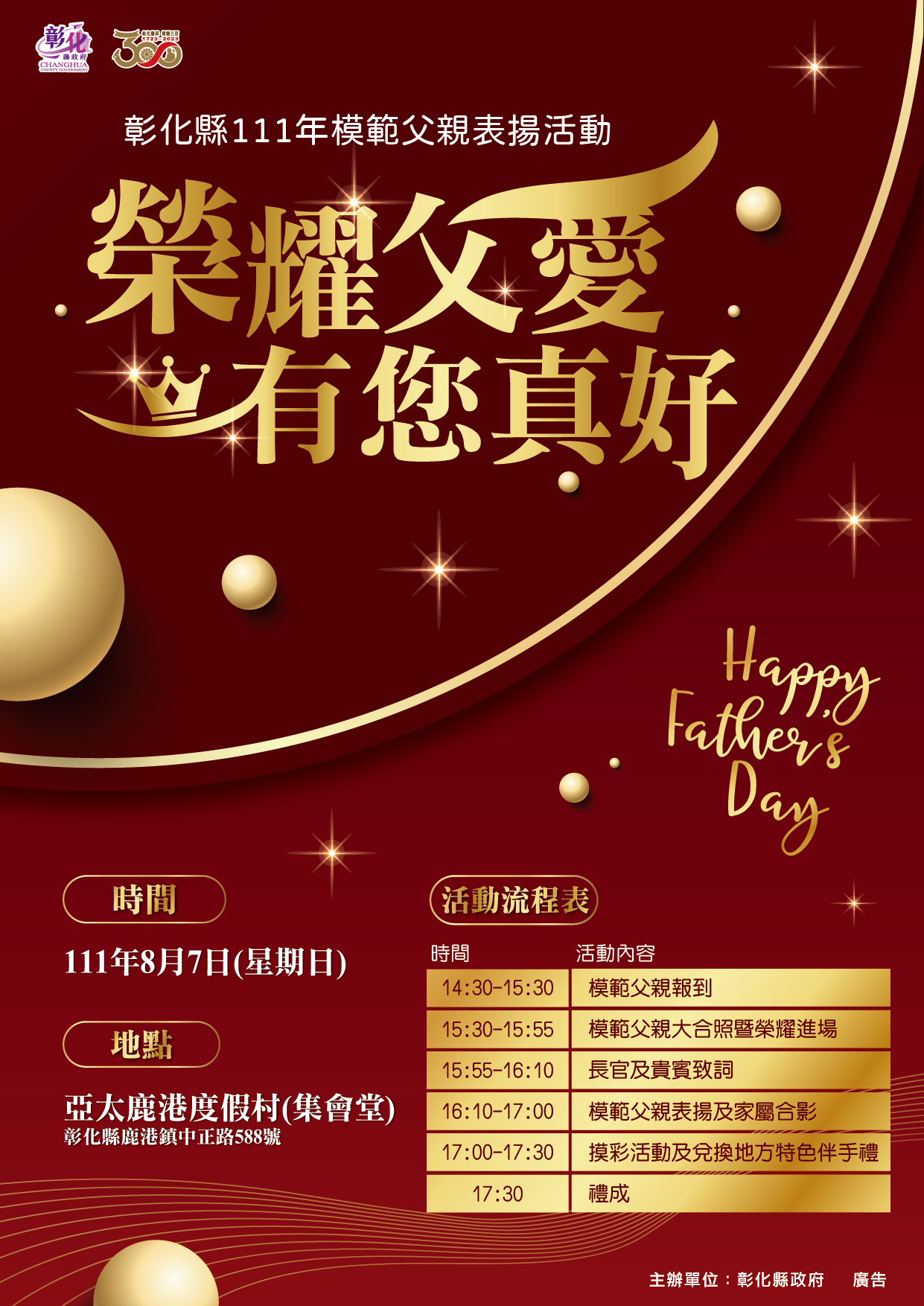 為彰顯父愛的偉大,並表達對模範父親的敬意,彰化縣政府訂於8月7日(星期日)下午在亞太鹿港渡假村集會堂舉辦111年模範父親表揚活動,由縣長王惠美頒獎表揚各鄉鎮市公所及社團所選出的38位模範父親,每一位接受表揚的模範父親,都有著令人感動的奮鬥經歷及為子女無怨無悔的付出故事,期許透過表揚活動,將他們的事蹟德行彰顯,傳遞到社會的每個角落,帶動社會善良風氣,建立一個安祥和樂的溫馨社會。