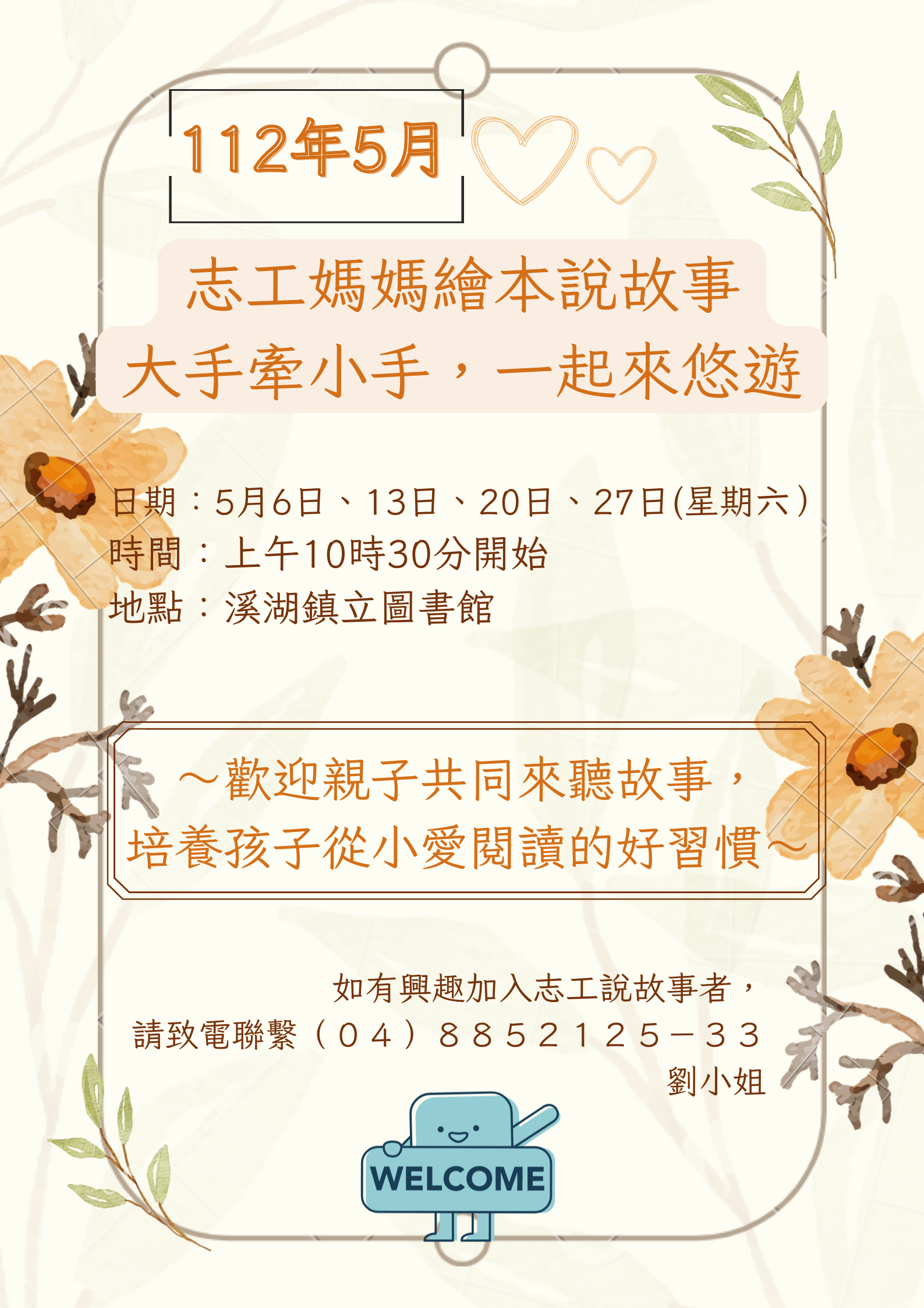 溪湖鎮立圖書館-5月【志工媽媽繪本說故事】來囉! 歡迎家長帶小孩一起來聽故事