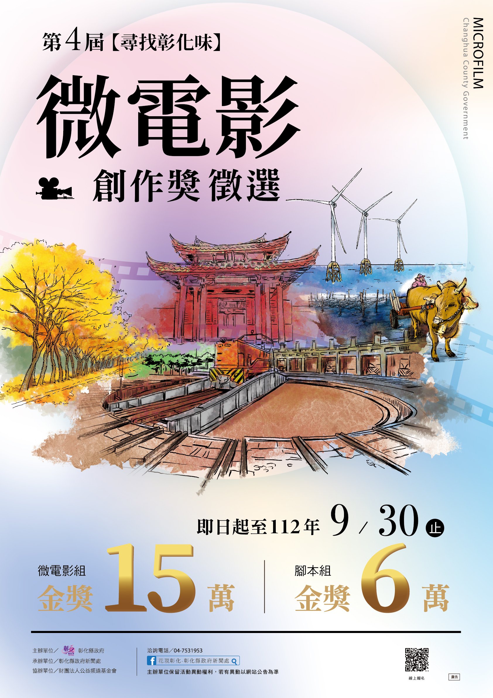 彰化縣政府辦理第4屆「尋找彰化味~ 微電影創作獎徵 選」活動,為鼓勵從事影像創作、培養新銳電影人才,透過微電影行 銷彰化在地特色、城市發展及縣政成果等,本府辦理第4屆 「尋找彰化味~微電影創作獎徵選」活動,徵件期間自即 日起至112年9月30日止。