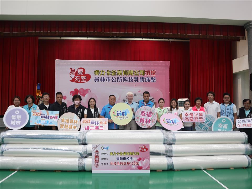 公私攜手、共創幸福,員林市公所結合民間床業公司捐贈科技乳膠床墊給予需要關懷的弱勢家庭,今 (14) 日於員林市西區體育館辦理「為愛充墊」美力卡企業有限公司捐贈員林市科技乳膠床墊捐贈記者會,美力卡企業有限公司沈松林董事長代表捐贈130床的科技乳膠床墊予市內各里弱勢家庭,受惠對象包含市內獨居長輩、身心障礙者及具有社會福利資格者,由員林市長游振雄接受捐贈,縣議員凃俊任、縣議員張欣倩、員林市民代表與各里里長等貴賓也出席捐贈儀式,共同見證,並對沈松林董事長的善行表示感謝,會後將由里長們協助載運並轉交受惠對象,讓他們能夠感受到來自民間的愛心與關懷。