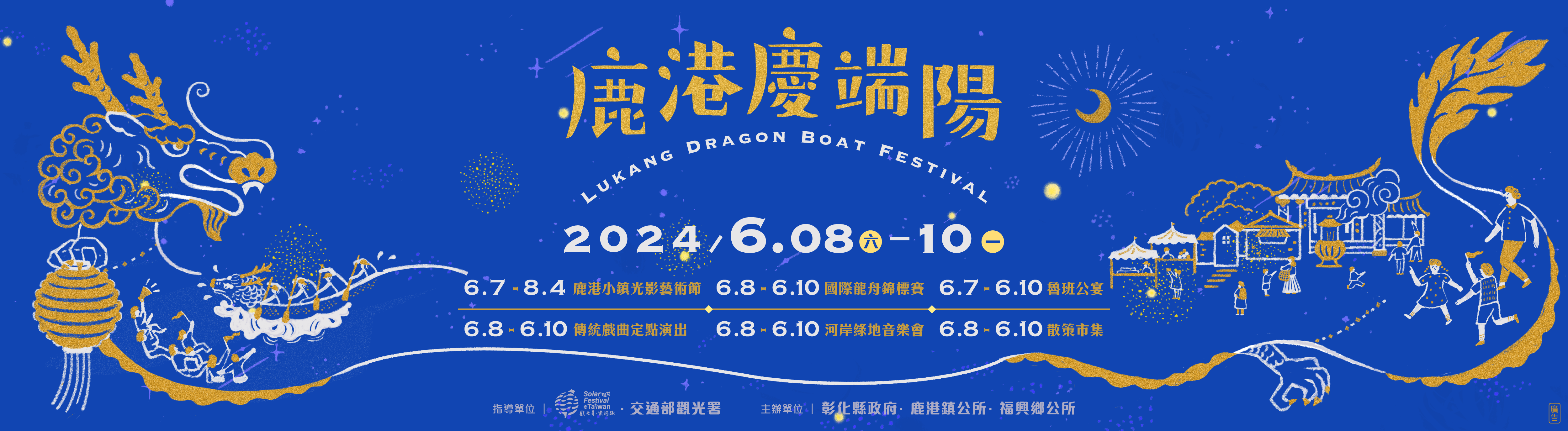 「2024鹿港慶端陽系列活動」自1977年辦理至今,今年邁入第47年,5月12日由龍王祭揭開前奏曲,6月8日至10日一系列民俗活動等您來體驗,邀您一起共襄盛舉,共度端午佳節。 另外「2024小鎮光影藝術節」6月7日至8月4日從鹿港中山路、老街、桂花巷藝術村沿至舊鹿港溪以各種特色燈飾,整個鹿港洋溢在歡慶佳節的氣氛中。 更多「2024鹿港慶端陽系列活動」、接駁車及交通資訊請至「彰化縣旅遊資訊網」網站查詢,隨時關注最新消息!
