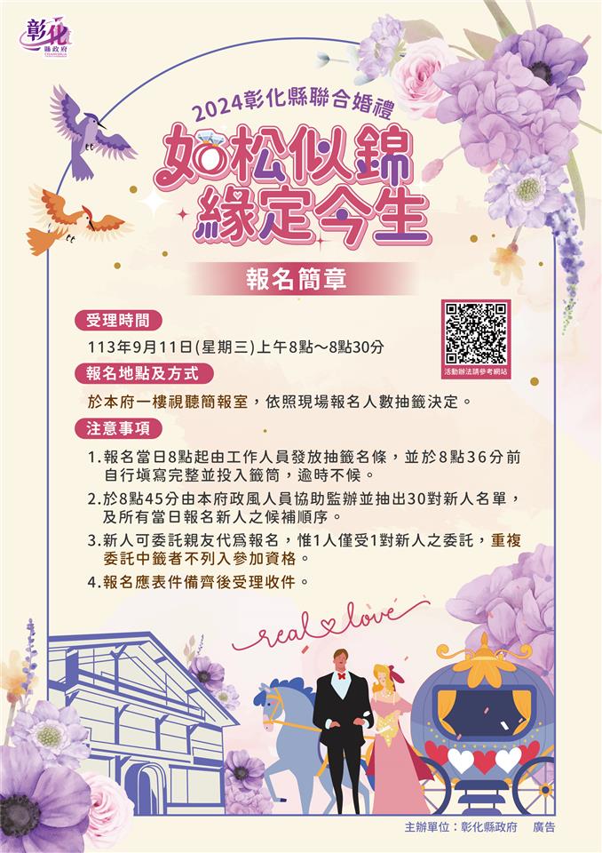 2024彰化縣聯合婚禮活動 實施計畫 壹、計畫緣起 一、 依據本府113年度施政計畫,推行國民禮儀及性別平等,消除性別歧視、促進實質平等之精神。 二、 宣導純化禮俗,辦理簡約隆重之婚禮儀式,以鼓勵本縣適婚縣民幸福成家。 三、 辦理家庭教育講習,供新人學習經營幸福家庭,相互尊重與包容。 貳、計畫內容: 一、 本年度活動特別擇定成美文化園今年度落成「松緣會館」舉行,以「如松似錦,緣定今生」之美意,希望所有參加新人感情能如松樹般堅定,共度人生旅程的每一個階段,並邀請參加新人騎乘電動自行車,行經成美文化園內充滿幸福寓意的景點,活動中除營造歡樂溫馨及浪漫氣氛,使參與婚禮之新人、親友感受到本府對參加人員之重視與祝福,同時藉由宣傳在地觀光,展現本縣幸福宜居的美好多樣面貌及魅力。 二、 本活動配合教育處家庭教育中心,辦理婚前教育課程,並於彰化縣性別人才資料庫中邀請講師授課,讓參與新人學習相互欣賞與包容,尊重多元性別特質,破除性別刻板印象,同時宣導家務分工及育兒福利政策,提升民眾生養子女意願及減輕經濟負擔,促進彼此經營婚姻之動力。 三、 本府提供1份禮品給每對參與新人,並由縣長抽出實用成家好禮贈與參與新人,並在眾人的祝福下幸福成家。 四、 聯合婚禮: (一) 縣長、來賓祝福。 (二) 縣長證婚:縣長擔任證婚人。 (三) 縣長頒發結婚書約。 (四) 致贈禮品及抽獎活動。 (五) 團體大合照。 參、辦理方式: 一、 活動重點:營造溫馨幸福之浪漫婚禮,並祝福參與新人幸福成家。 二、 活動時間:113年 10月13日(星期日)上午。 三、 活動地點:松緣會館(彰化縣永靖鄉中山路二段86號)。 四、 參加名額: 30對。 五、 參加資格: (一) 雙方當事人於今年度(113年)已完成結婚登記,或未婚並符合法定結婚之要件並預計於今年度完成結婚登記,參加新人其中一方須設籍於本縣,或工作地(就學地)於本縣(請檢附在職證明或就學證明),報名時需檢附戶籍謄本(或新式戶口名簿影本含詳細記事)等證明文件。 (二) 本府訂於113年9月29日(星期日)辦理家庭教育課程及活動前說明會,報名雙方需配合活動全程參與,未到場或中途離席視為放棄參加婚禮,由候補者遞補之。 六、 報名日期時間:113年9月11日(星期三),上班日之上午8時至8時30分。 七、 報名地點及方式:彰化縣政府一樓視聽簡報室,依現場報名人數抽籤定之。 八、 抽籤方式及相關規定:報名當日8點起由工作人員發放抽籤名條,並於8點36分前自行填寫完整並投入籤筒,逾時不候,並於8點45分由本府政風人員協助監辦並抽出錄取新人名單30對,及所有當日報名新人之候補順序,另參加新人可委託親友代為報名,惟1人僅受1對新人之委託,重複委託中籤者不列入參加資格。 九、 報名者應備表件: (一) 報名表(如附表1)。至本府全球資訊網/訊息中心/活動快訊(10月)/下載。 (二) 雙方當事人最近2吋半身照片各1張及國民身分證正、反面影印本,請張貼於報名表。 (三) 雙方當事人最近1個月內個人戶籍謄本(記事不省略)或新式戶口名簿(含詳細記事)影本1份,本府將查驗所持戶口名簿影本所載內容是否與戶政機關檔存最新戶籍資料是否相符,倘未相符應於接獲主辦單位通知後3日內補正完成,未於期限內補正視同棄權,由候補報名者遞補。 (四) 戀愛過程溫馨小品(如附表2),敘明認識的契機、交往過程與彰化在地人事物相關的溫馨故事。(未填寫恕不受理報名) 上列各項表件請於報名日依序裝訂,表件需齊全才收件受理。 十、 其他注意事項 (一) 請參加新人活動當日請穿著正式西服或禮服(請自行準備),特色民俗禮服亦可;另婚禮妝髮請自理,並於著裝完畢後至活動現場準時報到,活動現場恕不提供更衣或上妝空間。 (二) 活動當日全程參與之新人,本府將贈送禮品1份,另有其他贊助商提供眾多精美禮品等,請參加新人或親友自行於活動會場領回,本府及相關贊助廠商不提供運送及保管之服務。 (三) 本府保有隨時修改及終止本活動之權利,本活動如因天災、戰爭、其他不可抗力之因素或依傳染病防治法第3條發生傳染病,致無法如期舉行而延期、停辦時,新人不得異議或請求任何賠償;活動如有異動,將以彰化縣政府全球資訊網公告之資訊為準。 十一、 活動贊助單位: (一) 贊助本次活動之企業或團體,將於宣傳活動訊息時,同時揭露贊助企業或團體相關資訊,提供贊助商行銷機會,藉以增加贊助商贊助意願。 (二) 活動結束後,將於擴大主管會報中,頒贈感謝狀及禮品予贊助企業或團體以資感謝。 (三) 今年度贊助商將依去年度名單再次邀請相關單位參加,並配合活動辦理地點,邀請具區域代表性產業參加,為參加新人增添風采。 肆、預期效益 使本縣適婚縣民幸福成家,提升生育率,以達「樂婚、願生、能養」目標,實現「美好彰化、希望城市」之願景。 陸、本計畫如有未盡事宜得隨時修訂之。