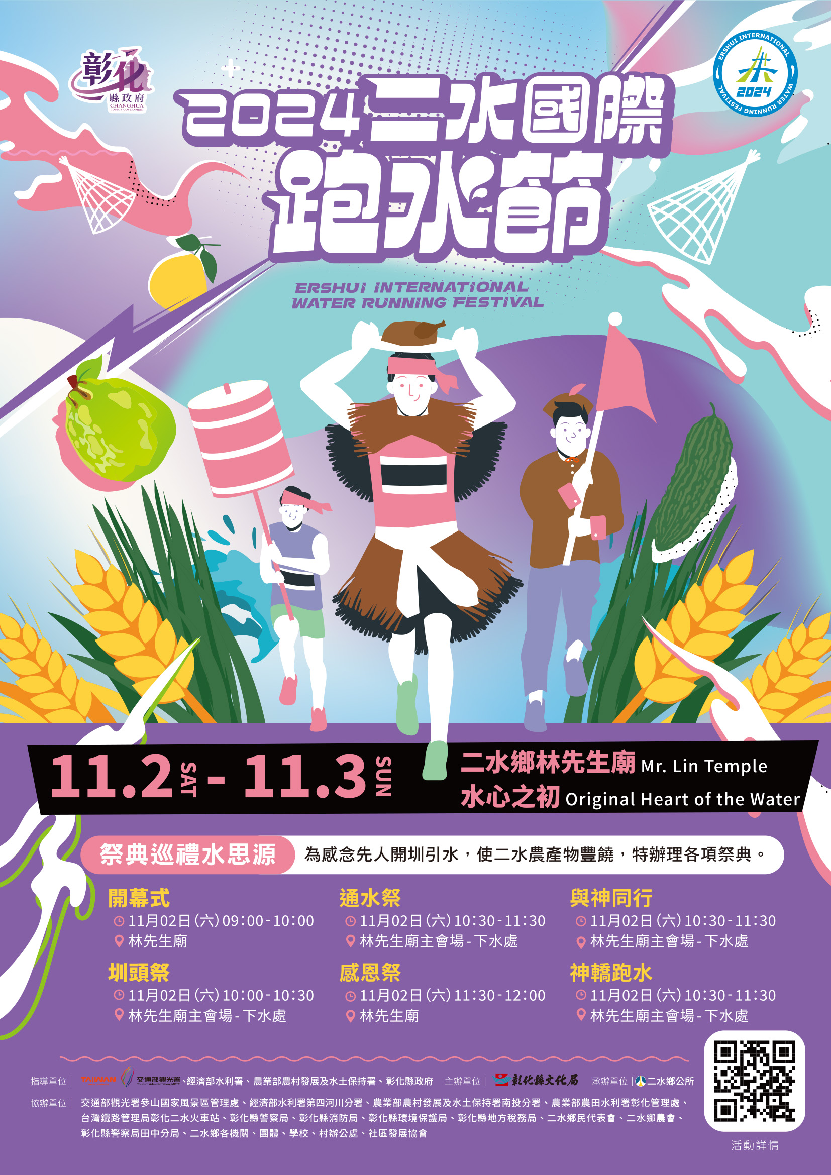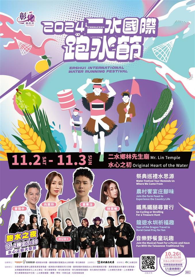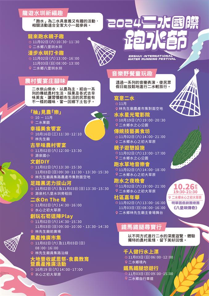 2024二水國際跑水節 一、活動日期:113年11月2日(六)至11月3日(日) 二、活動內容: (一) 祭典巡禮水思源:為感念先人開圳引水,使二水農產物豐饒,特辦理各項祭典。 1. 圳頭祭 時 間:113年11月02日(六)10:00-10:30 地 點:林先生廟主會場-下水處 2. 通水祭 時 間:113年11月02日(六)10:30-11:30 地 點:林先生廟主會場-下水處 3. 感恩祭 時 間:113年11月02日(六)11:30-12:00 地 點:林先生廟 4. 神轎跑水 時 間:113年11月02日(六)10:30-11:30 地 點:林先生廟主會場-下水處 5. 與神同行 時 間:113年11月02日(六)10:30-11:30 地 點:林先生廟主會場-下水處 (二) 龍遊水圳祈福趣:「跑水」為二水具意義又有趣的活動,相關活動適合全家大小一起參與。 1. 龍來跑水親子趣 時 間:113年11月02日(六)10:30-11:30 地 點:本縣二水鄉八堡圳水圳 2. 漫步水圳打卡趣 時 間:113年11月02日(六)13:00-16:00 113年11月03日(日)08:00-13:00 地 點:本縣二水鄉八堡圳水圳 (三) 農村饗宴庄腳味:二水依山傍水,以農為主,經由一系列的傳統農村生活、採果及各式古早味美食,讓習慣都市生活的民眾能有不一樣的趣味,當一回鄉下土包子。 1. 「柚」見農「樂」 時 間:113年10-11月 地 點:二水果園 2. 幸福美食饗宴 時 間:113年10月16日(三)11:30-12:10 地 點:林先生廟 3. 古早味農村饗宴 時 間:113年11月02日(六)12:00-13:30 地 點:源泉國小 4. 文創DIY 時 間:113年11月02日(六)13:30-15:30 113年11月03日(日)9:30-11:30、 13:30-15:30 地 點:農產市集對面空地 5. 足踏黑泥力拔山河 時 間:113年11月02日(六)及11月03日(日)13:30-15:30 地 點:源泉村八堡水圳旁稻田 6. 二水On The味 時 間:113年11月02日(六)14:30-16:00 地 點:二水鄉水心之初大草原 7. 創玩石筍逗陣Play 時 間:113年11月02日(六)14:30-15:30 113年11月03日(日)09:00-10:00、 13:30-14:30 地 點:林先生廟前廣場 8. 農產推廣市集 時 間:113年11月02日(六)及11月03日(日)08:00-16:00 地 點:林先生廟員集路沿線 9. 大地豐收感恩祭-食農教育暨農產推廣活動 時 間:113年10月19日(六)14:00-17:00 地 點:水心之初大草原 (四) 音樂野餐童玩趣:透過一系列的音樂表演,使民眾假日能放鬆地進行二水輕旅行。 1. 寫意二水 時 間:113年11月 地 點:林先生廟農產市集對面空地 2. 水水星光電影院 時 間:113年10月19日(六)19:00-20:30 地 點:二水鄉水之心公園 3. 傳統技藝美食坊 時 間:113年11月02日(六)12:00-21:00 地 點:二水鄉水心之初大草原 5. 親子遊憩設施 時 間:113年11月02日(六)13:00-17:00 地 點:二水鄉水之心公園 6. 跑水草地音樂會 時 間:113年11月02日(六)14:00-18:00 地 點:二水鄉水心之初大草原 7.跑水之夜晚會 時 間:113年11月02日(六)19:00-21:00 地 點:二水鄉水心之初大草原 8.社區嘉年華 時 間:113年11月02日(六)13:00-16:00 113年11月03日(日)08:00-16:00 地 點:二水鄉林先生廟主會場舞台 (五) 鐵馬鐵腿悠遊行:以不同方式進行二水的深度遊覽,體驗獨特的農村風情,留下美好回憶。 1.千人健行水上漂 時 間:113年11月03日(日)06:00-12:00 地 點:二水鄉境內 2.鐵馬鐵腿悠遊行 時 間:113年11月03日(日)09:00-15:00 地 點:二水鄉自行車道 更多詳盡內容請連結至二水國際跑水節網站 (網址:https://ershuiwaterun.tw/)