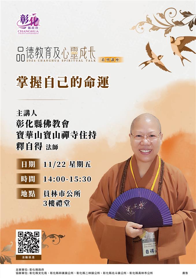 一、彰化縣2024年品德教育及心靈成長系列講座第5場於113年11月22日(星期五)14時至15時30分於員林市公所3樓禮堂由彰化縣佛教會釋自得法師主講「掌握自己的命運」,歡迎踴躍參加。