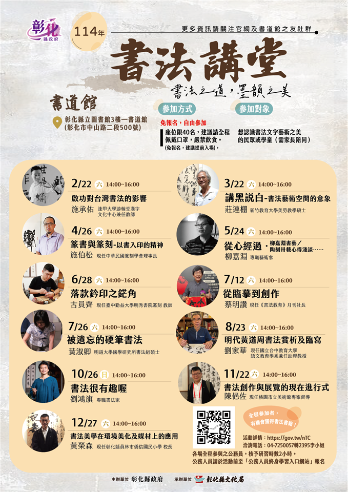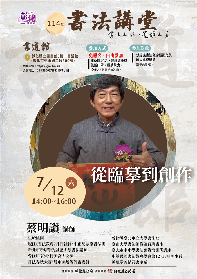【轉知】彰化縣文化局辦理「114年度彰化縣文化局書道館-書法講堂」