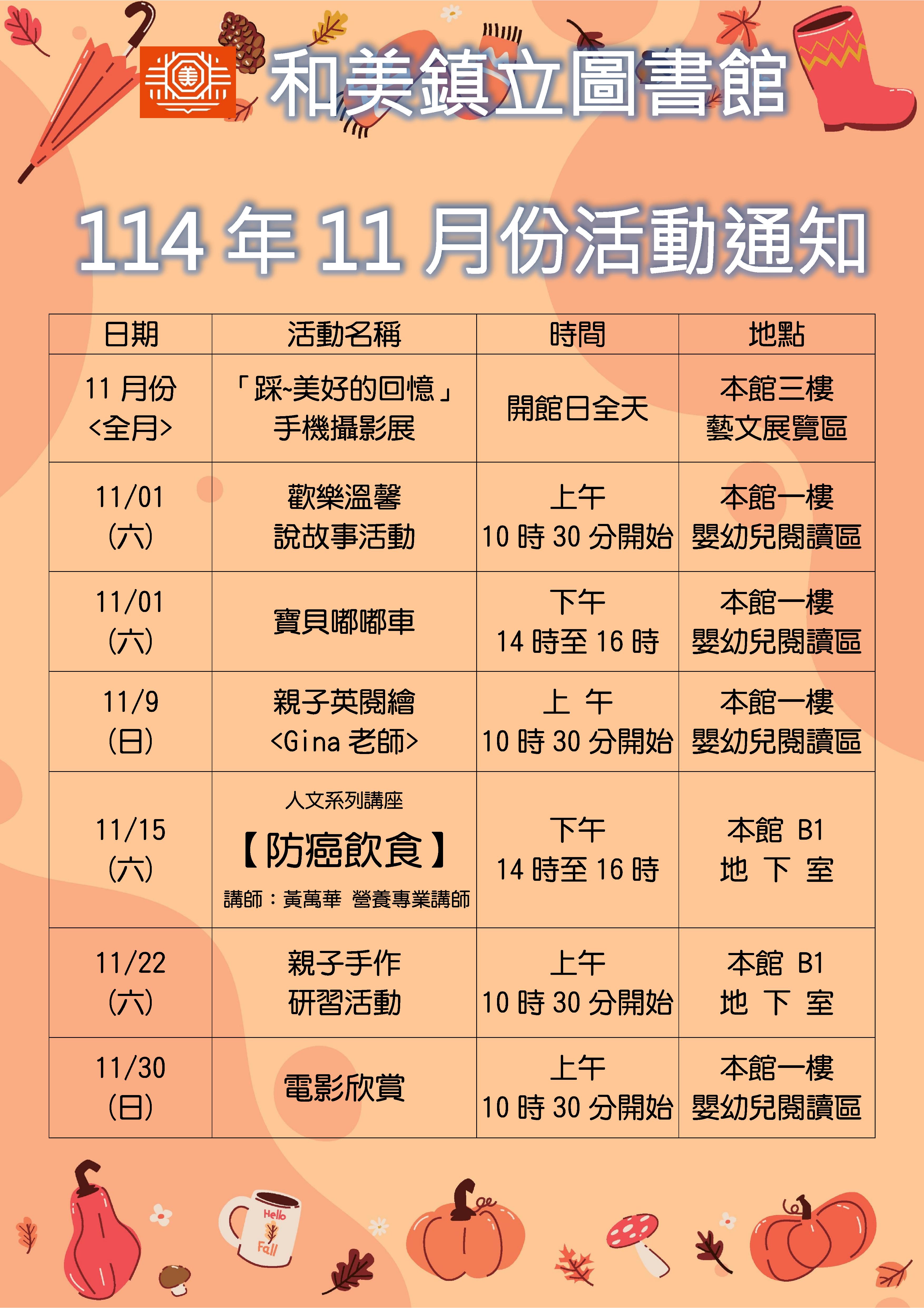 和美鎮立圖書館-11月活動通知歡迎大小朋友踴躍參加!11/22親子手作活動在11/1歡樂溫馨說故事結束後開放報名,借滿5本書即可免費報名!!!114年11月15日(日)下午14:00~16:00 #防癌飲食講座 由 #黃萬華老師主講 ,#免報名,自由入座喔!#完全免費#和美鎮立圖書館