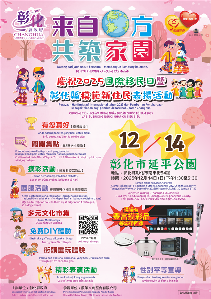 一年一度讓彰化縣新同胞及千里迢迢來臺工作者回娘家的節日來囉!一起來品嚐家鄉味、感受家的擁抱、也給今年得獎的兄弟姐妹一個熱烈的掌聲!