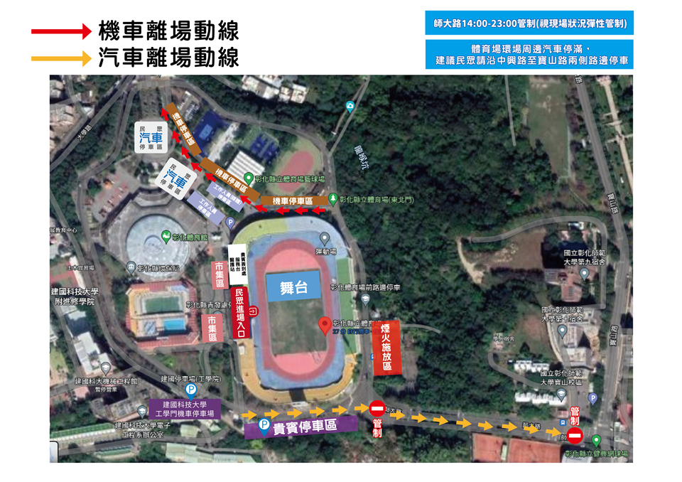 一、活動時間:114年12月20日(六);18時至22時。 二、活動地點:彰化縣立體育場。 三、活動內容:「2025彰化歲末演唱會」,歡度歲末,特別邀請9組老中青國台語等實力歌手輪番獻唱,陣容堅強。晚會當天搭配長達480秒的璀璨焰火施放及摸彩活動,歡度歲末。 四、管制路段及管制時間:師大路|114年12月20日14時至23時(視現場狀況彈性管制)。 五、摸彩券發放規則 發放時間:17:00(憑11-12月消費滿200元紙本發票2張即可兌換摸彩券乙張,每人僅限兌換1張,數量有限,換完為止。) ◆地點:會場摸彩卷兌換處 六、美食發放時間:17:30(1人限領乙份,數量有限,發完為止) ◆地點:會場美食兌換處 ※活動詳情及節目表,以現場公告為準。 自行開車:體育場周邊停車空間有限,若環場周邊車位已滿,建議可沿 中興路至寶山路 兩側尋找路邊停車位。 機車:建國科技大學工學門機車停車場停放。 為避免交通壅塞,建議民眾 共乘或騎乘機車前往。