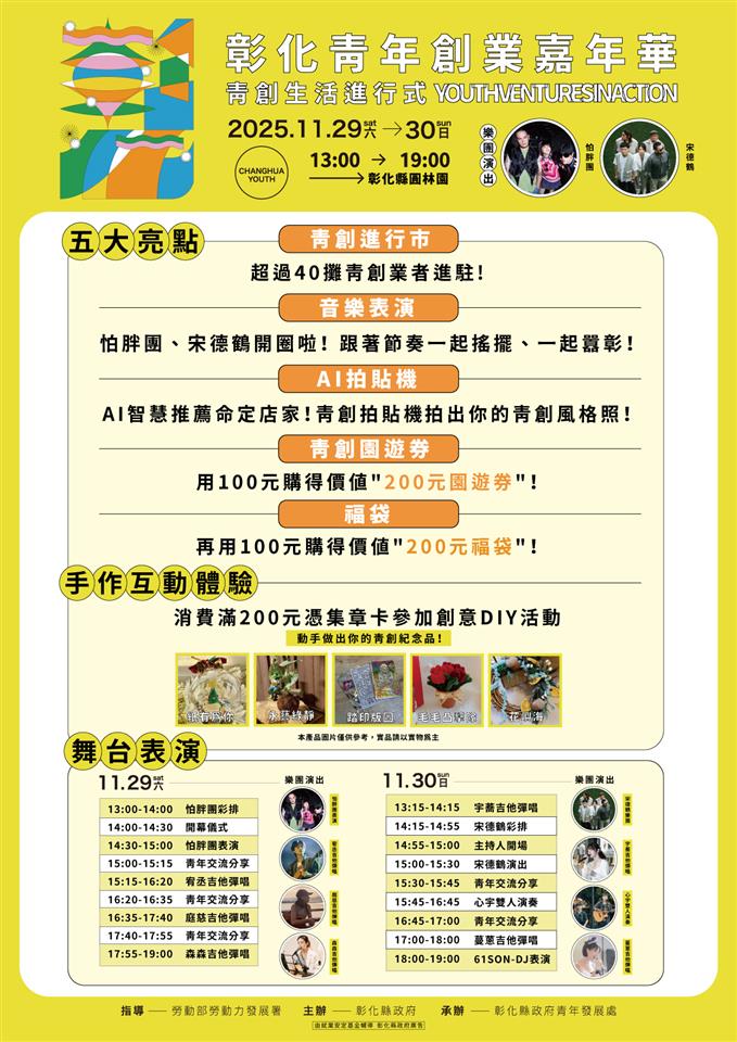彰化縣政府於11月29日及30日在圓林園舉辦「114年彰化青年創業嘉年華」活動,結合青創成果市集、青創互動體驗、青創產品推廣及知名樂團表演等活動,吃喝玩樂應有盡有,邀請大家共襄盛舉,一起感受彰化青年的創業實力與活力。