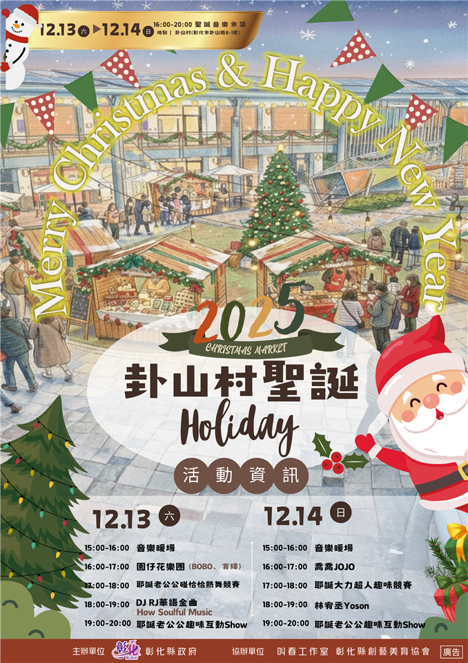 誠摯邀請大小朋友,把握週末假期攜家帶眷來到卦山村,聽音樂、看比賽、品嚐美食逛市集。期待與您共度最難忘的「2025卦山耶誕Holiday」。縣府持續帶來一系列精彩的活動,歡迎大家到彰化旅遊,12月14日晚間在縣立美術館廣場點亮聖誕樹,當日下午4時有彰化縣音樂河社會福利協會辦理的園遊會及精彩舞台表演。12月20日晚上在彰化縣立體育場舉辦「2025彰化歲末演唱會」、12月27日「2026彰化月影燈季」開燈,展出至明(115)年3月1日止,精彩可期,相關活動資訊請上彰化縣政府全球資訊網查詢,彰化愈來愈精彩,請大家拭目以待。