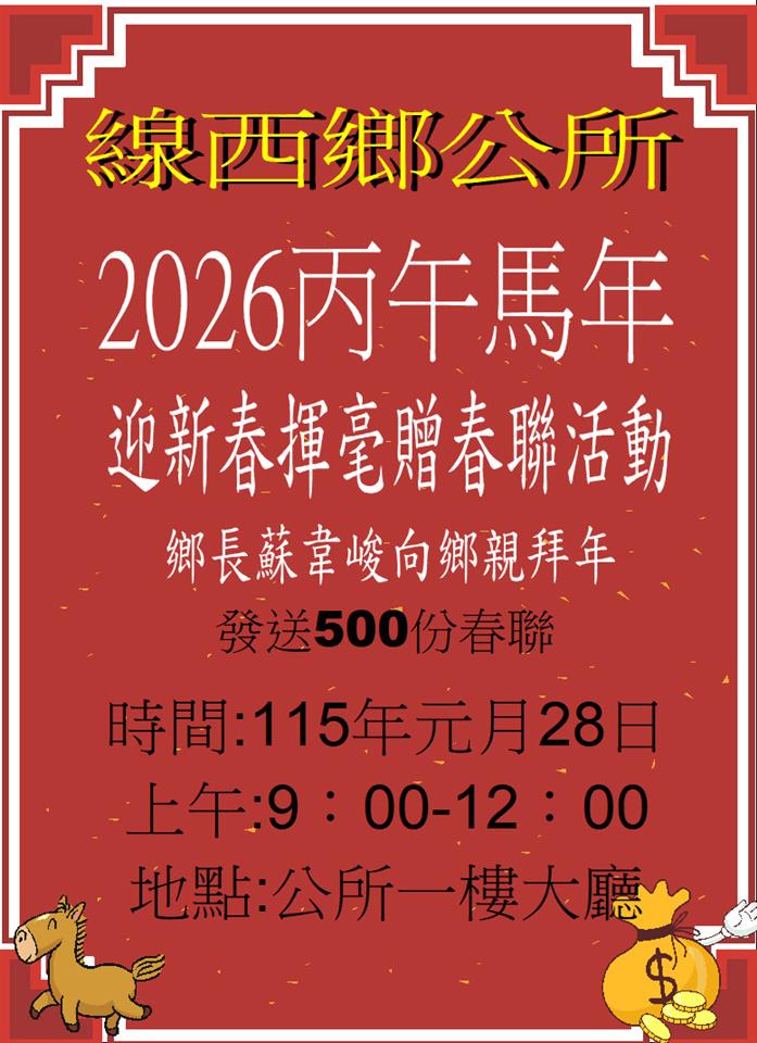 主 旨:為宏揚傳統國粹及藝術文化,豐富民眾精神生活,並提前讓民眾感染過年的氣氛。辦理單位:線西鄉公所(圖書館)活動日期:115年1月28日(星期三)上午9:00-12:00活動地點:線西鄉公所一樓大廳鄉長 蘇韋峻 發送500份春聯向鄉親賀年,歡迎鄉親踴躍索取,每人限索取一副,送完為止。