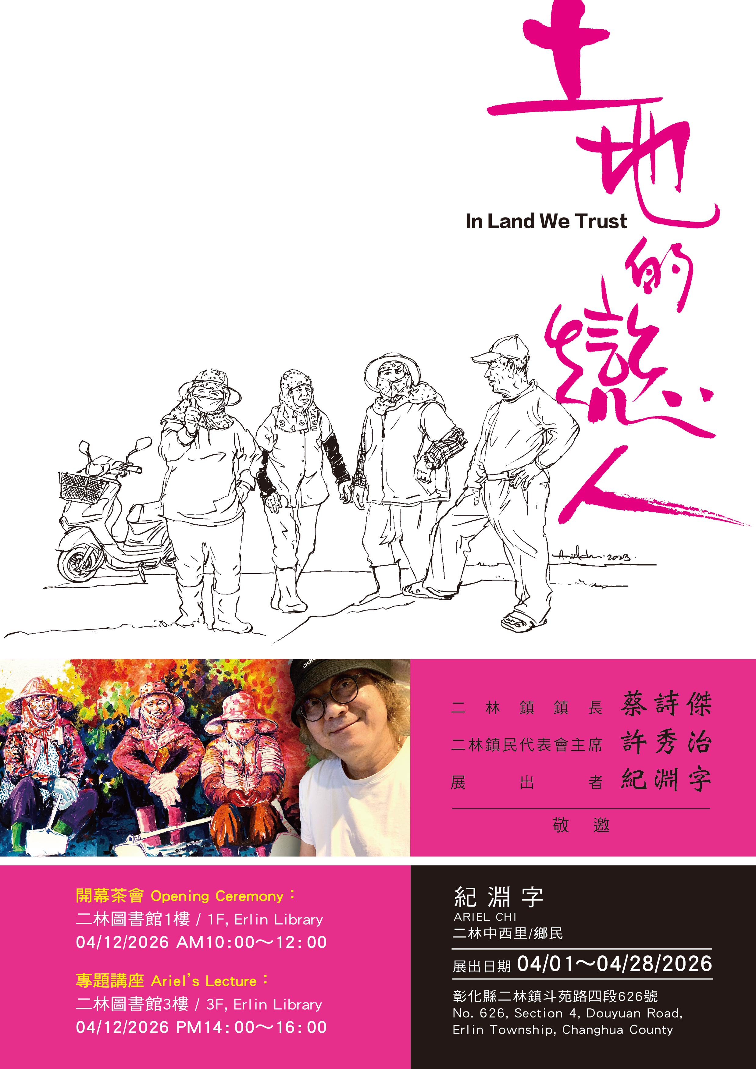 一、旨揭講座訂於115年4月12日(星期日) 下午2時至4時於該鎮立圖書館3樓演講廳由旅外資深廣告創意人紀淵字主講「土地的戀人」。二、全程參與之公務人員,核予研習時數2小時,歡迎至公務人員終身學習入口網(https://ecpa.dgpa.gov.tw/)登錄報名。
