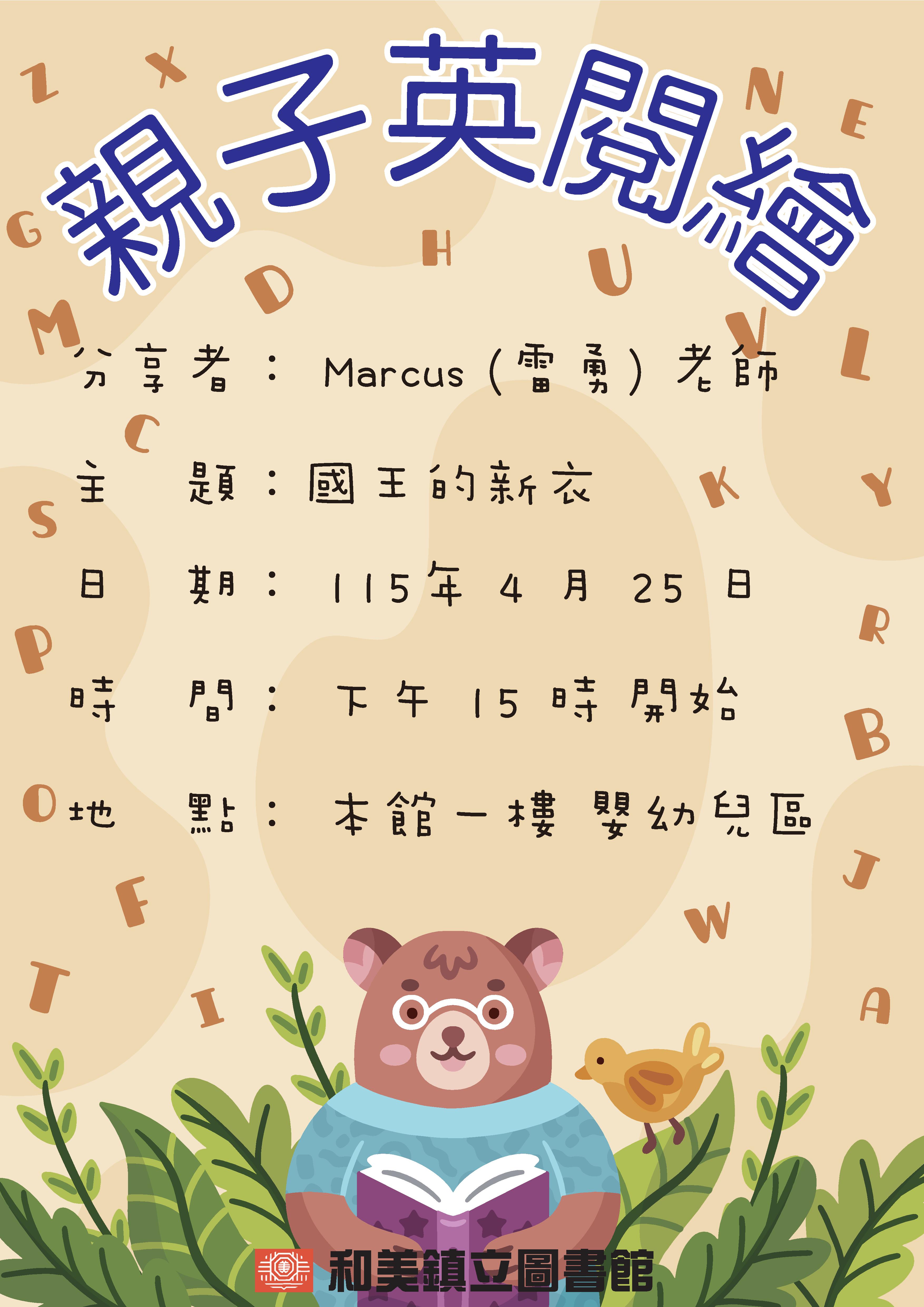 【親子英閱繪】 主題: 國王的新衣講師: #Marcus(雷勇)老師活動日期: 115 年 4 月 25 日(六) 下午 3:00 開始活動地點: 本館一樓 嬰幼兒區大家期待已久的Marcus老師回來了!睽違近半年,Marcus(雷勇)老師將再次帶領大家進入生動活潑有趣的英語世界。歡迎大小朋友一起來參加!!!#免費參加自由入場#和美鎮立圖書館