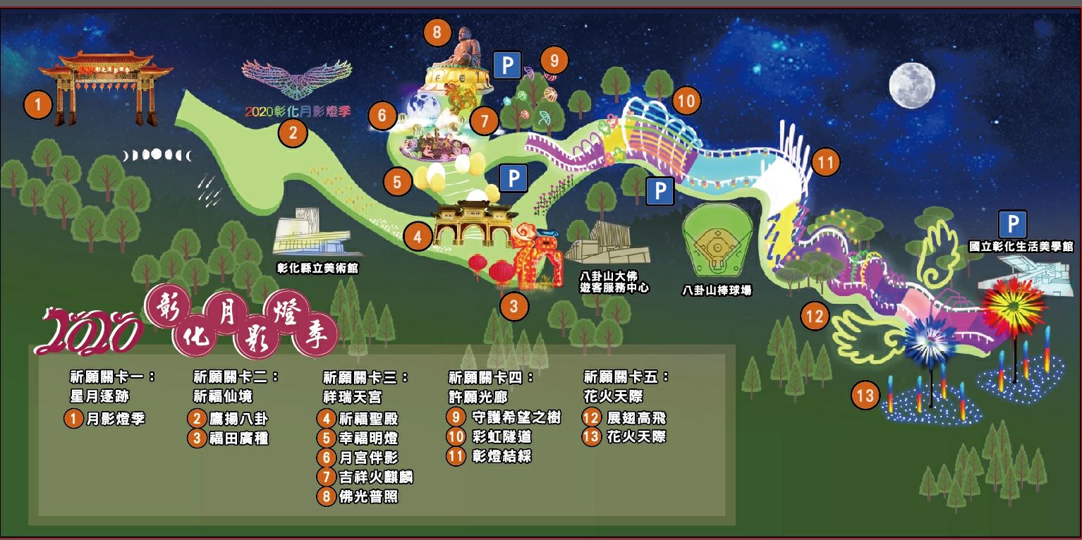 彰化縣政府舉辦「2020彰化月影燈季」活動,將八卦山設計為「卦山春曉祈福燈區」,從八卦山牌樓「祈福仙境」佈置光環境,到八卦山大佛「祥瑞天宮」的黃金牌樓,走到大佛前廣場有「吉祥火麒麟」,沿著縣府的天空步道還有「許願光廊」、「花火天際」等等各種光芒四射的燈光藝術,不同的主題燈區各有不同的風味,適合全家一起前來拍照打卡,八卦山夜間更加喜氣、更加歡樂,一系列的美麗燈景等著大家,好吃、好玩、好看的都在彰化,八卦山燈區展期到2月9日(農曆元月16日),歡迎鄉親利用元宵節周末假期到八卦山走走,把握最後2天賞燈機會。 「2020彰化月影燈季」璀璨燈節,在八卦山大佛前廣場及天空步道點亮全長超過2公里的燈區,每日18:00-22:00開燈,2月8日的元宵節,星月之光照亮了整個彰化八卦山,月圓人團圓之際,彰化縣政府邀請您,沿著點點光跡踏上八卦山,開啟幸福圓滿之旅吧!