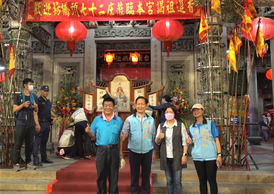 縣府支持並保存文化民俗活動,彰化縣無形文化資產「社頭枋橋頭七十二庄迓媽祖」,5/18晚間9時在鹿港天后宮,由縣長王惠美與各庄庄頭及地方仕紳等人一起進行媽祖祝壽儀典,並接續舉行「交香」儀式,大總理以及執事人員跪在公桌上擲筊求得聖筊後,把香交給鹿港天后宮的執事人員,來象徵完成今年的迓媽祖活動。 5/18下午3時則由縣府參議柯呈枋代表縣長王惠美與枋橋頭各庄庄頭代表,在鹿港福鹿橋與鹿港天后宮接駕隊伍會合並舉行接駕儀式,展現地方性特殊民俗文化活動。 枋橋頭迓媽祖現在已改為每隔十年連續進香三年,逢零即進香第一年,去年因疫情停辦,今年民國112年是第二年舉行謁祖進香活動,明年是第三年。「枋橋頭七十二庄迓媽祖」民俗活動,涵蓋南投、彰化兩縣市,跨越九個鄉鎮共兩百多個村里,繞境陣仗浩大,並謁祖進香時間為農曆3月30日至農曆4月1日,橫跨兩個月份,故又稱「跨兩月」。 社頭枋橋頭天門宮設立於1755年,枋橋頭街古時候是交易場所,當時各角頭沒有建廟,因此由八個大角頭各自雕一尊媽祖神像,供奉於社頭鄉枋橋頭天門宮內地方遇有慶典時,則各自恭請媽祖回庄祭祀,事後再請回枋橋頭天門宮,表現「七十二庄迓媽祖」之獨特在地文化景象。 枋橋頭七十二庄是一個超越族群、聚落、地域的連庄組織,透過對媽祖的祭祀信仰,將不同族群的人組織起來。縣府致力保存傳統特色文化,「社頭枋橋頭七十二庄迓媽祖」民俗活動,於民國103年登錄縣級民俗類無形文化資產,沿襲兩三百年傳統,發揮聯庄組織團結自主的精神,表現出地方具規模性獨特民俗活動,未來將持續進行文化保存上的支持與協助。 祝壽與會貴賓有縣議員鄭俊雄、鹿港天后宮副主委蔡平焜、枋橋頭七十二庄大總理康素珠、枋橋頭天門宮主委劉清尊、文化局長張雀芬、縣府秘書王錦銓地方仕紳及各級民意代表等。 接駕與會貴賓還有縣議員鄭俊雄、縣議員蕭妤亘、社頭鄉長蕭浚二、鹿港天后宮主委張偉東、枋橋頭七十二庄大總理康素珠、枋橋頭天門宮主委劉清尊、文化局副局長吳文昇、縣府秘書王錦銓、地方仕紳及各級民意代表等。