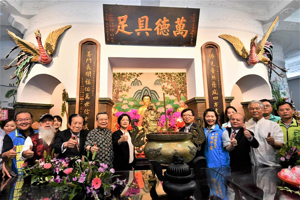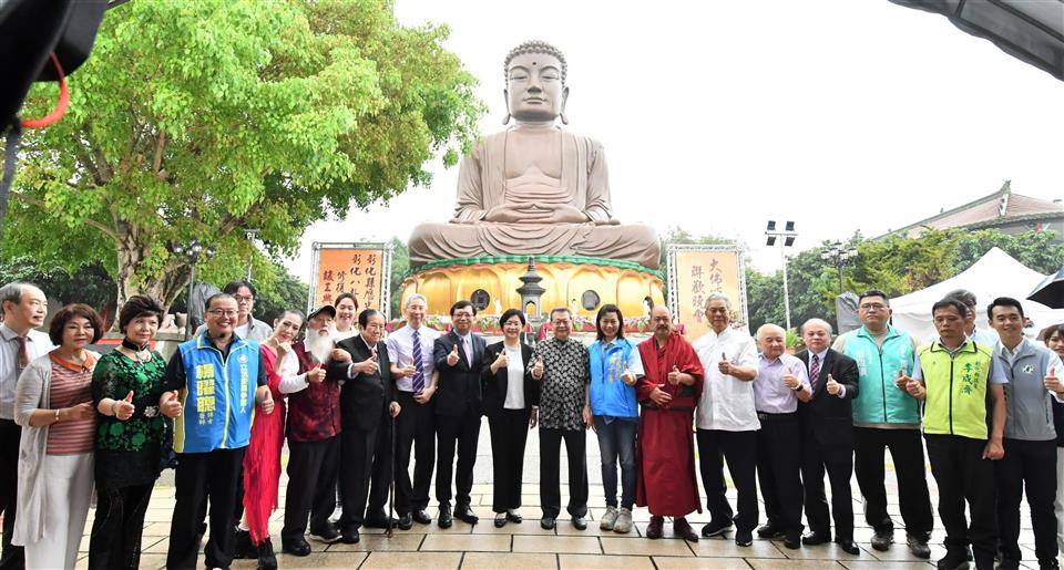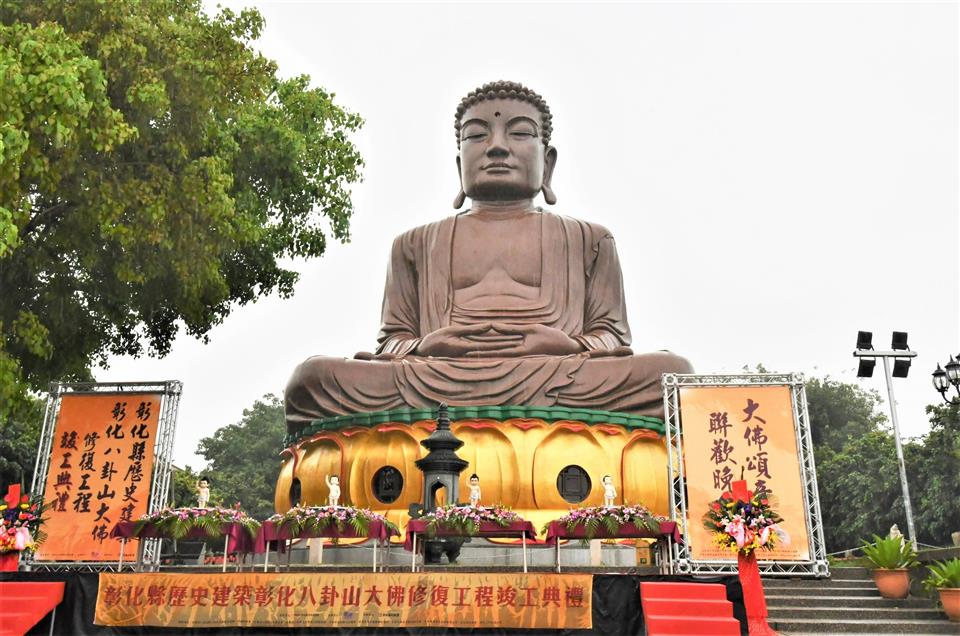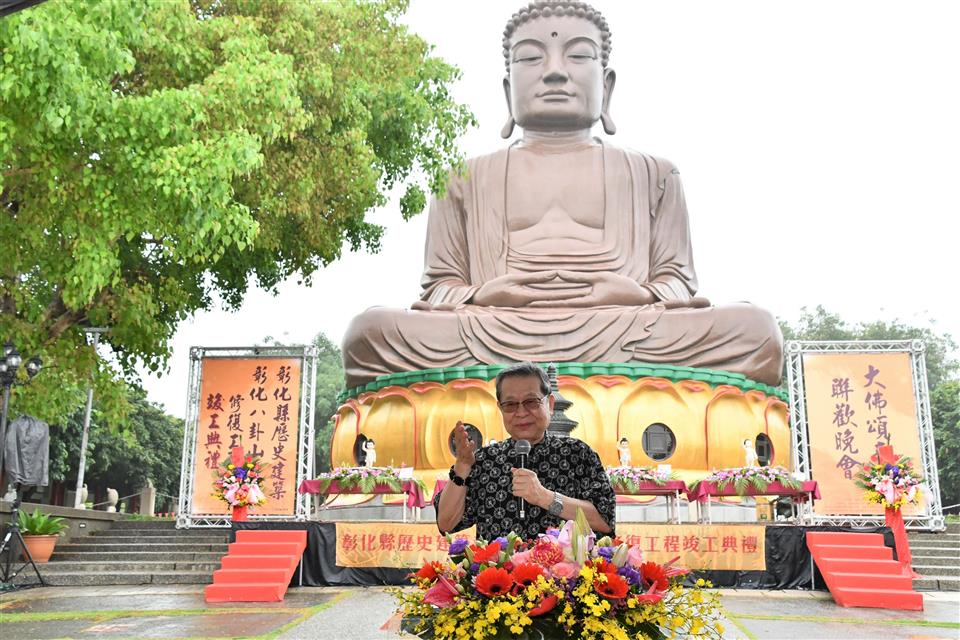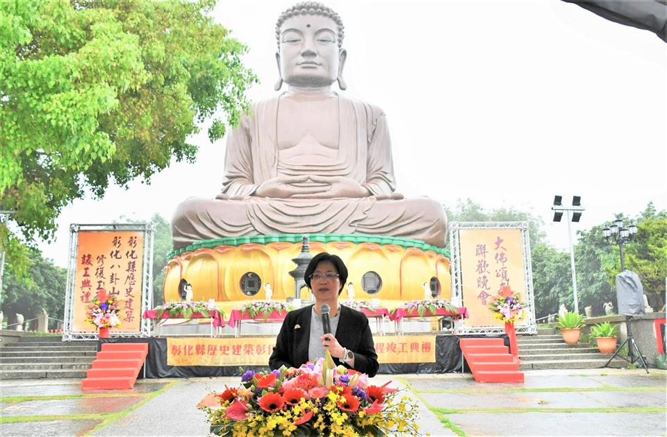 彰化縣政府積極推動文化資產修復有成,完成彰化縣最重要的精神地標「八卦山大佛」的修復,八卦山大佛自蓮花座至佛身,計有七丈二尺高,曾是東亞第一大佛,為台灣歷史建築百景之一,八卦山也是彰化八景之首,彰化縣文化局特選在慶祝佛教創始人釋迦牟尼佛誕生的日子浴佛節,今(26)日(農曆4月8日)上午辦理「彰化縣歷史建築彰化八卦山大佛修復工程竣工典禮」,縣長王惠美、文化部常務次長李連權、財團法人八卦山大佛風景協會董事長張世良與各級民代、熱情鄉親、嘉賓雲集,一起出席見證竣工典禮這歷史的一刻,王縣長表示,在建縣300年,又是浴佛節,天空也下起一些雨,與大家一起見證歷經一甲子的「八卦山大佛」修復完竣,讓這個台灣歷史建築百景之一,重現風華,倍具意義也相當殊勝,不僅成為彰化縣文化資產歷史建築修復的亮點,也讓這個有大家共同記憶的彰化守護神,持續守護、陪伴彰化縣民。 王縣長表示,特別感謝文化部文資局補助經費挹注,還有為修復八卦山大佛而努力的匠師們,八卦山大佛在民國50年落成,當時還有東亞第一大佛的稱號,在民國91年登錄為彰化歷史建築,經過這些年的風吹雨打,造成大佛表面受損嚴重以及內部滲水問題,縣府為修復大佛,在民國108年向文化部爭取總經費達3,100萬元,其中文資局補助2,635萬元,感謝縣議會議員們的支持預算,縣府經費465萬元。但工程在發包後,經過9次流標,終於在109年招標成功,之後又因施工的方式等問題導致工程延宕,一直到民國110年才重新招標,並在今(112)年修復完成,可以說大佛的修復工程真的是相當困難。 王縣長指出,一座城市的偉大,不在於建築的高度,而是藝文發展的深度,彰化縣歷史悠久,300年來擁有豐富的歷史人文,相信在修復完工之後,不僅具宗教信仰、歷史建築,未來結合八卦山整體觀光,與八卦山下的中興莊、扇形車庫等地方串連,形成一條兼具歷史人文及觀光休憩的旅遊步道,帶動彰化觀光,讓大家看到彰化的歷史人文的深度,且在「八卦山大佛」的守護下,風調雨順、國泰民安、闔家平安,讓八卦山的風華再現。 文化部常務次長李連權表示,今天彰化三喜臨門,一是建縣300年、二是修復完成、三是浴佛節,可說是三喜臨門,八卦山大佛是彰化人心中的記憶,不僅是彰化的守護神,也是台灣的守護神,每次他順路經過彰化,都會前來八卦山參拜大佛,每每前往日本鎌倉參拜阿彌陀佛像時,也都會想到彰化的八卦山的釋迦牟尼佛,八卦山大佛對於台灣是非常重要的文化資產,也是很多人共同的記憶,剛剛也看到有些內部要再補強的地方,文化部將全力支持八卦山大佛後續的內部修繕工程。感謝王惠美縣長縣府團隊的努力,將八卦山大佛修復完成,讓彰化鄉親幸福平安。 八卦山大佛風景協會董事長張世良表示,他每天都來禮佛,八卦山大佛從民國45年動工興建,但因逢八七水災被迫停工,後於民國50年五月竣工,落成之後馬上成為彰化重要地標,當時他只是一位初中生,而且就居住在山下,目睹87水災的發生心中更是感慨萬千,非常感謝文化部與縣府,將大佛列為歷史建築,禮佛最重要就是保佑整個台灣有風無颱,有雨無災,大佛是大家的,歡迎大家天天都來八卦山,這裡的環境清幽,空氣清新、風景美,位在城市中,交通方便,很少有這麼好的地方,歡迎大家有空來走走。 文化局表示,文化資產是見證先民的科學與藝術結晶,保存技術更是文化資產修復重要的環節,彰化八卦山大佛修復工程的修復團隊包括泥作的黃盈盛、油漆彩繪的陳重光、施工架馬啟晃匠師。黃盈盛匠師曾修復新北市定古蹟板橋迪毅堂、彰化縣歷史建築鹿港十宜樓;陳重光匠師亦曾修復彰化縣定古蹟鹿港金門舘、員林興賢書院,而本次協助搭設施工架的團隊馬啟晃與其父馬肇嘉,更是父子都曾搭設八卦山大佛不同時期修復工程的施工架,此等經驗更難能可貴,本次工程確實透過匠師的職人精神努力,再賦予歷史建築新生命。 與會人員有文化部常務次長李連權、縣議員黃千宴、莊陞漢、李成濟、許雅琳、葉永清、楊子賢、立委黃秀芳服務團隊、縣議員黃柏瑜服務團隊、參山國家風景管理處主任曾森裕、彰化縣文化局長張雀芬、縣府新聞處長李俊德、民政處長賴致富、城觀處長王瑩琦、建國科技大學董事長吳聯星、校長江金山、副校長林文雄、聯興國小校長柯文吉、彰化縣榮民服務處長楊雨榮、中華國際嘎檔巴活教總會理事長慧吉祥大活佛、東亞藝術協會理事長王美美、中華大漢書藝協會理事長周忻恩、大葉大學主任秘書侯雪娟、詩人書法家盧逸儒、福山二會楊春梅、北方分會柯麗華、葉羽晨、佛光山住持妙育法師、一銀彰化分行陳明珠、各宗教界代表、各級民代與地方仕紳等。