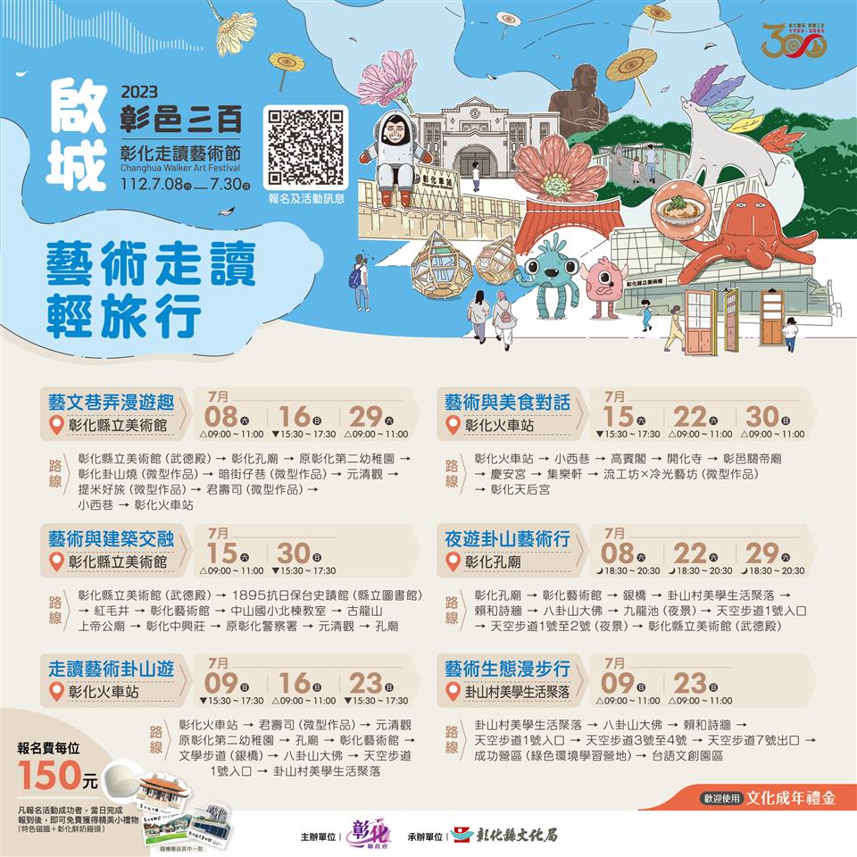 彰化縣文化局於7月8日至7月30日辦理「啟城.彰邑三百-2023彰化走讀藝術節」,並於每周六、日推出「藝術走讀輕旅行」,共6條路線、16場次,5月29日起開放線上報名!2023適逢彰化榮光建縣300年,邀請您一起開啟城市空間,啟程百年彰化,在起步之間,探索彰化建縣三百年的城市記憶與耐人尋味的故事,及藝術與城市空間的對話,走讀一日的魅力彰化。 「啟城.彰邑三百-2023彰化走讀藝術節」於彰化火車站、彰化中興莊、彰化孔子廟、彰化縣立美術館、彰化藝術館、銀橋、九龍池上方廣場及天空步道等地點設置8件藝術裝置,更首次邀請藝文店家加入微型空間創作計畫,媒合藝術家與藝文店家空間共創微型藝術作品。藝術走讀路線除戶外裝置藝術作品及微型藝術作品外,另規劃古蹟及歷史建築等富含在地文化巡禮的藝術走讀行程,獨具藝文特色,邀請大家「藝」同參與。 路線分別有「藝文巷弄漫遊趣」、「藝術與建築交融」、「走讀藝術卦山遊」、「藝術與美食對話」、「藝術生態漫步行」及「夜遊卦山藝術行」等6條主路線,有穿梭在巷弄街道間尋讀藝術作品的漫遊樂趣路線「藝文巷弄漫遊趣」、有跨清朝、日治及當代等建築與藝術路線「藝術與建築交融」、有以濃厚藝術作品為主「走讀藝術卦山遊」路線、有藝術與彰化特色美食文化共響之「藝術與美食對話」路線、有城市之外與自然生態接近的「藝術生態漫步行」路線,更有不同以往型態,帶領民眾漫走至八卦山大佛俯瞰彰化城夜景的「夜遊卦山藝術行」路線,每條路線以藝術融入在地文化、建築、美食及生態等精心規劃,歡迎您「藝」同參與彰化榮光建縣300年,於漫步間啟開彰化城市魅力一日遊。 報名請至彰化縣文化局活動網站(https://pse.is/4z663q),每位報名費150元,活動當日並可獲得精美小物(特色磁鐵及彰化鮮奶饅頭),彰化縣文化局邀請您踴躍報名參加,「藝」同出發!看古蹟、賞藝術、吃美食,啟城走讀GO!