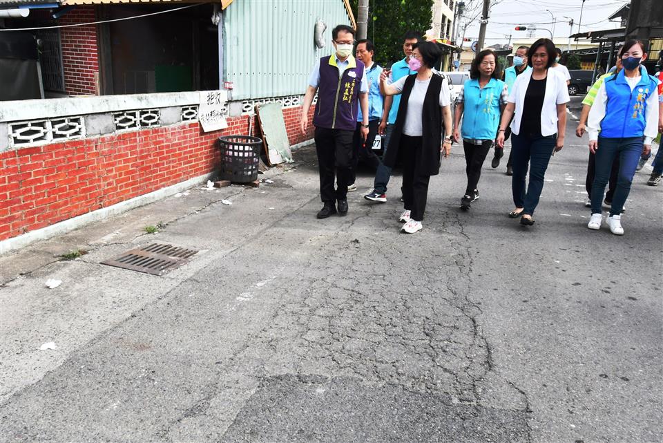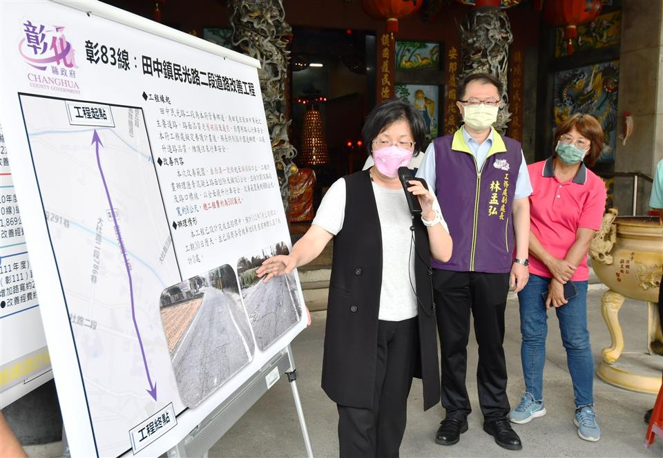彰化縣長王惠美今(30)日前往田中鎮視察民光路二段(彰83線)道路不平。民光路二段為田尾往來田中的主要道路,現況路面年久老舊破損、龜裂補丁,影響用路人行車安全。為維護往來行車安全,縣府將投入500萬元辦理改善工程。王縣長感謝議長謝典林及議員們對於預算的支持,讓縣府有足夠的經費完成更多地方基礎建設,也感謝地方各級民意代表的反映,大家共同努力,讓地方更進步,希望工程如期如質,儘速全面完成改善,讓鄉親出入更加安全。 王縣長表示,這次視察的民光路二段是連結田尾及田中的主要道路,已有10多年沒有改善路面,路面標線也已模糊不清,影響行車安全,這次工程改善經費500萬元,路面改善長度900公尺,寬約8公尺,工程改善範圍自西溝一號橋(八堡二圳西溝)至埔頭路口(第七公墓)止,除了進行路面改善,並重新檢視交通標誌標線,全面提升行車及路口交通安全,且與各管線單位協調人孔蓋下地作業,希望早日完成,改善路面,行的更安全。 與會關心人員還有縣議員鄭俊雄、蕭妤亘、田中鎮長蕭淑芬、縣議員許書維服務團隊、縣政顧問卓有德、陳首閩、代表彭世和、葉賞、大社里里長陳建市、工務處副處長林孟弘、各級民意代表與地方仕紳等。