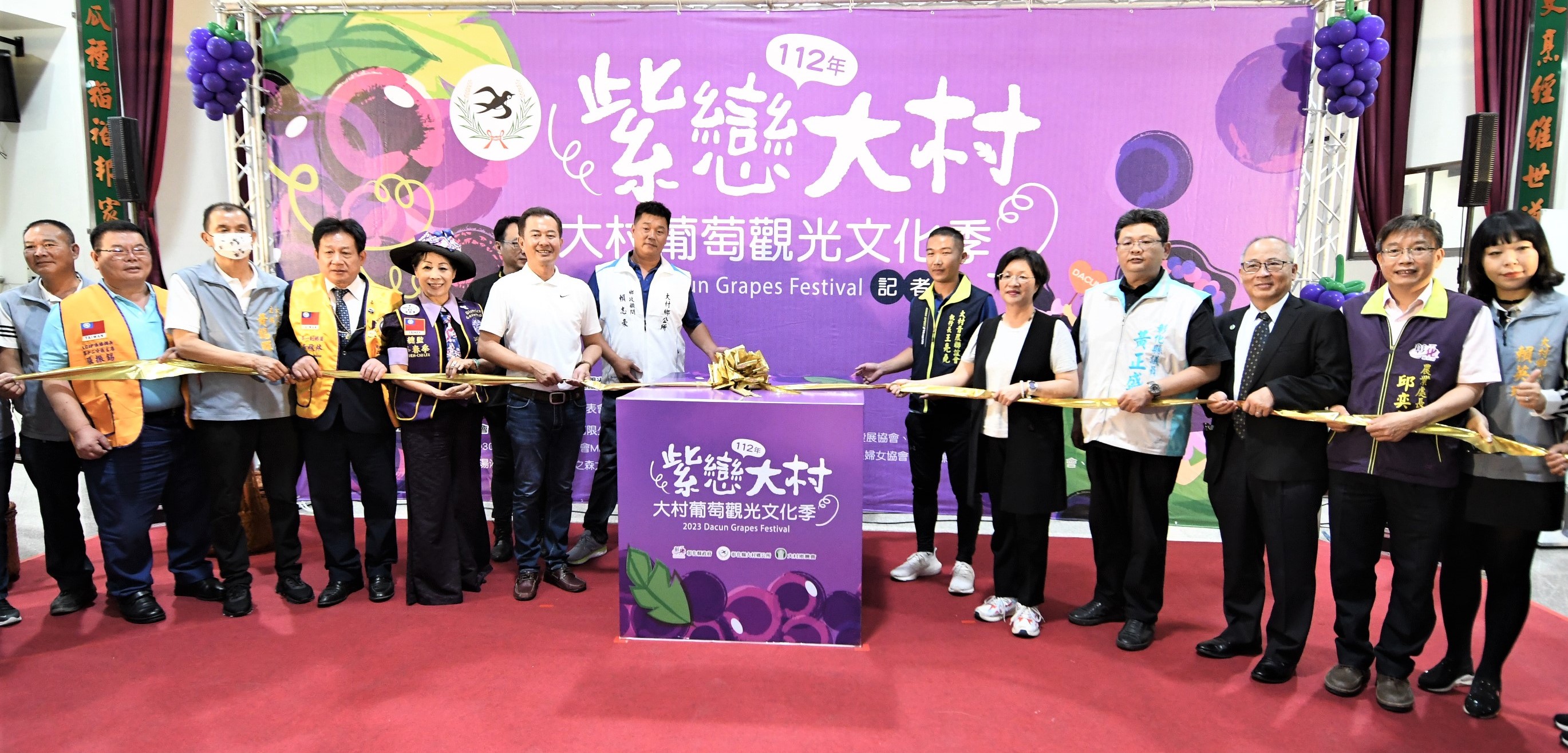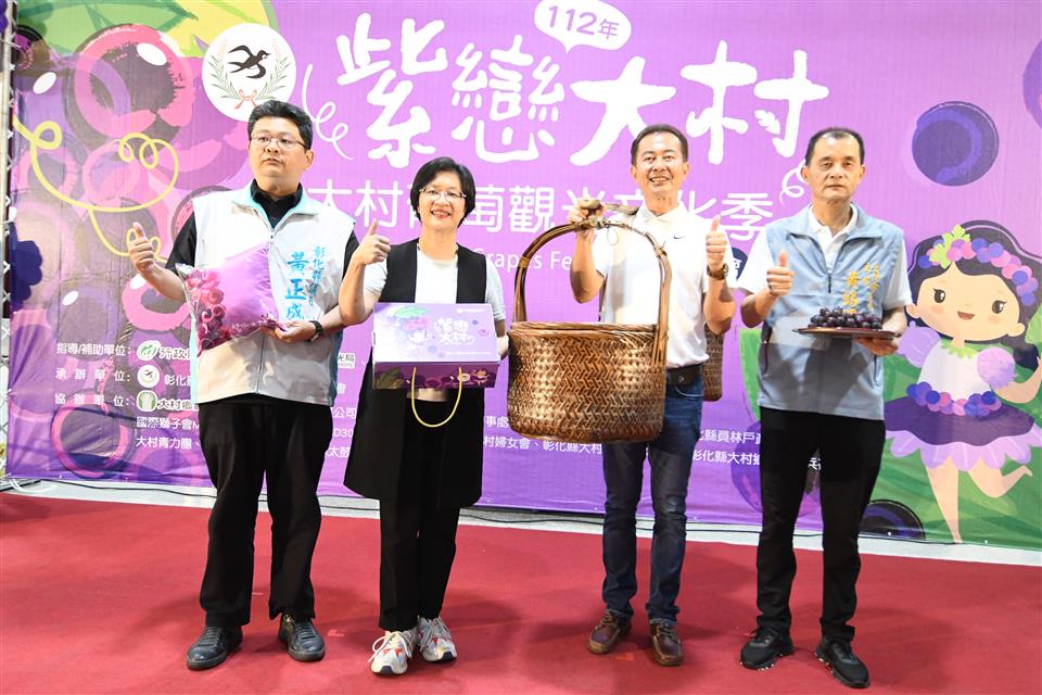 由彰化縣大村鄉公所主辦於今(30)日上午在大村鄉公所舉辦「112年紫戀大村-大村葡萄觀光文化季」宣傳記者會,彰化縣長王惠美應邀出席,大村鄉長賴志銘等人與會,共同邀請全國鄉親一起來參與,王縣長表示,一連2周,舉辦葡萄行銷相關活動,大村鄉公所辦理首屆的紫戀大村-大村葡萄觀光文化季,於6月10日下午3時起在大葉大學門口西南側校地,再隔一週,大村鄉農會在6月18日在大村火車站(後站)廣場辦理大村葡萄產業推廣行銷活動,歡迎大家來採買彰化最優質的葡萄、吃著由葡萄入菜的割稻飯饗宴,欣賞好聽的金曲音樂,王縣長表示,平均每2顆葡萄就有1顆來自彰化,每年5-8月是葡萄成熟時,這裡的葡萄Q彈有勁,好吃又甜,歡迎大家多來訂葡萄、吃葡萄。 王縣長表示,大村鄉長就任後一直思考如何將大村行銷出去,公所首次辦理這次的活動,6月10日在大葉大學,除了行銷葡萄之外,也結合在地產業行銷自行車,並請來影歌星、親子兒童劇,可以說相當熱鬧,同時還有好吃的割稻飯,歡迎大家共襄盛舉。另外,也特別感謝大村鄉農會長期以來的用心及努力,接續在6月18日在大村火車站(後站)廣場辦理大村葡萄產業推廣行銷活動,全台種植葡萄面積約2,328公頃,彰化縣的種植面積佔了1,149公頃,大村約有450公頃都是在種植葡萄,歡迎大家多多採買彰化好吃的葡萄。 大村鄉長賴志銘表示,大村鄉種植葡萄面積達450公頃,大村葡萄十分香甜好吃,為了宣傳大村好吃的巨峰葡萄,增加農民的收益並推廣大村的觀光,將在6月10日下午3點在大葉大學辦理大村葡萄觀光文化季。這場活動是產官學的共同合作,與在地企業美利達公司合作,進行車遊大村、田園巡禮活動,使民眾能夠了解大村的田園風光,另外也與大葉大學餐旅管理學系做出葡萄特色風味餐,並以割稻飯的方式來呈現,讓民眾能在初夏的草地上,一邊聽葡萄巨星演唱會,一邊享受葡萄特色風味餐,歡迎家長帶著孩子來參加本次活動。 「大村葡萄觀光文化季」,現場邀請金曲歌王翁立友獻唱,還有小朋友最愛的親子氣墊跟小青蛙劇團,以及結合彰化在地優質農友和美食攤販的優質農產文創市集,更有最具在地特色的葡萄風味餐,在「地上」享受「在地」風味,更不能錯過活動當天的葡萄禮盒拍賣會,最後還有摸彩抽電視機等多項大獎,活動相當精采,彰化大村要用最熱情的表演、最好聽的歌聲、吸引人潮,推銷大村優質的葡萄。 與會貴賓有彰化縣議員黃正盛、大村鄉長賴志銘、大村鄉民代表會主席黃錫暉、副主席陳珮琳、大村鄉公所主任秘書陳東松暨全體一級主管、彰化縣政府農業處長邱奕志、MD300-D3國際獅子會2022-2023現任總監李春季、MD300-D5國際獅子會2023-2024當選總監黃秋林、縣政顧問賴國安、縣府秘書黃智裕、各級民意代表與地方仕紳等。