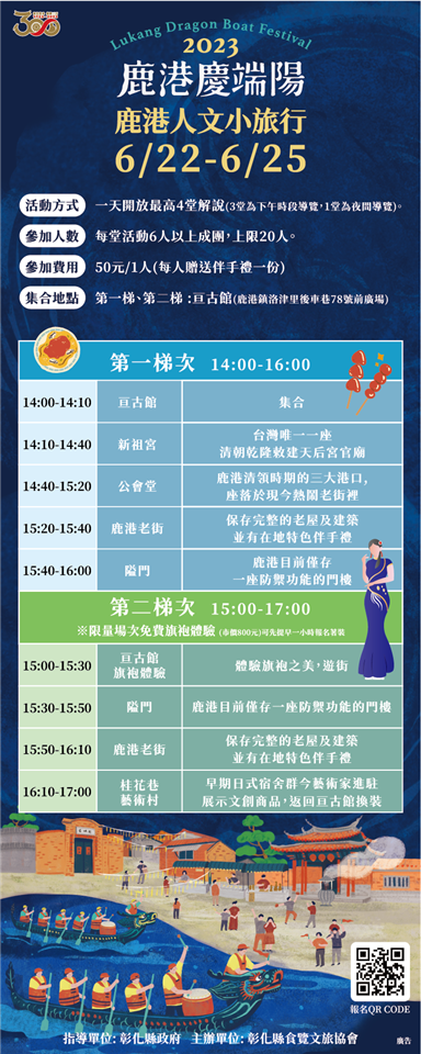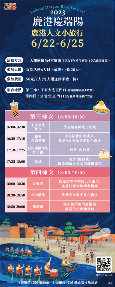 延續近半個世紀的「鹿港慶端陽」活動,正式揭開序幕。今(13)日上午,彰化縣政府在縣府一樓中庭舉辦「2023鹿港慶端陽」宣傳記者會,縣府攜手鹿港鎮公所、福興鄉公所、龍舟委員會、各大觀光工廠、在地宮廟及民間社團籌備了豐富的系列活動。除了因疫情睽違三年的「國際龍舟錦標賽」夜間龍舟今年重磅回歸之外,也有「柴語錄」旗下超人氣角色們在「鹿港小鎮光影藝術節」陪伴大家,「鹿港溪河岸綠地音樂會」、「鹿港人文小旅行」、「魯班公宴」、「萬粽矚目嘉年華」等更多有趣活動都在「2023鹿港慶端陽」,歡迎全台民眾前來彰化參加最精彩的端午慶典! 王縣長表示,「鹿港慶端陽」延續已將近半個世紀,為了讓民眾更加瞭解微笑之鄉鹿港經典小鎮,傳承發揚端午文化內涵,縣府與公所、各文教基金會、地方宮廟通力合作,規劃一系列豐富的活動,打造全台最精彩的端午慶典,過去三年因為疫情關係而縮小規模或停辦,今年重磅回歸,在福鹿溪辦理夜間龍舟賽,相信精彩連連,也將邀請國際友人前來共襄盛舉,歡迎全國民眾6/22到6/24前來觀賽,為選手們加油。 王縣長指出,鹿港是個開放式的博物館,處處都是驚喜,且CP值最高,白天可以探訪鹿港老街,在公會堂前品嘗鹿港特有的「煎堆」並欣賞表演,在文武廟體驗傳統遊戲「葫蘆問」與「升官圖」,到桂花巷藝術村可以參加藝術DIY與選購道地伴手禮,到龍山寺聆聽悠揚的南北管,或到勞動學苑欣賞「魯班公宴」超過500件大師工藝品,並可搭乘彰濱觀光工廠線接駁專車,前往各具特色的卷木森活館、白蘭氏健康博物館、台灣玻璃館及緞帶王觀光工廠。到了晚上,「鹿港小鎮光影藝術節」點亮中山路、公會堂、老街、桂花巷藝術村與鹿港溪畔,可愛的「柴語錄」也將陪伴大家穿梭鹿港,主角「廢柴」、柯基「阿吉」與灰貓「太子」在鹿港溪一同划龍舟的場景更是期間限定,搭配著「鹿港溪河岸綠地音樂會」,滿足視覺與聽覺的雙重饗宴。 王縣長表示,五月五,慶端午,我們以傳統書寫鹿港日常,用傳承,彰顯節慶風采。端午連假,誠摯邀您來彰化多住幾晚,除了鹿港之外,也可以到全台最大開放式花園的田尾公路花園賞花、全國葡萄酒莊密度最高的二林品酒、擁有台灣最廣潮間帶的芳苑賞鳥觀潮,以及景色宜人的八卦山139縣道感受自然地貌。彰化很有料,希望大家來發掘這裡的美好,與我們一起共度最與「粽」不同的端午佳節。 王縣長指出,為了讓民眾能深入認識這美麗的古鎮,縣府舉辦「鹿港人文小旅行」帶您遊歷富有文化底蘊的鹿港小鎮,走訪過往騷人墨客吟詠詩卷的場所,賞析傳統建築藝術之美;並推出端午節限定的集戳章換贈品活動,暢遊鹿港的同時,別忘了加入「愛玩彰化」LINE官方帳號,線上參加慶端陽集章活動;或到彰化縣旅遊服務中心索取「集章單」,以獲得限量的典藏周邊產品。 彰化縣龍舟委員會主委凃淑媚議員透過視訊表示,歡迎全國鄉親6/22~6/24下午3點至晚上8點30分來福鹿溪看龍舟賽,如果您無法來到現場觀賽,也可以透過民視新聞網觀看精彩賽事,6/22端午節當天也是龍舟賽開幕式,活動十分精采熱鬧,邀請多位藝人團體與鄉親一同慶端陽。 建縣300年的彰化,過去曾有鹿港「千帆入港」的盛況,現在則有「國際龍舟錦標賽」的百家爭鳴,此賽事為中部歷史最悠久的賽事,98支隊伍乘風逐浪爭取最高榮耀,預期可恢復疫情前每年上萬人潮觀賽的盛況,創造可觀的夜間經濟。更多「2023鹿港慶端陽」活動資訊,請至「彰化縣旅遊資訊網」網站查詢 https://tourism.chcg.gov.tw/,隨時關注最新消息! 與會貴賓還有縣議員温芝樺、郭燕陵、黃千宴、陳玉姬、藍駿宇、交通部觀光局參山國家風景區管理處副處長湯維堯、彰化縣體育會龍舟委員會總幹事徐文男、朝陽鹿港協會理事長林新發、人間國寶施鎮洋、彰化縣旅遊產業協會理事長黃昱哲、彰化縣旅遊商業同業公會理事長謝榮聰、彰化縣民宿協會理事長許健泰、彰化縣觀光產業發展促進協會秘書長徐玉玲、台明將台灣玻璃館副董事長林肇騫、台灣優格餅乾學院經理吳珮淳、白蘭氏健康博物館長余惠芬、緞帶王觀光工廠專員林東宏、地藏王廟管理委員會總幹事林慧娟、鹿港竹圍仔順天府管理委員會主委黃一彬、鹿港老街商圈理事長魏秀娟、鹿港鎮公所文化所長王廷揚、福興鄉農會總幹事林坤宏、縣府新聞處長李俊德、城市暨觀光發展處長王瑩琦、教育處長蔡金田、財政處長劉坤松、建設處長劉玉平、勞工處長何俊昇、地政處長蔡和昌、行政處長吳蘭梅、人事處長高上富、彰化縣地方稅務局長陳燕慧、經濟暨綠能發展處副處長蕭麗玲、彰化縣文化局副局長吳文昇、縣政顧問洪文能、西勢國小校長劉淑甄、各級民意代表與地方仕紳等人。