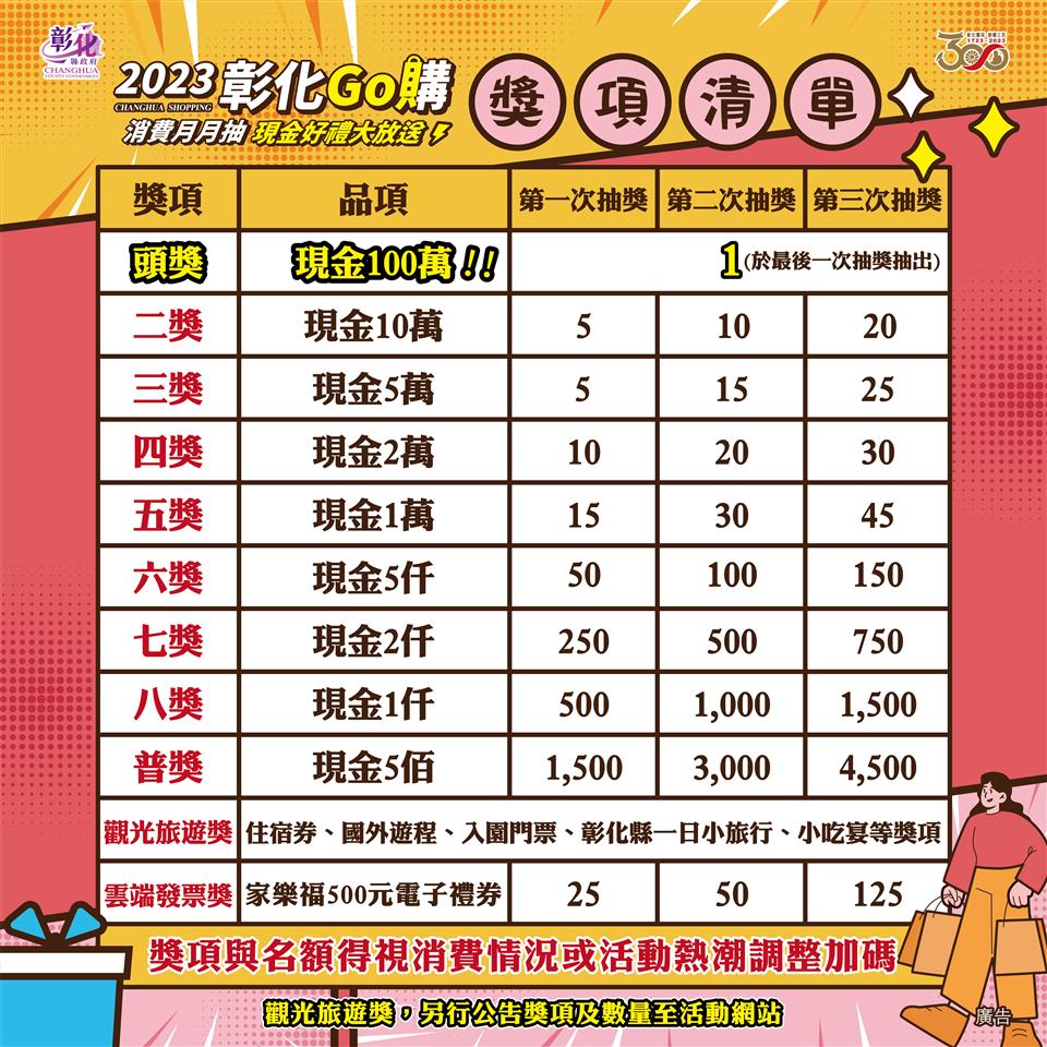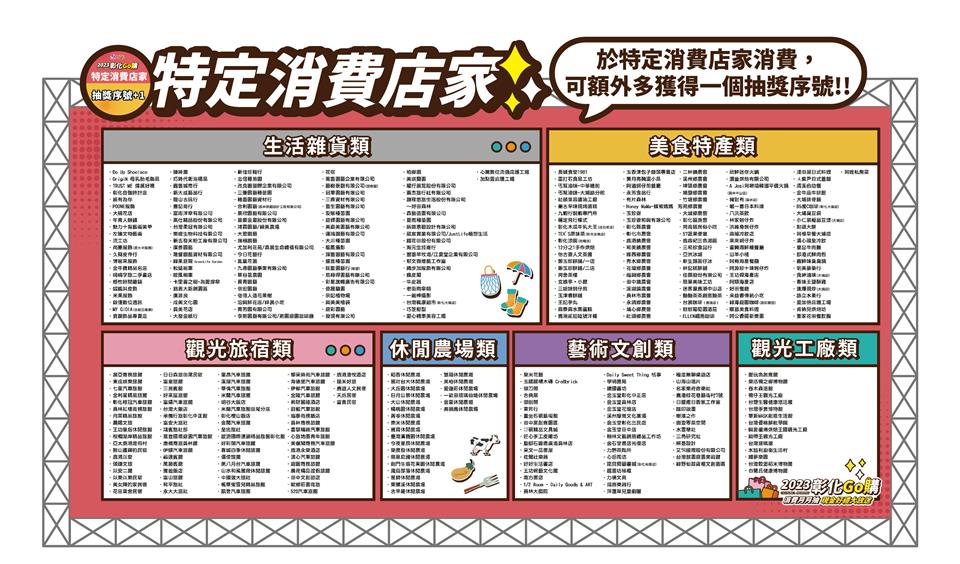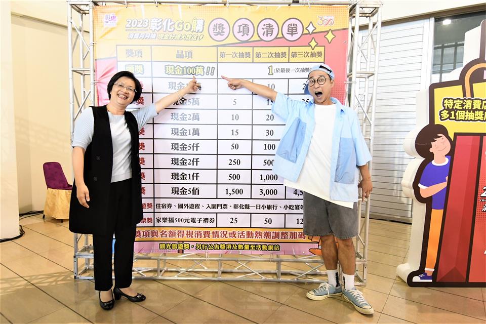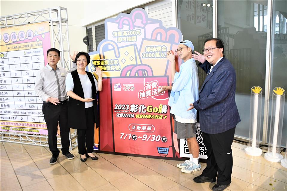 刺激經濟、帶動消費、振興產業,彰化縣政府準備好了!縣長王惠美今(21)日於縣府中庭召開記者會,邀請也是彰化子弟藝人浩子回鄉代言,王縣長表示,為刺激市場經濟,帶動後疫情時代的民眾消費及慶祝彰化建縣300年,這次以「2023彰化GO購」抽獎活動打頭陣,7月1日正式啟動,活動持續到9月30日,歡迎全國民眾來彰化縣消費滿200元,就可參加抽獎活動,消費月月抽,現金好禮大放送,最大獎頭獎100萬元,還有總價值超過2,000萬元現金獎等,邀請全國親鄉與好朋友,好買好吃好住好用好𨑨迌,全都在彰化。 王縣長表示,後疫情時代,大家一起來拚經濟!最近,不只是物價上漲,店家也感受到整體消費力道的衰退,因此縣府拋磚引玉,整合彰化各商家資源,分別有生活雜貨、美食特產、觀光旅宿、藝術文創、休閒農場與觀光工廠等六大類別業者參加,總共超過200家業者祭出85折到95折不等的優惠,優惠折扣到年底,舉辦「2023彰化GO購」消費抽獎活動,希望讓民眾消費的更加值,也同時刺激經濟,讓商家能有更好的銷售業績,只要憑7月至9月稅籍登記在彰化縣業者的發票或收據,消費滿200元以上,登錄活動網站,就有機會抽中頭獎100萬元現金,另外更有總價值超過2,000萬元以上現金獎、觀光旅遊獎與加碼雲端發票獎,總獎項超過1萬4千個;另外在「特定消費店家」消費,又能再多一個抽獎序號,歡迎全國民眾來彰化消費。 王縣長說,這次獎項非常豐富,除有價值超過2千萬元現金獎外,另觀光旅遊業也熱情參與,包括員林紅樓商旅等10家旅館住宿券、本縣(田尾、鹿港、二林、秀水)小旅行、鹿港小吃宴、台版兼六園「成美文化園」、大小朋友最愛的「百果山探索樂園」,以及時下最夯的國外(港澳、土耳其)遊程及名勝世界郵輪香港行程等觀光旅遊獎。縣府推出彰化金好禮甄選與宣傳計畫,徵件到7月底。「2023彰化GO購」活動,祭出「特定消費店家折扣」、「觀光工廠嘉年華」、「彰化金好禮甄選與宣傳」、「旅行社引客」、「彰化一甲子老店甄選與行銷活動」與「商圈行銷活動」等系列促銷活動,另外,只要買公益團體商品,除了愛心消費還可以參加抽獎,歡迎民眾捐款做公益。 經濟暨綠能發展處表示,為鼓勵大家註冊會員時綁定手機條碼索取雲端發票,再加碼抽「雲端發票獎」,大家還等什麼,趕快拿出手機註冊為會員吧!本次活動發票/收據消費時間為112年7月1日(六)00:00起至112年9月30日(六)23:59止,發票/收據登錄期限則延長至112年10月10日(二)23:59止。每張發票/收據限登錄1次,每張最高取得10個抽獎序號,相關刺激經濟計畫及抽獎活動查詢或活動辦法,請搜尋「2023彰化GO購」活動網站查詢。 與會貴賓有彰化縣縣議員温芝樺、葉永清、白玉如、凃淑媚、陳玉姬、林茂明、彰化商業會副理事長楊曜聰、彰化縣總工會秘書長温宗諭、彰化縣旅遊產業協會理事長黃昱哲、彰縣產業觀光發展促進協會陳麗蘭、彰化縣旅遊商業同業公會理事長謝榮聰、彰化縣民宿協會理事長許健泰、彰化縣創意美育協會理事長賴欣儀、樂農發休閒農場負責人許宏賓、菁芩休閒農場負責人鄭俊達、稻香休閒農場副場長陳宥仁、奈米休閒農場負責人黃錫瑋、金龍永盛旅行社股份有限公司總經理楊琮霖、雅頓國際時尚造型總經理陳錫東、彰化福泰商務飯店副總經理嚴公誠、彰化縣二林西斗農村產業發展促進協會理事長陳蜂、緞帶王觀光工廠理事長吳世長、台灣優格餅乾學院總經理吳睿麒、卷木森活館總監黃昱哲、彰化縣田尾公路花園協會理事長劉漢欽、彰化縣鹿港老街發展促進會理事長魏秀娟、彰化縣彰化市永樂商圈發展協會理事長鍾正軒、彰化縣彰化市大埔商圈發展協會總幹事洪其明、彰化縣農會總幹事張建豐、大城鄉農會總幹事蔡南輝、溪湖鎮農會總幹事陳金源、芬園鄉農會總幹事黃翊愷、財團法人天主教會台中教區附設彰化縣私立聖智啟智中心主任侯秀玲、財團法人天主教會台中教區附設彰化縣私立聖家啟智中心主任柯鈴姿、財團法人天主教會台中教區附設彰化縣私立慈愛教養院長張明正、財團法人基督教瑪喜樂社會福利基金會執行長林玉嫦、社團法人彰化縣喜樂小兒麻痺關懷協會公關吳依芹、社團法人彰化縣脊髓損傷重建協會執行長江信行、華山基金會彰化縣站長黃玉芬、財團法人人安社會福利慈善事業基金會彰化平安站長游山河、家扶中心主任王震光、社團法人彰化縣生命線協會理事長王冠君、卦山村主委許瀞宜、彰化縣直立板運動協會理事長向章緯、成美文化園區經理蔡惠芳、彰化縣姐妹會創會長洪惠敏、縣政顧問洪文能、縣府經濟暨綠能發展處湯國榮、城觀處長王瑩琦、社會處長王蘭心、農業處長邱奕志、地方稅務局長陳燕慧、青發處長黃金樺、文化局副局長吳文昇、各級民意代表與地方仕紳等。 2023彰化GO購活動網站: https://changhua-go.chcg.gov.tw/