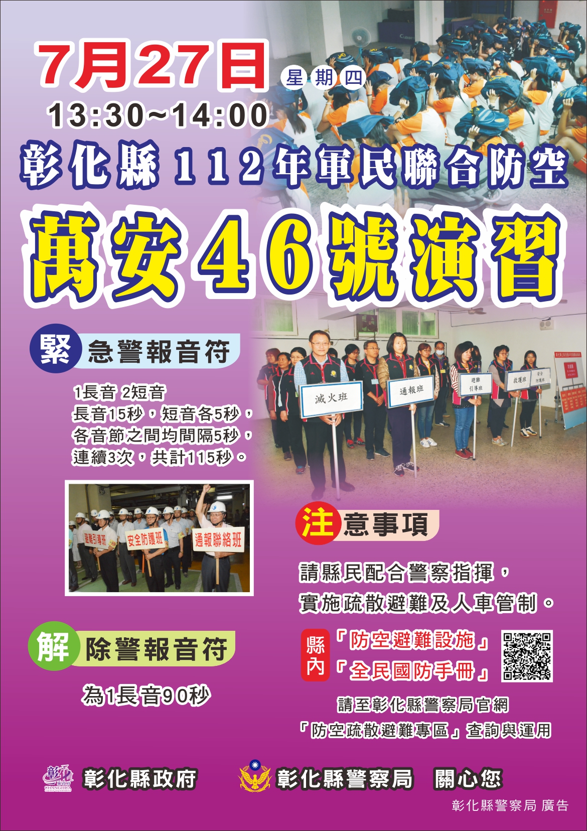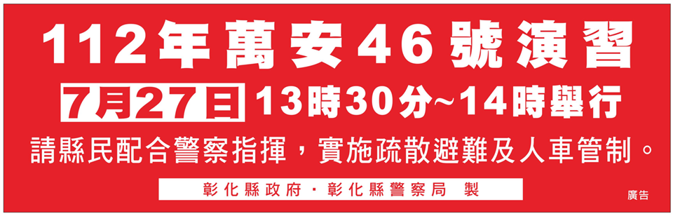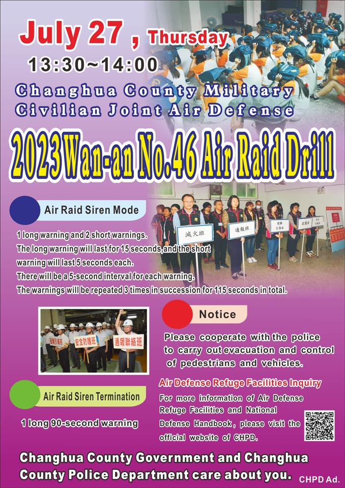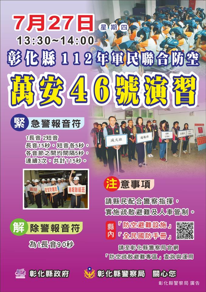 彰化縣「112年軍民聯合防空(萬安46號)演習」訂於112年7月27日(星期四)13時30分至14時,實施30分鐘「警報傳遞與發放」、「疏散避難」、「交通管制」及「其他必要管制(關閉門窗、熄滅燈火)」等實作演練,並於同日14時至14時30分(防空警報解除後),實施30分鐘「戰災搶救(災害救援)」及「戰時災民收容救濟站開設演練」,以強化各項防空整備與作為。 縣內「防空疏散避難設施」應配合設置防空避難「標示牌」,防空警報發放後,所有「行人」、「車輛」均須接受「警察」及「協勤民力」指揮,實施「車停,人就近疏散」,實際進入防空疏散避難設施,若縣民周遭無適合防空疏散避難設施,則可利用地形地物、涵洞、地下道或橋墩下方,具掩蔽功能之地點進行就地避難。 演習期間,團體或民眾若未依民防法第21條、防空演習實施辦法第12條規定,配合「防空疏散避難設施開放民眾進入」及「車停,人就近疏散」等管制及演練,先以勸導方式,勸導後仍未配合者,將依民防法第25條裁處新臺幣3萬元以上、15萬元以下罰鍰。 本縣已於「彰化縣警察局資訊網」建置「防空避難專區」,提供縣民查詢縣內「防空疏散避難設施」及「全民國防手冊」,請多加利用。