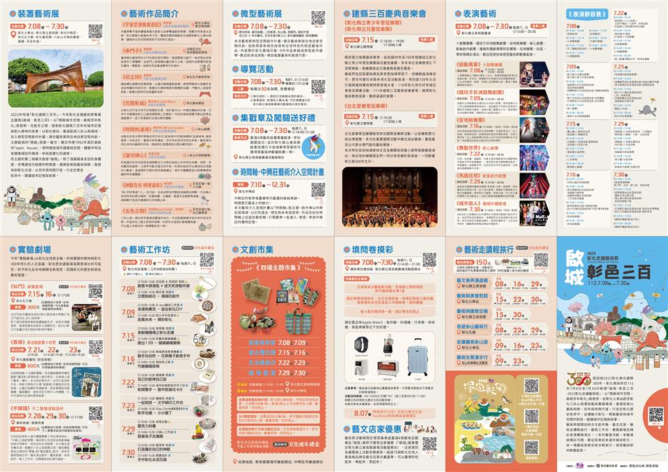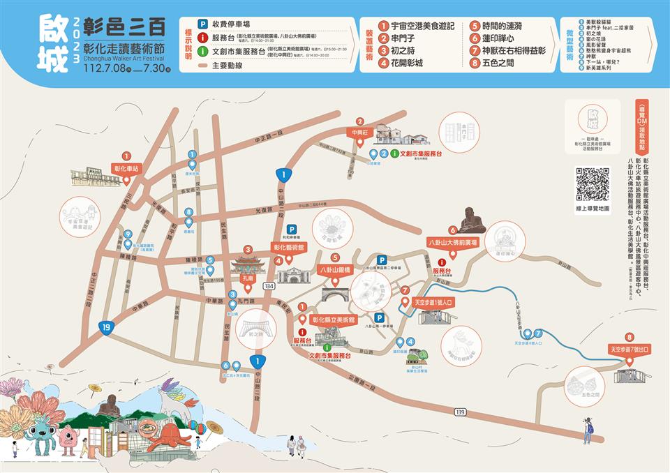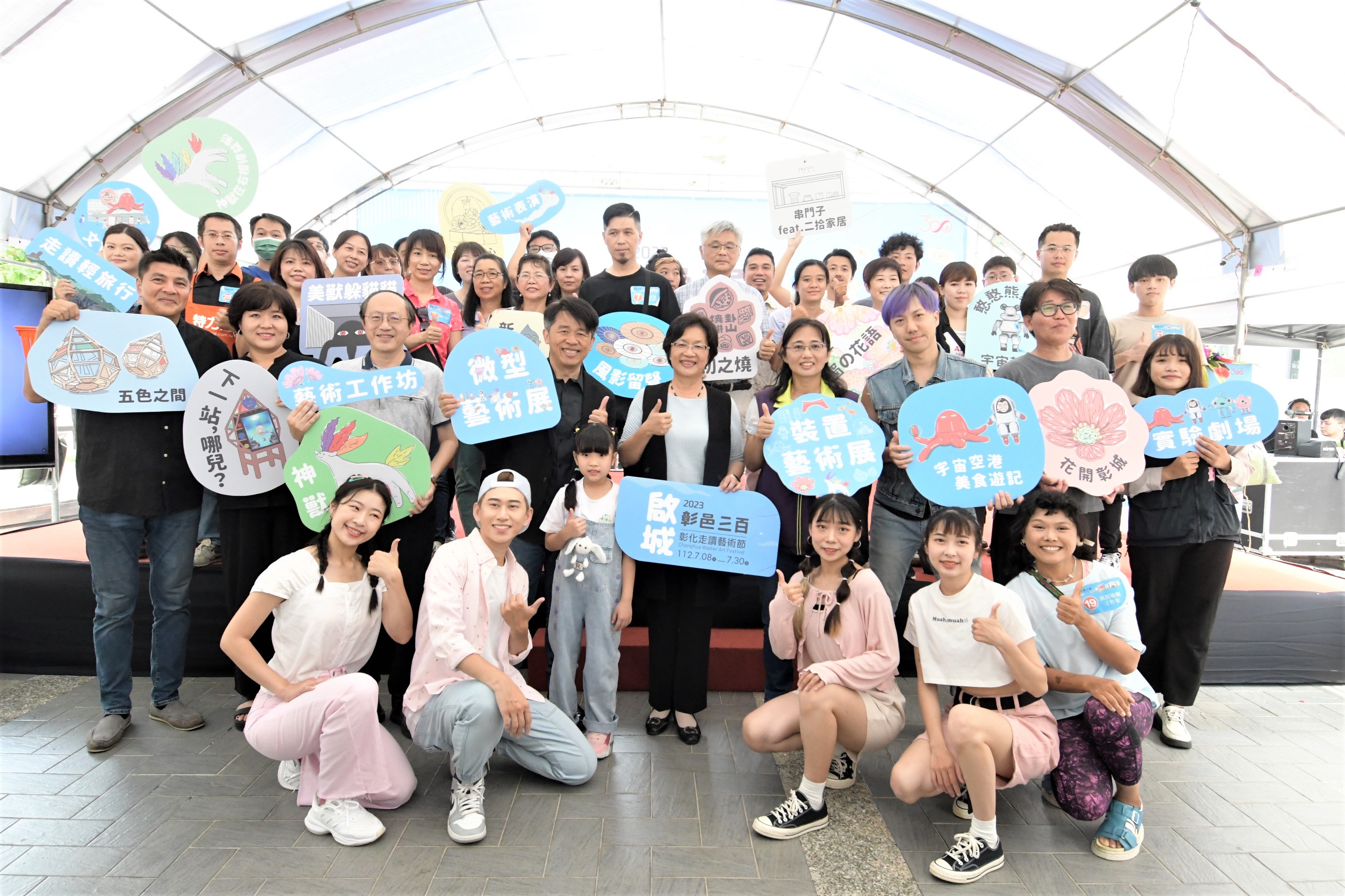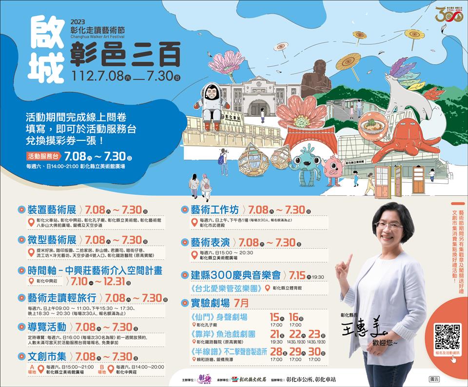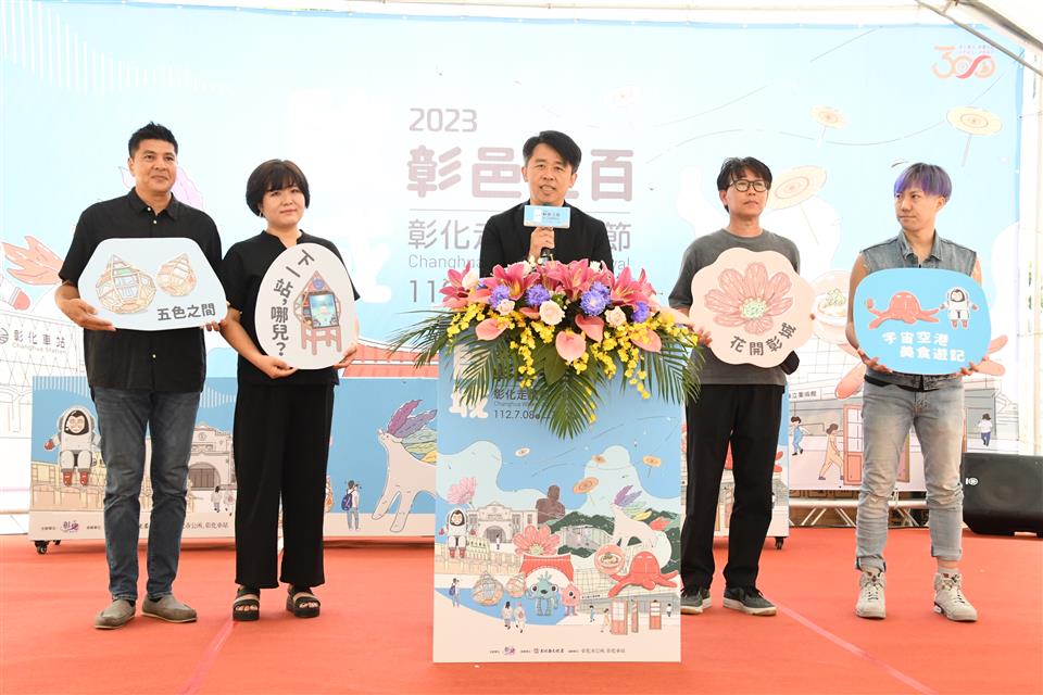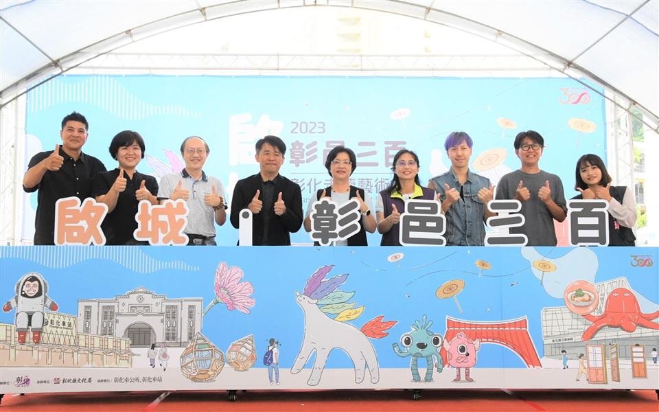 彰化今年迎來建縣三百年的里程碑,為慶祝這一重要時刻,彰化縣政府規劃於彰化市區辦理「啟城‧彰邑三百─2023彰化走讀藝術節」,今(29)日上午在縣立美術館前廣場辦理活動宣傳記者會,縣長王惠美等人與會,王縣長表示,彰化建縣300年,以「啟城‧彰邑三百」作為主題,邀請知名藝術家設置8件裝置藝術作品,開啟藝術與城市空間的對話,另有9件微型藝術創作、3團實驗劇場、1場慶典音樂會、16場藝術工作坊、16場走讀輕旅行、藝術表演、文創市集等系列活動,縣長王惠美邀請大家「藝」同出發,即日起至7月30日(周日),走讀魅力彰化,穿梭半線古蹟與市區,尋訪裝置藝術之美。 王縣長表示,這次走讀藝術節,8件大型裝置藝術,分別在彰化車站、彰化中興莊、彰化孔子廟、彰化縣立美術館、彰化藝術館、八卦山大佛前廣場、銀橋及天空步道,還有,9件微型藝術作品,媒合藝術家與彰化藝文店家空間共創作品,串接成微型創作廊帶,歡迎大家按圖來欣賞。另外,也規劃一系列表演藝術,每週六、日邀請知名表演團隊、街頭藝人、學校、社區團隊在彰化縣立美術館廣場演出,還有7月15日至7月30日期間,3個青年團隊實驗劇場,由「身聲劇場」、「魚池戲劇團」、「不二擊聲音製造所」,為古都注入新的元素,讓走讀藝術節更加不一樣,另外,7月15日晚上舉辦1場建縣300慶典音樂會,邀請台北愛樂管弦樂團在彰化縣立體育館演出,免票入場,歡迎大家「藝」同出發,走讀魅力彰化,尋訪裝置藝術的美感巧思。 王縣長指出,另外,還有16場「藝術工作坊」,由當代藝術家及在地手作教師帶著大家動手玩創意,還有16場「走讀輕旅行」共6條路線,以藝術融入在地文化、建築、美食及生態,有幾個場次都已經秒殺了,剩下的名額請大家把握機會。特別加入微型空間創作計畫,讓藝術家與在地藝文店家共同創作,還有,文創市集,每個周末在縣立美術館廣場、中興莊都有不同主題特色「文創市集」,集滿點就送好禮,搭配縣府GO購消費活動,7月至9月只要消費200元,上傳發票就能參加摸彩活動,同時文化局也準備闖關紀念品,數量有限,歡迎大家踴躍參與。 王縣長表示,這次也串聯75家藝文店家,活動期間只要集戳章至店家消費都有折扣,集章並闖關成功、打卡或完成學習單,就送好禮,也歡迎青年朋友使用文化成年禮金,給予藝術家鼓勵;另外,填問卷還可以參加摸彩,包括Apple Watch等多項好禮,歡迎大家一起來走讀彰化,欣賞好的藝術品。 走讀藝術節策展人蔡致偉表示,這次策展主題為啟城‧彰邑三百,象徵彰化建縣300週年一個重要的里程碑。展覽場域拉回彰化舊城區、車站、八卦山等,邀請到日籍老師與台灣藝術團隊等一同參與。中興莊陳禹霖老師的作品《串門子》,代表彰化的眷村文化;在孔廟有詹維欣作品《初之詩》,代表彰化建築及文學樣貌;日本藝術家國吉滿作品《花開彰城》代表彰化的農業精神、黑色特工隊《時間的漣漪》代表彰化的產業;有電互動作品,可以互動的《蓮印禪心》代表彰化的信仰;蔡潔莘老師作品《神獸在右相得益彰》代表彰化的守護神,彰顯出彰化原生物種;由日籍藝術家吉田敦及韓國藝術家宋周妍聯手打造精巧的木造裝置《五色之間》代表彰化的自然生態;8座藝術裝置加上9個微型創作,都非常精采,歡迎民眾一起來參與。 文化局表示,歡迎全國鄉親暑假期間前來漫遊彰化,感受彰化建縣三百年新豐采!8件裝置藝術設置於彰化車站、彰化中興莊、彰化孔子廟、彰化縣立美術館、彰化藝術館、八卦山大佛前廣場、銀橋及天空步道等空間。呼應建縣三百年,彰化車站及彰化縣立美術館的大型亮點作品《宇宙空港美食遊記》,代表彰化美食和體育,由藝術家張育嘉從彰化為臺灣拳擊發源地及在地特色美食發想,結合其代表作「體操男爵與美獸」,作品在二個場域相互呼應;陳禹霖作品《串門子》展示於中興莊,代表彰化的眷村記憶,以懷舊感讓大家以新的角度重溫舊時代的美好;詹維欣作品《初之詩》代表彰化的建築記憶,設置於彰化孔子廟,象徵文化精神傳承的累積和延續;日本藝術家國吉滿作品《花開彰城》代表彰化的農業,以名聞全國的彰化花卉及日本花卉為元素,於前身為日治時期公會堂的彰化藝術館廣場上創造詩意般沈浸式感官體驗;《時間的漣漪》代表彰化的產業風華,設置於八卦山銀橋,由黑色特工隊發想自彰化知名文學作家施叔青作品《行過洛津》中的經典橋段「益春留傘」,結合彰化傳統產業─「織」、「傘」意象,利用在地布料廠剩布拼接,透過再生為環境提出永續的設計;有電互動作品《蓮印禪心》代表彰化的信仰,設置於八卦山大佛前廣場,透過AR裝置營造出智慧美感與趣味的多重體驗,搭配「大佛尋寶記」APP,尋寶達標送限量小禮物;蔡潔莘作品《神獸在右相得益彰》代表彰化的守護神,設置於天空步道1號入口,融入在地特有原生植物,將神獸打造成守護彰化的物種之神;《五色之間》代表彰化的自然生態,設置於天空步道7號出口,由日籍藝術家吉田敦及韓國藝術家宋周妍聯手打造精巧的木造裝置,十分具有奇趣感。另有9件微型空間創作計畫,媒合藝術家與彰化店家空間共創,完成具有在地特色的微型藝術作品,串接成微型創作廊帶,歡迎民眾前來找亮點,尋訪裝置藝術的美感巧思。 本次活動以藝術帶動觀光,目前已有超過75間店家成為藝術節之友,集藝術品戳章有好禮相送還能享藝