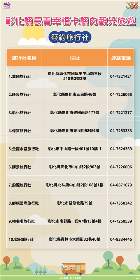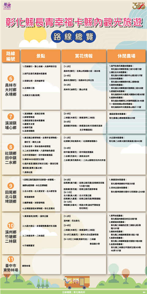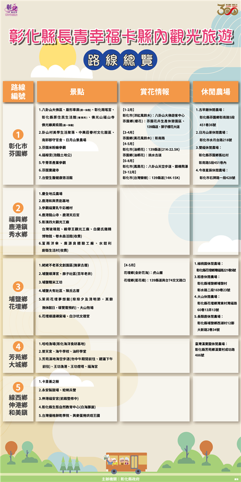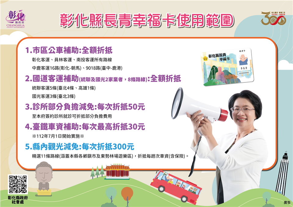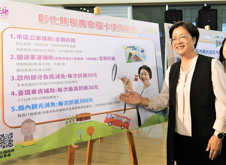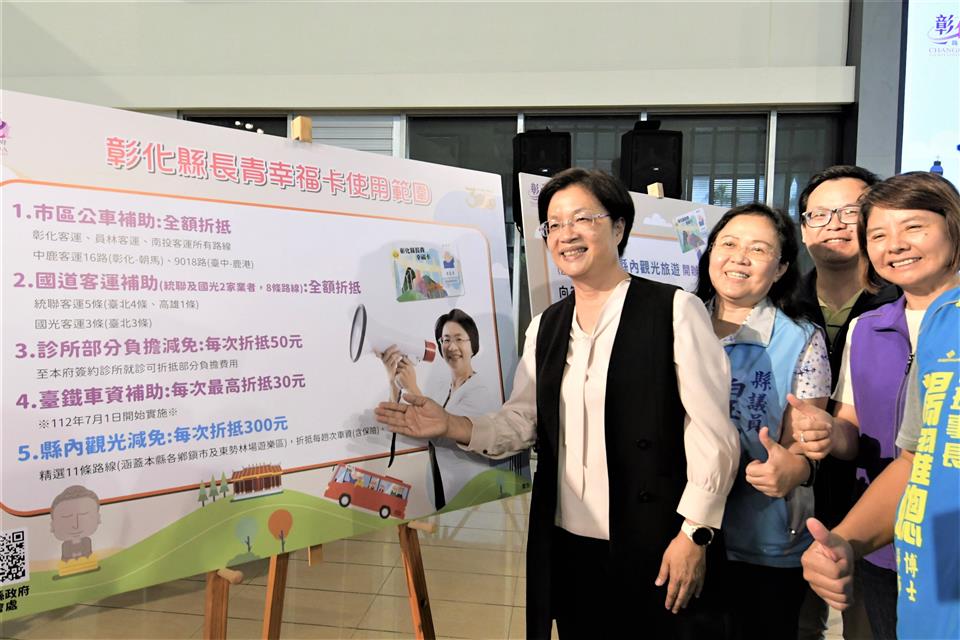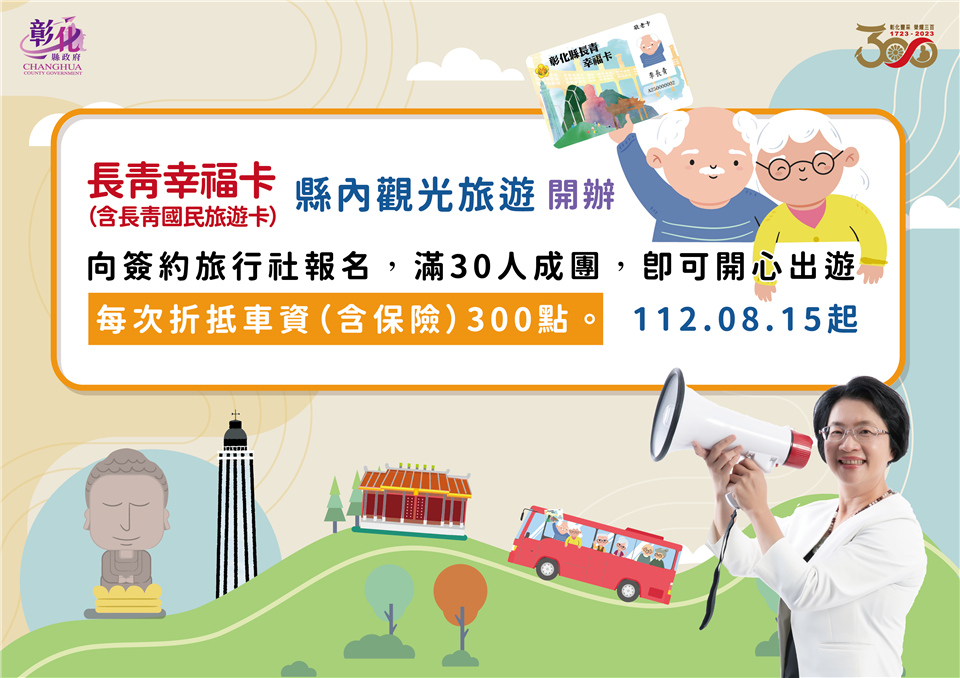 彰化縣政府為鼓勵長者踴躍參與戶外活動,同時推展疫後縣內觀光旅遊,於28日上午在縣府中庭舉辦「彰化縣長青幸福卡擴充功能-縣內觀光旅遊車資費用折抵計畫開辦記者會」,彰化縣長王惠美表示,自8月15日起,長者及身心障礙朋友持長青幸福卡至縣府簽約旅行社參加縣內11條精選觀光旅遊路線行程,每次可折抵車資(含保險)300元。 王縣長表示,長青幸福卡再升級,從8月15日起,開拓11條精選觀光旅遊路線行程,景點包括了彰化縣內26個休閒農場、15個觀光工廠及縣內名勝古蹟及季節賞花,65歲以上長輩一趟行程折抵車資(含保險)300元,30位長輩就能成團,到11條路線旅遊。特別感謝彰化縣農會加碼,只要持長青幸福卡到東勢林場,入園費從原本的250元,優待到只收60元,園區內也有展售很多彰化縣產農特品,為的就是要讓長輩願意走出戶外,身體更加健康,同時也帶動縣內經濟,讓更多的鄉親及長輩了解彰化近年來的建設及進步,也讓餐飲業、禮品業及旅行社有機會來服務大家,希望長輩走出戶外,讓身體能夠健健康康,歡歡喜喜過日子,讓兒孫無後顧之憂去打拚事業,也讓自己在晚年生活能幸福快樂過日子。 王縣長指出,在開場的表演中,看到伸港鄉溪底社區的長輩們,跳舞非常好看,看不出來有的已80多歲了,這正是縣府期盼的讓長輩走出戶外,彰化縣政府推出長青幸福卡,從民國98年起,給65歲以上長輩提供每月1000點社福點數使用,民國111年加碼,可搭乘彰化客運、員林客運、南投客運、中鹿客運等市區公車及統聯客運及國光客運等國道客運,讓長輩不僅可以到溪頭,往南到高雄、往北到台北等地旅遊、探親,自今年7月1日起再擴充福利,也可以搭乘臺鐵,每趟最高可補助30元,讓長輩在搭乘大眾運輸工具多一項選擇,另外,至簽約診所就診,也可折抵部分負擔50元,歡迎縣內長輩多多使用。 縣議員白玉如表示,一路走來,王縣長十分積極推動長青福利卡福利政策,縣議會也很支持,這次規劃的11條旅遊路線,她也都有先行走過,深刻地感受到縣內長者的活力,只要長者願意出來走動,不僅讓心情愉快,也可以讓身體更健康,感謝縣府用心規劃路程,以及沿路的商家、觀光工廠、運輸業者、旅行社等配合,不僅讓長者有更多好去處,也讓更多人發現彰化的美。 彰化縣農會總幹事張建豐表示,看到王縣長整合所有彰化縣的資源,不管是旅遊業者、運輸業者、在地所有的觀光工廠及休閒農場,把資源整合起來後,規劃了11條的觀光路線,主要是讓長輩除了在社區關懷據活動外,也可以走出門看看彰化的美、彰化的好。原本彰化縣內的10條路線,今年再加入東勢林場這條路線,東勢林場有200公頃的面積,也有完整的休閒步道、溫泉、美人湯,是非常舒服舒適的,歡迎鄉親能來東勢林場走走,雖然有那麼好的幸福長青卡,但也有許多長輩還未去申請,大家一起來推廣,讓幸福長青卡的功能發揮到最大。 彰化縣商業會副理事長楊曜聰表示,王縣長真的很用心,能夠把長青福利卡升級,照顧老人、照顧經濟,可說是一魚三吃,第一個就是給長輩得到最好的福利,第二個是除了讓在地商家能增加收入之外,也能讓旅行業者有更多服務的對象,第三個是讓內需產業可以透過這11條路線,厚植在地觀光產業,相信透過長期耕耘一定可以把觀光產業推向國際。 彰化客運董事長黃錦椿表示,這次彰化縣旅行業者一起來參與,首先要感謝王惠美縣長縣府團隊,用心規劃長青幸福卡加值功能,讓長輩們可以走出戶外,更加健康,對於旅行業、遊覽車業者,也可以帶動較多的經濟來源,創造多贏,是有益於彰化縣好的政策。 社會處表示,在疫後邁向新生活的同時,縣府團隊首創長青幸福卡補助縣內觀光旅遊行程,推出11條精選旅遊路線,範圍涵蓋彰化縣各鄉鎮市及彰化縣農會所屬的東勢林場,如寺廟祈福、休閒農場、季節賞花、觀光工廠等,景點豐富多元,持卡民眾可自由選擇路線,與縣府簽約旅行社聯繫,並在行程開始前至旅行社營業窗口刷卡購票及確定上車時間及地點,即可與三五好友揪團旅遊,讓辛苦度過疫情的長輩與身心障礙朋友能夠走出家門,重新探索彰化,與彰化這塊美麗的土地歡喜重逢! 社會處表示,縣內觀光旅遊車資補助為長青幸福卡的第五項補助方案,六都以外用途最多元,也希望長青幸福卡的「五星級」服務能夠帶給長輩與身心障礙朋友滿滿的幸福。此外,特別感謝東勢林場、成美文化園、縣內各觀光工廠及休閒農場對縣府的鼎力支持以及提供專屬優惠措施。配合2023彰化Go購活動,縣內店家消費單筆滿200元憑發票網路登錄即可參加抽獎,歡迎大家玩越多、買越多、賺越多! 社會處表示,凡設籍彰化縣並符合下列資格之一者(年滿65歲、領有身心障礙證明、年滿55歲以上原住民),只要攜帶身分證(身障者需附身心障礙證明、原住民需附戶籍謄本)、兩吋彩色照片(2張)及印章至各戶籍地鄉鎮市公所,即可免費申辦。 與會貴賓有縣議員白玉如、曹嘉豪、陳玉姬、埔心鄉長張佩瑩、溪湖鎮長何炳樺、彰化縣農會總幹事張建豐、彰化縣商業會副理事長楊曜聰、彰化縣旅行商業同業公會秘書林碧筠、彰化汽車客運股份有限公司暨彰化旅行社董事長黃錦椿、彰化旅行社經理莊碧惠、股長李秀娟、勝景旅行社總經理陳麗英、喬國旅行社總經理林世昌、經理張秀蓉、旺泉旅行社總經理黃瑄渝、金龍永盛旅行社彰化分公司業務主任林春美、鈞瀧旅行社董事長
