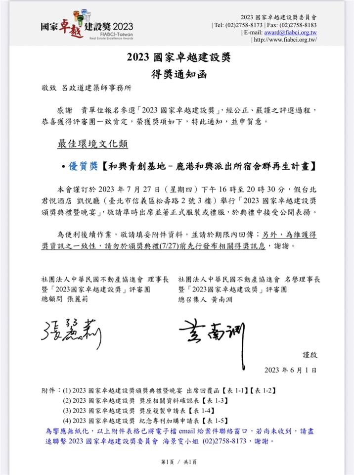 彰化縣鹿港鎮「和興青創基地」日前獲頒2023年建築園冶獎,近日再傳捷報,榮獲2023年中華民國不動產協進會之「國家卓越建設獎-最佳環境文化類優質獎」,消息傳來,彰化縣文化局團隊非常振奮並表示感謝設計單位呂政道建築師事務所對「和興青創基地-歷史建築鹿港和興派出所宿舍群再生計畫」用心與巧思,讓全國看到彰化縣文化資產修復再利用的努力與成果。 文化局表示,呂政道建築師為彰化縣子弟,創立呂政道建築師事務所以來,戮力於歷史建築的場域再造、文化藝術環境美學的提升與各級機關學校的工程建設革新。曾任彰化縣公共藝術審議會、臺中市公共藝術審議會、彰化縣都市設計審議會委員,現任中央文化部公共藝術視覺藝術類專家學者、南投縣有形文化資產審議會審議委員與逢甲大學建築專業學院助理教授等,經驗豐富,此次同時榮獲國家卓越建設獎、建築園冶獎的肯定,更可印證呂建築師長期投入及關注彰化古蹟歷史空間的再生與新創的成果。 「和興青創基地」前身為彰化縣107年登錄之歷史建築鹿港和興派出所後側宿舍群,縣府以「千帆入港-再造歷史現場專案計畫」向文化部爭取修繕經費,讓它風華再現並華麗變身為彰化縣首座青創基地。呂建築師運用依時序分陳之建築群,利用舊有的空間作為空間敘事的載體,以歷史文化觀點出發外,加入美學、人文因素,置入體驗教育、生活、活動、展演等,並延續且發揮和興派出所宿舍群的生活創意,使基地扮演「鹿港鎮青年洄游及文化網絡匯流器」,為鹿港注入新的能量,這次獲獎實屬彰化全民的榮耀。 文化局表示,感謝評審團的肯定,同時也恭喜呂政道建築師獲得此殊榮,本次和興青創基地獲獎,亦是文化局與建築師團隊共同努力的結晶,文化局未來將持續守護及修復彰化珍貴文化資產。