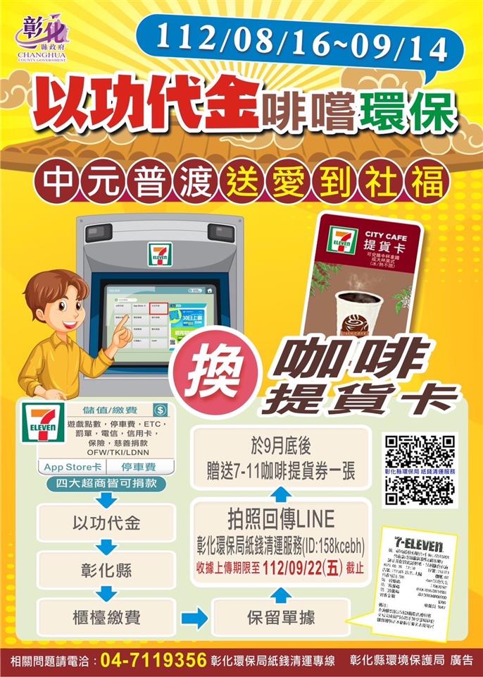 彰化中元普渡淨零轉型推廣「以功代金」,環保局特規劃於今(112)年中元節期間,結合統一、全家、萊爾富、OK等四大超商,創新推出「以功代金捐款送咖啡」活動,即日起至9月14日止,民眾只要透過超商平台捐款給「彰化縣」的社福團體,憑超商捐款收據拍照上傳(期限112年9月22日止)至Line彰化環保局紙錢清運服務(ID:@158kcebh),即可兌換統一超商咖啡提貨卡1張,不僅可幫助弱勢團體,誠心祭祀又兼顧環保,減少空汙做功德一舉數得,歡迎民眾共同響應。 環保局表示,近年積極輔導縣內宮廟、民眾配合「紙錢集中燒」、「紙錢減燒」等環保祭祀政策,111年度中元節期間全縣紙錢清運量達302.77公噸,相當於11萬多份的紙錢。且配合集中清運單位達384處,較107年度(272處)增加112處,成長約4成且逐年增加,顯示出本縣整體環保祭祀觀念已大幅提升。 環保局指出,「紙錢集中清運服務」可洽各鄉鎮市公所清潔隊、撥打環保局紙錢集中清運專線04-7119356,或是加入環保局Line線上紙錢清運帳號(ID:@158kcebh)進行預約,並請於清運前5日完成預約登記,預約時間為週一至週五8:00~17:00。環保局於112年8月15日聘請專業法師在溪州焚化廠舉辦「中元節淨爐科儀」,請民眾安心配合紙錢集中燒,降低空氣汙染。 環保局呼籲民眾中元普渡時,盡量少焚香、少燒紙錢,改採以功代金、以糧代金及以花代香等方式祭拜,除可減少空氣汙染危害及維護民眾自身健康,更可挹注善款幫助弱勢團體,達成回饋社會及改善空氣品質之雙贏目標,請大家共同響應環保祭祀,讓中元普渡的敬意不打折。