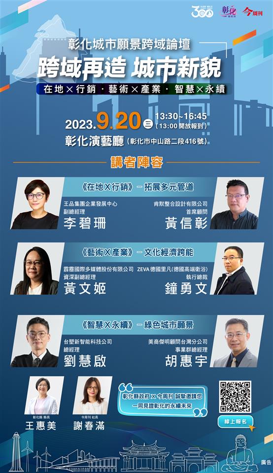 彰化傳承300年歷史榮光,於悠長歲月留下許多令人驚嘆的軌跡,也發展為農工並重的台灣第一大縣。然而隨著科技、經濟的發展,城市治理日益複雜,彰化縣將永續發展目標融入城市治理,並藉由引導不同領域知識與視角的交流合作,引領彰化向永續城市大步邁進。彰化縣政府於今(112)年9月20日下午在彰化演藝廳辦理「彰化城市願景跨域論壇」,以全球化視野匯聚業界實戰經驗,從永續、在地精神出發,透過深度跨界交流激盪創新火花,邀請有興趣的鄉親踴躍報名,一同「彰」望未來。 彰化縣長王惠美表示,跨界發展已是銳不可檔的趨勢,彰化擁有深厚歷史人文以及豐富的產業,當跨出自身領域,成為彼此共同夥伴,便能群起打入國際盃、實踐永續未來。本論壇由彰化縣政府與今周刊共同舉辦,涵蓋「在地╳行銷」、「藝術╳產業」及「智慧╳永續」三大領域,邀集6位專業主講人,匯集多元視角展開精彩對談,引領個人、產業到公部門從跨界思考找到轉型契機。 議題一「在地╳行銷」邀請「王品集團」企業發展中心副總經理李碧珊,以及號稱「台灣觀光工廠教父」的肯默整合設計創辦人黃信彰,分享品牌行銷的策略運用及品牌創新的轉型關鍵。 議題二「藝術╳產業」邀請「霹靂國際」副總經理黃文姬及「ZEVA德國里凡」(德國高端衛浴)執行總裁鐘勇文,從文化產業化到產業的人文化,達到跨境行銷開拓國際商機。 議題三「智慧╳永續」邀請「美商傑明工程顧問」總經理胡惠宇及「台塑新智能」總經理劉慧啟,分享如何透過水環境工程及智慧儲能提升城市韌性,開創淨零永續城市願景。 本論壇即日起開放免費線上報名,全程參與者還可獲得建縣300年限量紀念禮,包含《彰化:前進三百》專書及建縣300紀念米信封各1份,歡迎全民一同參與,與彰化一起跨界創新局,看見古城新貌無限可能! 活動名稱|彰化城市願景跨域論壇 活動時間|112年9月20 (三) 13:00~16:45 活動地點|彰化演藝廳 (彰化市中山路二段416號) 立即報名|https://events.businesstoday.com.tw/2023/changhua-vision/index.html