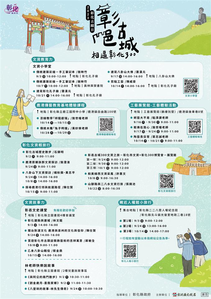 響應每年九月第三個周末為「全國古蹟日」,彰化縣文化局推廣縣內文化資產,策劃2023年彰化古蹟日「彰邑古城—相遇彰化300」活動,自9月3日至10月25日的周六及周日,辦理一系列的「文資小學堂」、「文資輕旅行」、「彰化人權旅行」、「彰邑文史講堂」活動,帶領民眾穿越彰化300年時光隧道,體驗彰化歷史與文化資產,認識古蹟的建築美感與文資價值,並自即日起開始受理報名,彰化縣長王惠美邀請大家一起穿越歷史時空、暢遊文資彰化! 「文資小學堂」整合彰化縣多元的文化資產資源與特色,以推廣及文化資產保存維護教育為核心,透過參與式的深度體驗,讓民眾瞭解文化資產保存的重要性,體驗課程包括傳統建築彩繪、剪粘工藝、速寫八卦山大佛及速寫彰化孔子廟等項目,由學有專精的文資匠師、藝師授課,親臨傳統工藝匠師的創作風采,以深入淺出的教學示範,傳授工藝概念與實作並重,傳統彩繪將體驗彩繪和貼金技巧,剪黏將實際操作工具完成獨一無二的文資手作藝品。 「文資輕旅行」以彰化多元的文化資產資源,精心規劃8條經典文資輕旅行的路線,共有:彰化古城歷史散步、鹿港原鄉族群文資探訪、八卦山下文資探訪、探尋鹿港行郊與航運路徑、彰邑古城300文資之旅-彰化市文資+彰化300博覽會-展覽館、和美線西文資采風、山腳路與二八水文資行旅、彰化人權旅行等路線,每一條文資輕旅行路線,由在地文史工作者親自帶隊,走讀文化資產秘境,講述文化資產的地方傳奇與人文故事,將彰化多元的文化資產面貌與文史轉化為知識,進而身體力行一同參與文化資產保存維護。 今年為建縣三百年特規劃「彰邑文史講堂」邀請林文龍、陳仕賢、蔣敏全以及蔡金鼎等多位文史專家學者接力講述彰化文史故事,讓我們緬懷先民篳路藍縷的墾拓過程,並能繼往開來創造彰化美好的未來!地點在彰化縣立圖書館四樓會議室,歡迎有興趣民眾一起來參加聆聽。 相關報名資訊,請上彰化縣文化局官網查詢: https://www.bocach.gov.tw/chday/?ccms_cs=1