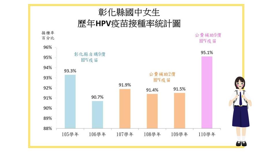 為防治子宮頸癌,彰化縣自106年起針對國中女生接種人類乳突病毒疫苗(俗稱子宮頸疫苗),實施至今已第7年,每年入校接種率皆逾90%。112年9月13日起安排醫療團隊前往49所國中,免費為111學年國中女生接種第1劑9價公費人類乳突病毒疫苗,單劑市價約6,000元,減少家長之勞碌奔波,提供便利的接種服務,預計4,300位學生受惠。 預防重於治療,子宮頸癌是少數可以透過疫苗防範於未然的癌症,子宮頸癌有超過70%是由HPV第16、18型所引起,而9價HPV疫苗可預防90%由HPV6及HPV11所引起的尖頭濕疣,另對於陰道癌、外陰癌、陰莖癌、肛門癌、生殖器疣等HPV相關癌症亦有保護之效果,此疫苗以青少女時期、無性經驗及未曾感染人類乳突病毒者的接種效果較高,預防效益最佳。 為推動國中女生校園HPV疫苗接種服務,於接種前提供相關的衛教資訊,經學生和家長同意,再經醫師評估,安排接種服務,接種後請學生原地休息至少30分鐘,若有不適可立刻告知醫師,即時處理接種後之不良反應。提醒符合公費HPV疫苗接種女學生,請依仿單建議時程完成所有劑次接種,以具有完整保護力,也呼籲家長們一同守護家中寶貝女兒的健康,完整接種HPV疫苗,遠離子宮頸癌的威脅。 衛生局提醒接種HPV疫苗並不能完全免除子宮頸癌發生,仍須定期接受子宮頸抹片檢查,抹片檢查能早期偵測癌前病變,因此疫苗與抹片雙管齊下,才能加倍保護女性,有效杜絶罹患子宮頸癌。如有相關人類乳突病毒疫苗接種相關問題,請洽詢彰化縣衛生局疾病管制科,電話:7115141分機5136。
