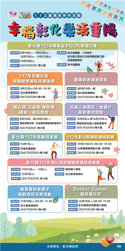 為慶祝一年一度重陽敬老節的到來,彰化縣政府特別舉辦溫馨敬老情重陽系列活動,(21)日上午於縣府中庭舉辦活動宣傳記者會,縣長王惠美表示,九九重陽節即將到來,先預祝所有長輩們重陽節快樂!也特別感謝長輩過去辛苦的工作,讓台灣經濟大幅成長,並培養出優秀的彰化青年,「家有一老,如有一寶」,彰化縣今年百歲人瑞共有256名,其中最長壽的是111歲的長輩,可見65歲都還不算老,活到老、學到老、健康到老,縣政府即日起至12月16日舉辦重陽節系列活動,希望長輩們手眼更加協調,身體更健康,歡迎縣內長輩共襄盛舉,另外,敬老禮金將從9月25日起發放,百歲人瑞敬老禮金更有1萬元及金鎖片,也會到人瑞家中來探訪,希望長輩們顧好身體,健康久久、快樂久久。 王縣長表示,重陽敬老系列活動,首先登場的是「縣長盃卡拉OK歌唱比賽」,已經開始進行比賽,歡迎長輩相約,一起走出戶外來唱歌跟聽歌;接著,10月7日的「高齡同學會」,將在花壇全國麗園飯店舉行,邀請縣內百歲人瑞及結婚滿70年的白金婚長者一起歡慶重陽佳節;而為了展現據點長輩的活力,10月21日將舉辦「銀髮趣味競賽」活動,將據點服務及多元健促等核心概念融入闖關遊戲中(拖鞋擲筊、呼拉圈傳接、甩便利貼及乒乓球大隊接力),透過遊戲,讓長輩越玩越有趣,越玩越健康;11月18日則是「我愛我的老樣子」高齡穿搭走秀,由青年與長輩共同組成跨齡設計團隊,邀請舞蹈講師、服裝講師培訓社區長者參加走秀分享,穿搭不限年齡,潮流也不分世代,讓更多社區照顧關懷據點長輩被看見;最後登場的是12月16日的「Senior Gamer銀色電玩手」,打電玩不再是年輕人的專利,今年以「電玩主機switch」搭配相關遊戲,打破年齡的限制,讓電玩遊戲可以成為世代之間的互動契機,爺孫共同創造歡樂的回憶。 王縣長指出,縣府持續提升長輩福利,社區照顧關懷據點提升到現在的341個,讓長輩能夠在地就能得到最好的照顧,也用心辦理各項活動及推行老人福利措施,如獨老關懷訪視、緊急救援系統、敬老眼鏡、假牙補助等,今年更是提升長青幸福卡的功能,讓長輩1年就有1.2萬元的額度能夠遊山玩水,呼籲長輩們多多走出戶外,使心情更加快樂,身體更加健康。 社會處表示,凡112年1月1日前設籍本縣,且直到重陽當月均未遷出的年滿65歲長者,以及55-64歲原住民長者,發放重陽敬老禮金一千元整,預估縣內約22萬多名長者受惠。 與會貴賓還有彰化市老人會理事長楊永速、花壇鄉老人會理事長趙振鵬、大村鄉老人會理事長賴木權、秀水鄉老人會理事長黃坤相、常務理事許大乾、溪湖鎮老人會理事長蔡光彥、鹿港鎮老人會理事長呂學文、縣府社會處長王蘭心、各級民意代表與地方仕紳等人。