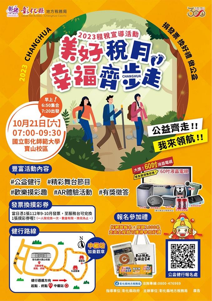 為慶祝彰化縣建縣300年及推廣各項租稅政策,彰化縣地方稅務局訂於112年10月21日(星期六)上午7點至9點30分在國立彰化師範大學寶山校區辦理彰化建縣300「美好稅月 幸福齊步走」租稅健行活動,歡迎民眾熱情參與,一起為健康而走,並共同響應捐發票獻愛心。 稅務局表示,本次租稅健行活動於112年10月3日上午10點起開放線上免費報名,報名成功並走完全程者,就可獲得涼感巾、文青提袋、瓶裝水及摸彩券各1份(每人限領1份),活動當天上午7點開始,沒有報到名的民眾也不用擔心,現場只要捐贈112年9-10月份紙本發票1張,可兌換摸彩券1張,數量有限,換完為止! 稅務局說明,除邀請民眾一起來健行外,現場另有互動表演、有獎徵答、摸彩活動及捐發票做愛心的公益活動,也設置AR租稅互動體驗區,鼓勵民眾走出戶外享受輕鬆的租稅健行路程,在了解稅務常識的同時也可開心抽大獎,現場提供60吋液晶電視、洗衣機及氣炸鍋等多項好禮,讓所有參加活動的民眾都能收穫滿滿,一同度過一個充滿歡樂的愉快假日。 本活動所募集發票將全數捐贈本縣公益慈善團體,歡迎民眾多帶符合資格的發票到場參加活動,共同響應捐發票做公益,幫助弱勢團體。活動詳情請至活動報名網站( https://reurl.cc/RyXvND )或稅務局網站( https://www.changtax.gov.tw/ )查詢,或撥打稅務局免費服務電話:0800-476969洽詢。