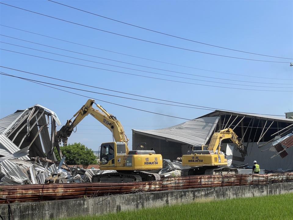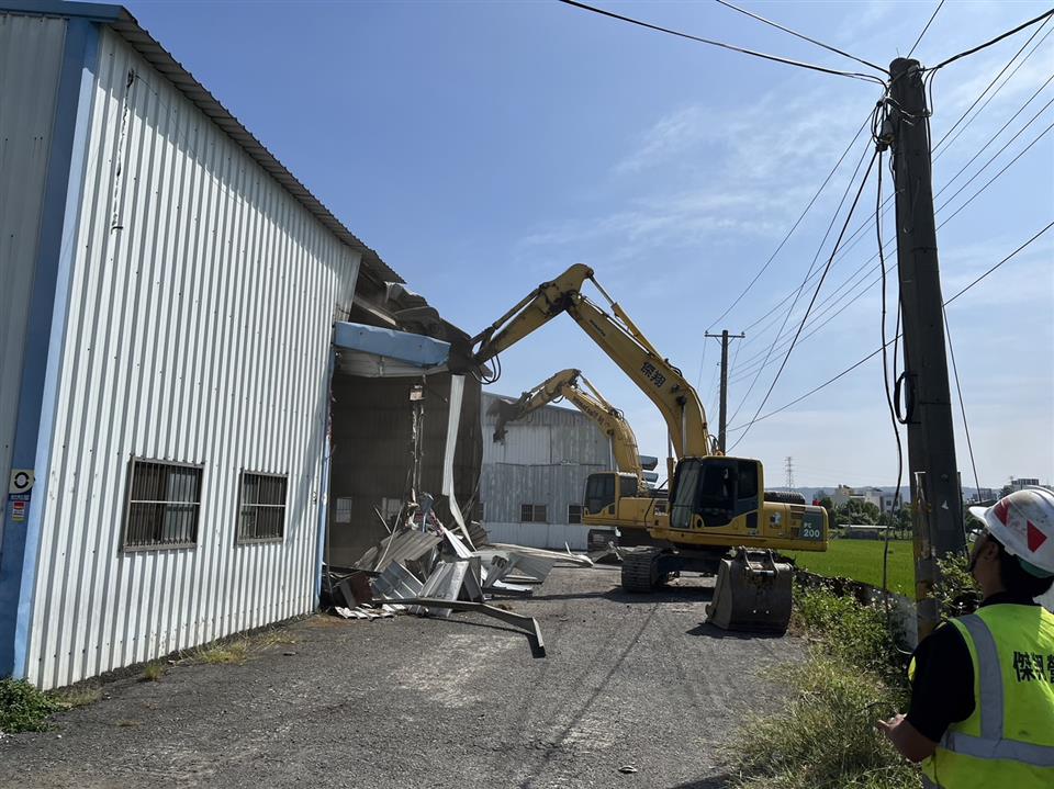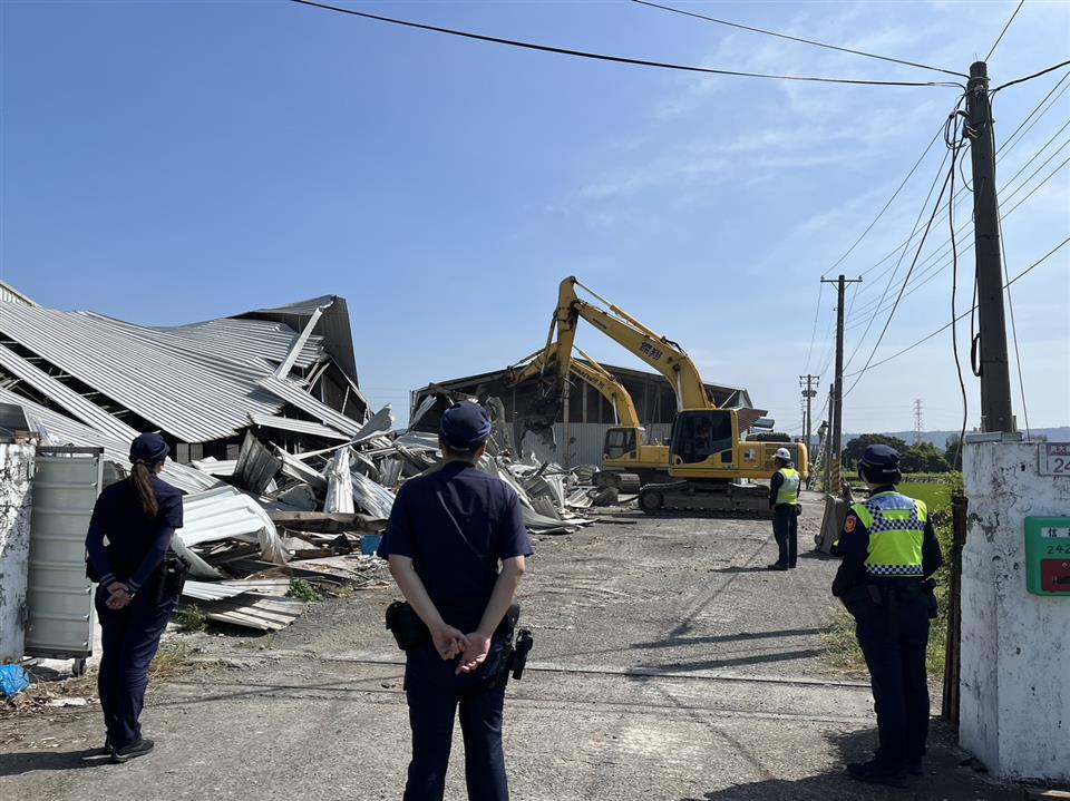 彰化縣政府昨(3)日強制拆除違建廠房,該建物坐落員林市大埔里員大路二段,土地是非都市的特定農業區農牧用地,違建面積高達2,000平方公尺。原地主不僅長期作為出租工廠、倉庫使用,並充當賭場,縣府為遏止大型農地違建廠房及違法情事,於昨日執行強制拆除。 建設處表示,此案違規工廠共分為2間廠房,違章面積2,000平方公尺,高度約6公尺,未申請特定工廠納管。經查該工廠涉嫌刑法賭博案,遭彰化縣警察局查獲,為列管賭場,縣府透過第三方警政策略由建設處執行違章拆除。 本案建設處於110年12月23日將該廠房、倉庫裁處違章建築, 112年9月14日通知所有權人排定112年10月3日執行強制拆除,總共出動開挖機3輛、鏟土機1輛、10人力,於當天拆除完成。 彰化縣政府強調,農地建築應依農業相關規定向農業處申請容許使用,倘未經許可擅自建築或非法營業影響公共安全之違章建築,將優先執行強制拆除。 彰化縣警察局表示,犯嫌為掩人耳目在農地之鐵皮屋內從事職業賭場之行為,員林警分局主動提報彰化縣政府確認屬違章建築,為杜絕該處所再次成為藏汙納垢之治安死角衍生治安事件,於10月3日上午,由彰化縣政府建設處拆除大隊、台電公司、及員林警分局到場強勢拆除違章建築,展現公權力決心。 日前彰化縣警察局在彰化縣員林市員大路上千坪鐵皮屋中之一處倉庫,查獲以劉姓及鄭姓共同經營以「妞妞」方式賭博之職業賭場。現場計有賭客29人、賭具、監錄設備、營利所得抽頭金新臺幣2萬餘元,及賭客所有賭資合計4萬餘元。全案報請臺灣彰化地方檢察署依法偵辦;另賭客29人部分,員林分局另以社會秩序維護法裁處。 房屋所有人不得將自有建築物出租給不法分子違法使用,造成社會治安疑慮,警方將結合運用第三方警政策略,持續加強查緝犯罪不法行為,並結合彰化縣政府聯合稽查小組,斷絕槍枝、毒品、詐欺、賭場等犯罪集團空間,以有效預防犯罪。