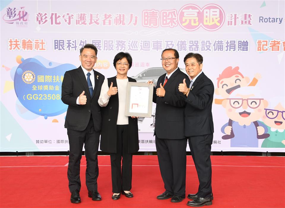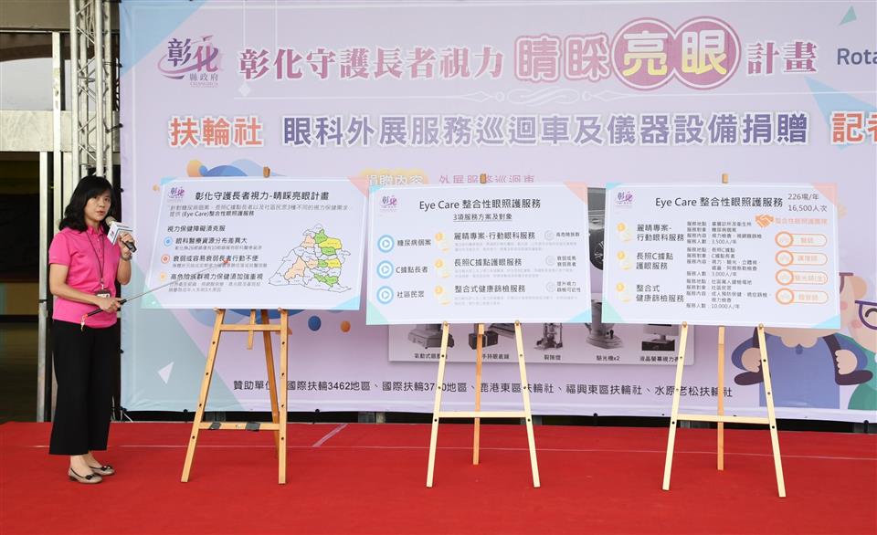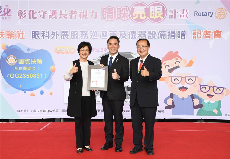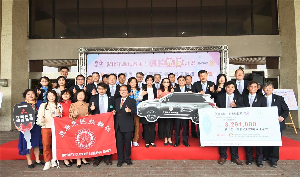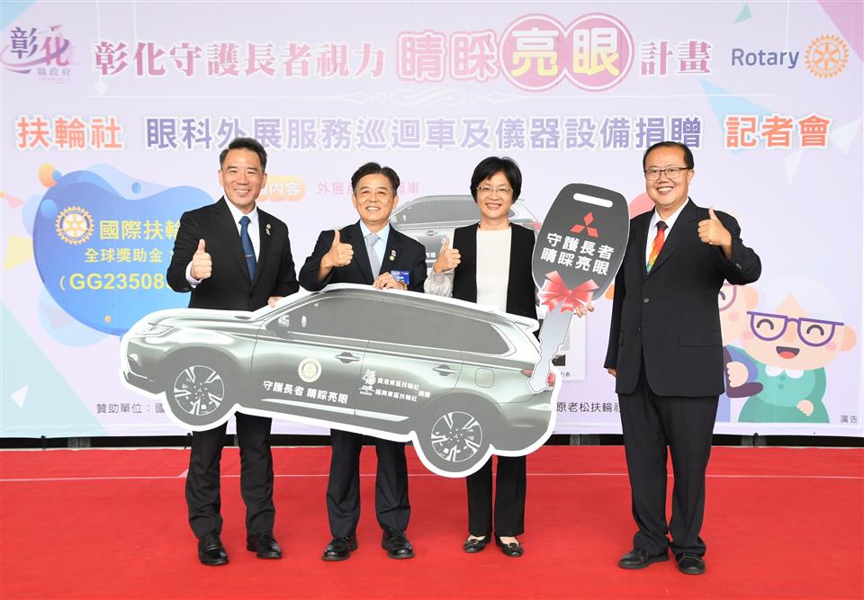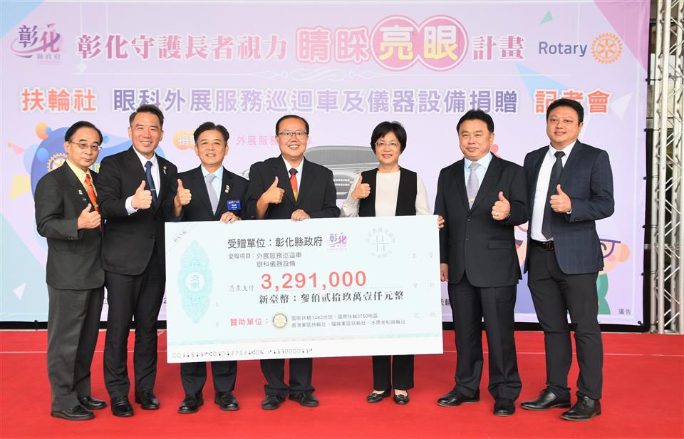 彰化縣衛生局今(14)日上午於彰化縣立體育館,辦理「彰化守護長者視力-睛睬亮眼計畫 扶輪社 捐贈 眼科外展服務巡迴車及儀器設備記者會」,彰化縣長王惠美、縣議員凃淑媚、彰化縣衛生局長葉彥伯、鹿港東區扶輪社長鄭忠慶、福興東區扶輪社長王義方、國際扶輪3462地區楊曜聰2024-25總監、明星眼科診所院長凃俊銜、彰化縣驗光師公會理事長葉士正、彰化縣驗光生公會理事長呂志忠以及多位扶輪社社友一同與會,王縣長表示,眼睛是靈魂之窗,眼睛看的見,人生是彩色的,眼睛看不見,人生就是黑白的,這項計畫預計每年辦理三大項服務麗睛專案行動眼科、長照C據點護眼服務以及萬人健檢,提升長者視力照護服務,合計226場,將讓1萬6,500人次長者受益,守護長者的健康。 王縣長表示,首先感謝國際扶輪3462地區一棒接一棒,各家扶輪社申請扶輪社全球獎助金,與縣政府一起投入彰化縣C肝根除計畫,達到WHO世界標準的108.5%,這次,再次拋磚引玉,特別感謝鹿港東區扶輪社、福興東區扶輪社以及韓國水原老松扶輪社,一起申請扶輪社全球獎助金329萬1,000元整,支持這項計畫,購置眼科外展巡迴車1部以及6台護眼儀器設備,讓驗光師生可以外展服務,深入偏鄉,協助有些長者沒辦法到專業眼科醫療院所診療,針對視網膜病變、青光眼以及黃斑部病變等眼科疾病,希望能夠早期發現,早期治療。 王縣長指出,彰化縣內在26鄉鎮市中,僅有10個鄉鎮有眼科醫療院所,6成以上鄉鎮民眾有眼睛健康問題時,没有辦法就近獲得眼科醫療的照護,這次特別也感謝彰化縣驗光師公會理事長葉士正及彰化縣驗光生公會理事長呂志忠彙集醫療院所及護理人員、驗光師,一起擴大服務更多鄉親,照護鄉親的靈魂之窗。 鹿港東區扶輪社長鄭忠慶表示,鹿港東區扶輪社每年都有申請全球獎助金,之前用於C型肝炎篩檢,今年再度與彰化縣衛生局合作,針對有些長者因為獨居造成的醫療不便,提供視力檢查及後續醫療輔助,並將數據回傳衛生局彙整,以期衛生局追蹤後續醫療診治。感謝福興東區扶輪社以及韓國水原老松扶輪社共同合作,全力支持彰化縣推展這項計畫。 福興東區扶輪社長王義方表示,福興東區扶輪社一起來捐贈眼科外展服務巡迴車及儀器設備計畫,為了讓長輩得到更好的醫療資源,能夠早期發現眼睛疾病問題,即早轉診治療,讓長輩得到更好照顧,這次捐贈以全球獎助金購置眼科外展巡迴車1部以及眼底鏡、驗光機、裂隙燈、眼壓機、移動視力表等儀器設備6台,協助長者視力健康檢查。 國際扶輪3462地區2024-25總監楊曜聰表示,很高興國際扶輪3462地區、鹿港東區扶輪社、福興東區扶輪社等,能夠與王縣長一同推廣長者視力保健外展服務,也共同捐贈4萬美金推動這次視力保健的活動,希望讓長者視力保健得到保障,不會受到眼疾之苦,同時也讓民眾了解扶輪社的公益推廣工作。 衛生局表示,彰化縣衛生局提醒您,隨著壽命的延長,失能與失智已逐漸取代疾病成為老化後最困擾的問題,特別是當長者身體出現失能情況時,死亡率會比未失能者來更高。民眾應定期安排視力檢查、針對異常及早發現及早治療,避免因為視力減損甚至失明問題影響健康與生活。
