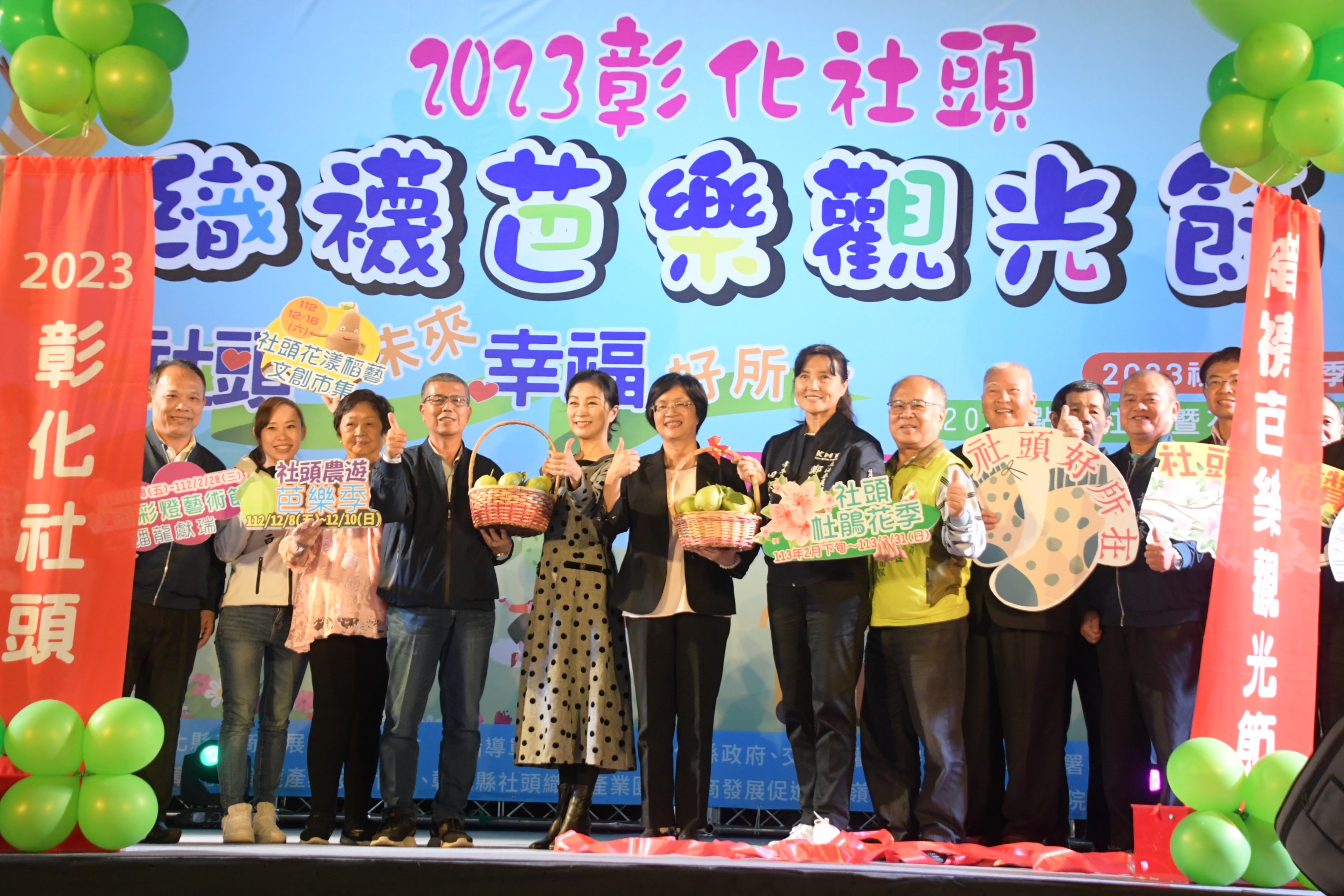 彰化縣一年一度盛事「2023彰化社頭織襪芭樂節」今(8)日於社頭鄉果菜市場正式登場,彰化縣長王惠美、社頭鄉長蕭浚二等人出席。社頭織襪芭樂節今年已邁入第22年,活動從今天12月8日到12月10日為期3天,活動豐富多元,有全國最大織襪精品展售、農特產品展售、演唱會等精彩活動,還有首次舉辦全國織襪評鑑,現場有芭樂創意料理免費品嚐、摸彩、打卡送好禮、發票換襪子等好康活動,邀請全國民眾相揪來社頭買襪子、吃芭樂。 社頭鄉長蕭浚二表示,社頭織襪芭樂節今年已邁入第22年,感謝過去每任社頭鄉長的支持,才能讓社頭織襪芭樂節越來越熱鬧,今年增添觀光元素,就是響應王惠美縣長的美好彰化,希望城市,以行動吸引觀光人潮。今年多規劃5處鄉內景點,包括火車站龍燈「蟠龍獻瑞」、聖誕燈飾,以及社頭鄉2千多位小朋友彩繪燈籠,另外還有鄉內杜鵑花大道(忠義路),將打造假日市集,今年也安排花海稻草創意藝術、公仔、晚上還有LED燈,讓全國民眾未來可以來這裡欣賞花海及夜景,一直到年底還有杜鵑花盛開。此外,社頭還有著名彰化縣八景之一的清水岩寺,再延續到織襪產業園區,今年度也首創全國織襪比賽,將於明天12/9舉辦,歡迎大家來參與;另外月眉池可說是見證歷史的建築物,為了要讓更多好朋友來鄉內旅遊,也規劃免費巡迴接駁車,每10分鐘就有一班車,從火車站、杜鵑花大道(忠義路)、清水岩寺、織襪產業園區、月眉池,之後再進果菜市場,歡迎大家來相揪來社頭。 王縣長表示,連假二天何處去?來社頭就對了!社頭鄉在2021年入選全國百大經典小鎮之一,十分具有魅力,社頭有三多,「芭樂多、襪子多、董事長多」。芭樂甜又脆,襪子品質好,很多鄉親的一年份的襪子就在今天統統買齊,這三天的活動可說是好吃又好玩,民眾自社頭火車站下車後,就能搭乘接駁車直達活動場地,更可以帶著民眾來趟輕旅行,歡迎鄉親一起來共襄盛舉,縣府會全力支持各鄉鎮辦理活動吸引觀光人潮,也希望社頭未來能有更多民宿,留住觀光人潮,促進消費。 社頭鄉民代表主席陳慶福表示,這次活動增添觀光元素,將吸引大量觀光客前來,雖然可能會有塞車,也請社頭鄉親拿出熱情來招待觀光客,才能讓社頭觀光發展越來越好。 農業部農村發展及水土保持署長李鎮洋表示,在來活動之前,他先到社頭各景點走走,的確有許多吸引人的打卡美景,蕭鄉長很有創意,也一心一意的希望能帶動社頭經濟,讓年輕人返鄉工作,未來水保署也會全力協助社頭相關發展。 社頭鄉以織襪工業聞名全台,與織襪相關廠商大大小小約有200家,可說是撐起台灣超過八成的織襪產量。業者持續不斷精進創新研發商品,並積極轉型升級,打造完整產業鏈,朝多元商品及服務方向發展,讓產業能永續經營發展,這次活動不僅有全國最大的社頭在地優良織襪特色產品展示會及台灣製MIT微笑標章精品展售,還有社頭在地芭樂及農特產品行銷加值活動,有古早味米苔目、新鮮芭樂及限量芭樂創意料理免費品嚐活動,以及「用愛心兌好襪」活動,只要憑112年11、12月發票兩張即可兌換社頭好襪一雙(每人限換兩雙襪子,送完為止),讓大家有吃又有拿!歡迎大家共同來支持在地產業。 現在12月適逢芭樂的產期,社頭鄉的的芭樂種植面積約有252公頃,因為氣候和土壤條件好,還有八堡圳的灌溉及濁水溪沖積平原的沃土,種植出來的芭樂營養價值高,美味又健康。農會每年也會辦理芭樂評鑑,鼓勵農友種植出高品質的芭樂,讓全國消費者能安心食用。除了鮮食芭樂,社頭鄉農會及農友們也積極開發加工產品,如芭樂冰棒、芭樂乾及芭樂心葉茶,並研發新的芭樂料理美食,也請大家多多支持選購。 與會貴賓有縣議員鄭俊雄、 蕭妤亘、詹琬惠、社頭鄉長蕭浚二、縣議員許書維服務團隊、農業部農村發展及水土保持署長李鎮洋、交通部觀光署參山國家風景區管理處長曹忠猷、社頭鄉民代表主席陳慶福、前社頭鄉長魏陳春惠、社頭鄉農會理事長蕭成洽、常務監事蕭文鏘、總幹事蕭良珍、彰化縣農會理事長蕭景田、線西鄉農會總幹事楊玲珠、竹塘鄉農會總幹事詹光信、鹿港鎮農會總幹事梁竣傑、芳苑鄉農會總幹事謝介民、馨世代婦女會會長劉玉娟、縣府農業處長邱奕志、經綠處長湯國榮、縣府秘書蕭自成、縣政顧問陳俊成、蘇芳蘭、各級民代及地方仕紳等。