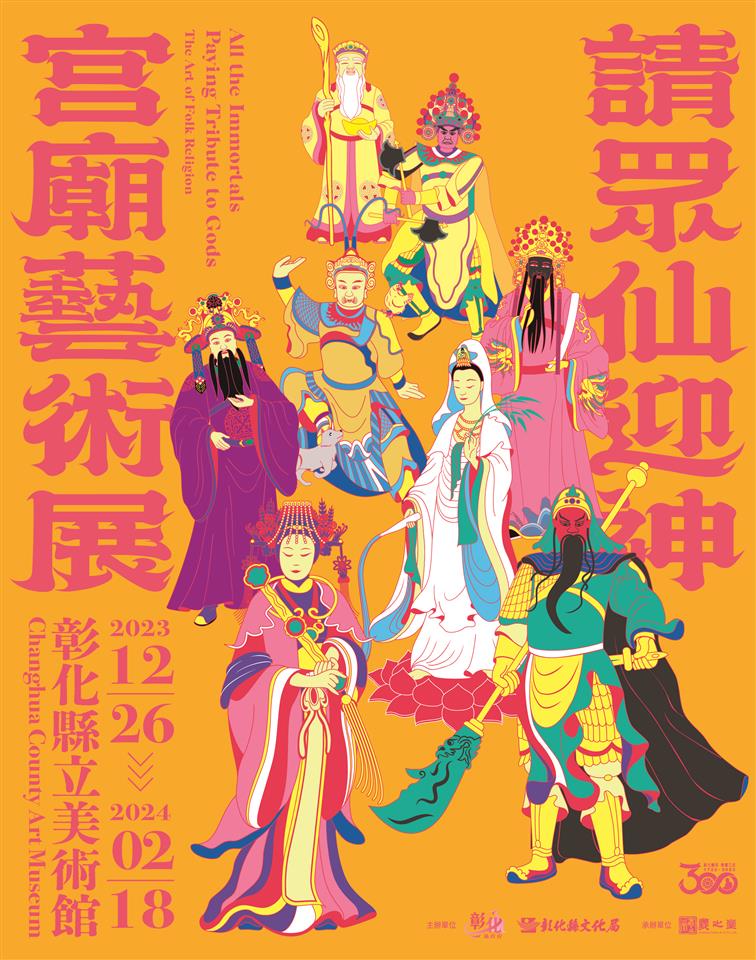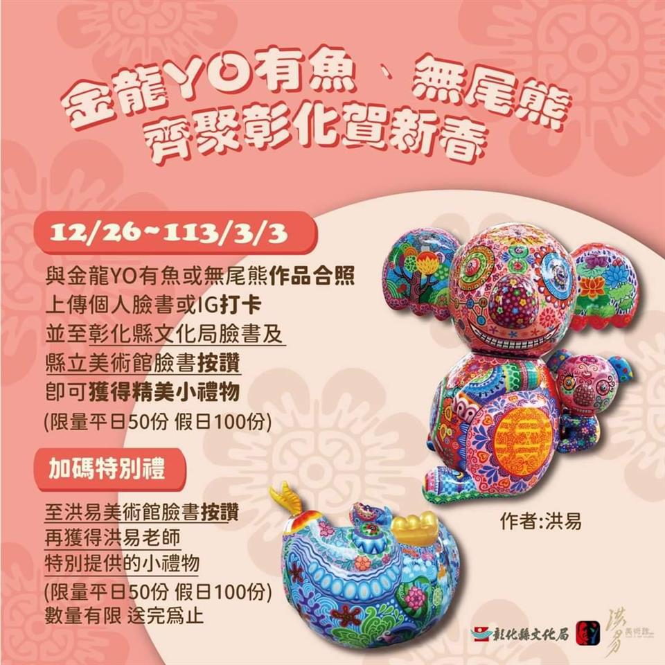 「請眾仙迎神–宮廟藝術展」於彰化縣立美術館展出至113年2月18日(大年初九天公生),由8個公立美術館、博物館出借典藏品,展出58位藝術家,109件作品,歡迎鄉親把握機會,一起來欣賞,美術館前廣場還有洪易老師創作的二件吸睛藝術公仔,「金龍YO有魚」及「無尾熊」2件作品,彰化縣長王惠美歡迎大家前來欣賞宮廟藝術展,也可到美術館廣場前與藝術公仔拍照打卡,就有機會獲得限量小禮物! 王縣長表示,請眾仙迎神–宮廟藝術展,由縣府委由策展人陳筱君老師,以「現在–過去–未來」時間軸呈現,分為三個展區,第一展區在美術館一樓,「古藝今來–宮廟信仰的美學詮釋」,有李松林、李秉圭、施鎮洋等重要傳統工藝保存者的作品,同時對照臺灣近當代美術,如藍蔭鼎、席德進、鄭善禧、廖修平等前輩藝術家作品,以及當代代表性藝術家朱銘、楊茂林的創作;第二展區在美術館三樓,「尋城訪古–廟宇文物的文化脈絡」,有龍年印版體驗區讓大家拓印版畫完可以帶回家,還有展示廟宇祭祀科儀與南北管戲曲文化薪傳,並將先賢書藝家之文字連結神明信仰,詮釋不同世代的書道精神;第三展區在美術五樓,「祈願之地–世代更迭的庶民觀點」,以擴增實境「放天燈」Web-AR互動設計,結合AI辨識與影像互動遊戲,打造虛擬實境的奇幻世界。此外,「時光迴廊」以老照片訴說早期民俗活動與宮廟盛事,讓大家能夠體驗不同宮廟美學的新詮釋,歡迎大家前來欣賞。 另外,在縣立美術館廣場展出的「金龍YO有魚」及「無尾熊」2件藝術公仔,至3月3日以前,只要與這二件藝術公仔的任1件合照後,上傳個人臉書或Instagram打卡,並至彰化縣文化局臉書及縣立美術館臉書按讚,即可到美術館服務台兌換精美小禮物;至洪易美術館FB按讚,再獲洪易老師特別提供精美禮物。以上2樣小禮物,平日皆限量50份,假日皆限量100份!