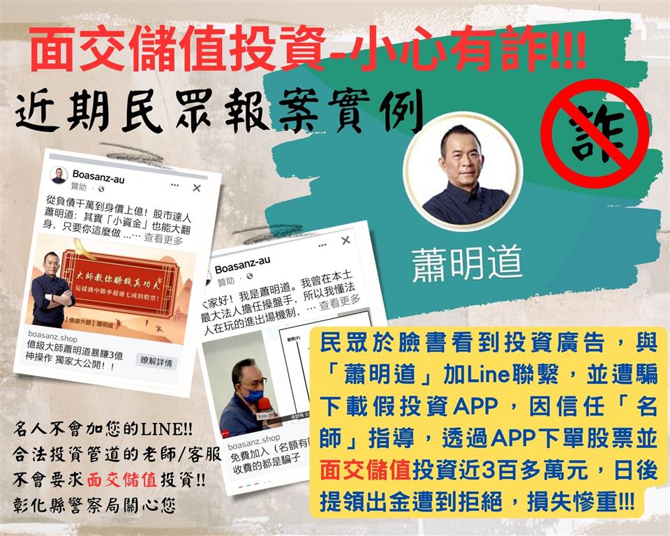 日前一名陳姓男子到彰化縣警察局報案,稱在網路投資股票當沖,由代操助理抽簽申購「欣新網」股票,已陸續面交投資新臺幣(以下同)360萬元,但因中簽後投入的金額不足且帳戶遭到凍結,需再投入300萬元,才能解鎖帳戶提領功能,陳男認為不合常理,才趕忙報警協助。 警方發現這是詐騙集團慣用的股票當沖詐欺手法,隨後立即組成專案小組,利用雙方約定於113年1月22日再次面交120萬元時,當場逮捕20歲A姓取款車手,並於附近查獲17歲B姓與29歲C姓監控共犯,當場查扣作案用手機、印章及偽造的公司識別證和收據等證物,訊後依詐欺罪嫌移送彰化地檢署,並持續溯源偵辦。 自113年1月17日彰化縣警察局局長陳明君到任迄今,本局共計查獲面交車手、收簿手案件共10件12人、妨害自由(拘禁人頭帳戶被害人)詐欺1件3人,查扣不法所得521萬餘元,另攔阻詐騙匯款40件、攔阻金額1,894萬餘元,打詐、阻詐不遺於力;刑事警察大隊分析,警方與金融機構合作默契良好,攔阻詐騙匯款成功率將近7成,民眾臨櫃匯款時,行員都會關心用途、辨別有無遭詐,詐騙集團遂改慫恿民眾「面交」投資款項,誆稱由專人「面交」儲值、取款,服務便利、手續費優惠等,殊不知這些都是提高詐騙成功率的話術。 陳明君局長呼籲民眾,千萬不要輕信網路上任何投資訊息,不論投資股票、虛擬貨幣等,標榜「保證獲利、穩賺不賠」一定是詐騙;投資理財務必經由合法證券商、期貨業、投信投顧業者,若陌生網友教的,投資匯款到陌生帳戶,或是「面交」儲值等方式,也一定是詐騙。年關將至,詐騙集團更加猖獗,而詐騙手法千變萬化、詐騙訊息無孔不入,惟有強化識詐能力,才能確保自身財產安全。