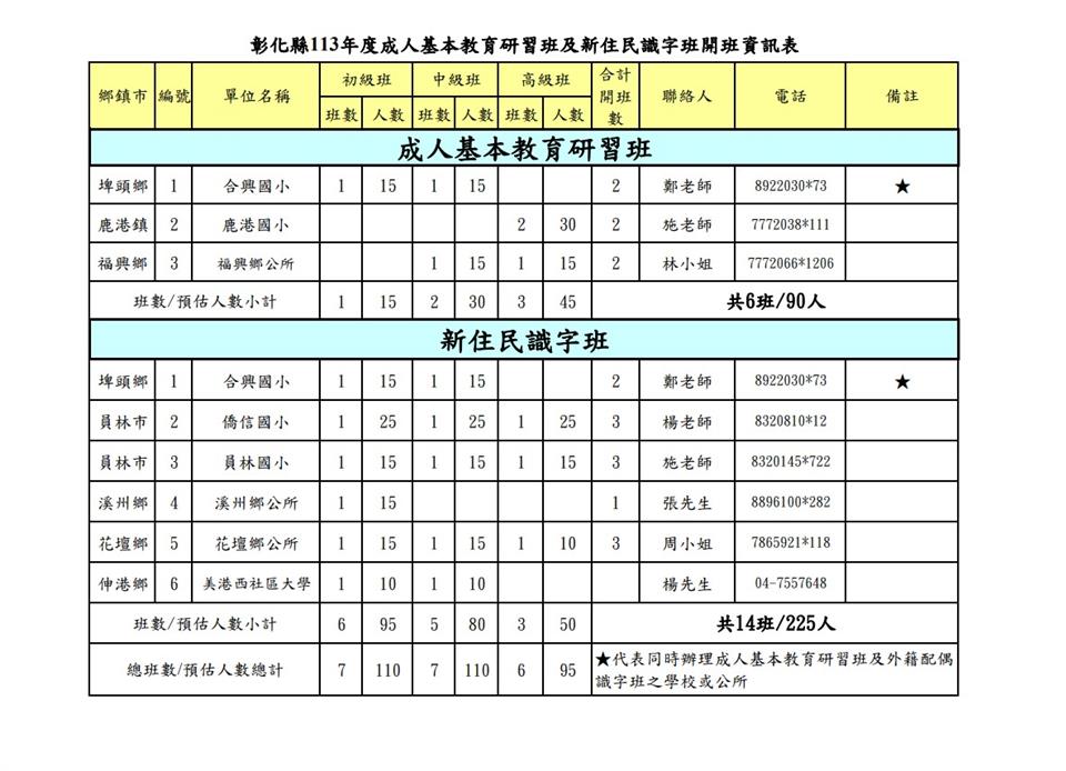 彰化縣政府為培養失學國民及新住民聽、說、讀、寫能力以充實基本生活知能,辦理「113年度成人基本教育研習班及新住民識字班」,共開辦20班(含成人教育研習班6班及新住民識字班14班),每班上課時數72小時,即日起可直接向開班單位報名參與,額滿為止,歡迎有意願的國民及新住民朋友踴躍報名,詳情請參閱開班資訊表。 教育處表示,本次開班單位包含福興、溪州與花壇3個鄉(鎮)公所,鹿港國小、僑信國小、員林國小及合興國小等4所國小,還有美港西社區大學(伸港國中)等,依學習程度分成初級、中級與高級班,參與學習並取得成人基本教育研習高級班結業證書者,即具有國民小學附設補習學校初級部結業程度,得銜接就讀國民小學附設補習學校高級部,使民眾融入現代社會環境並充實自我知能,以提升生活品質。 各開班單位相關資訊,請至彰化縣政府「教育處新雲端」網站首頁,選擇業務專區/檔案下載/社教科/成人教育資訊項下「113年成教班及新住民識字班相關資訊」查詢,(網址為https://www.newboe.chc.edu.tw/open_file/&4&317)/,有意報名的民眾可選擇居住地點鄰近鄉鎮巿開班單位,就近學習。