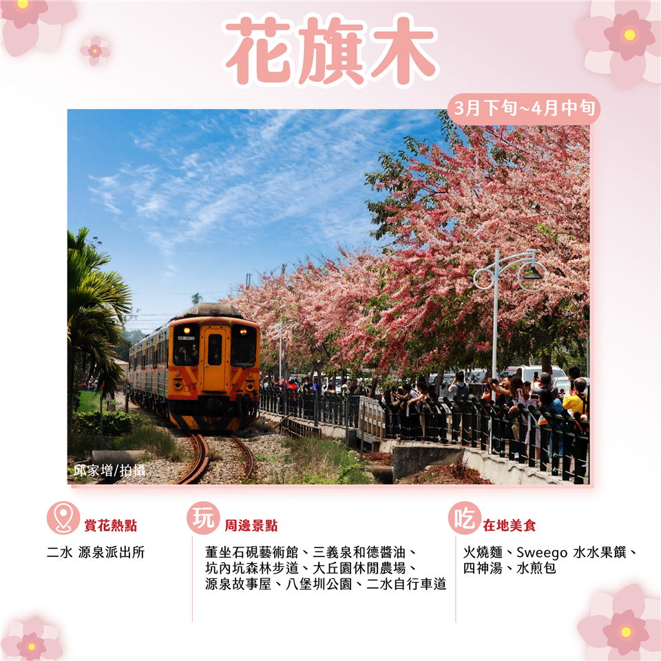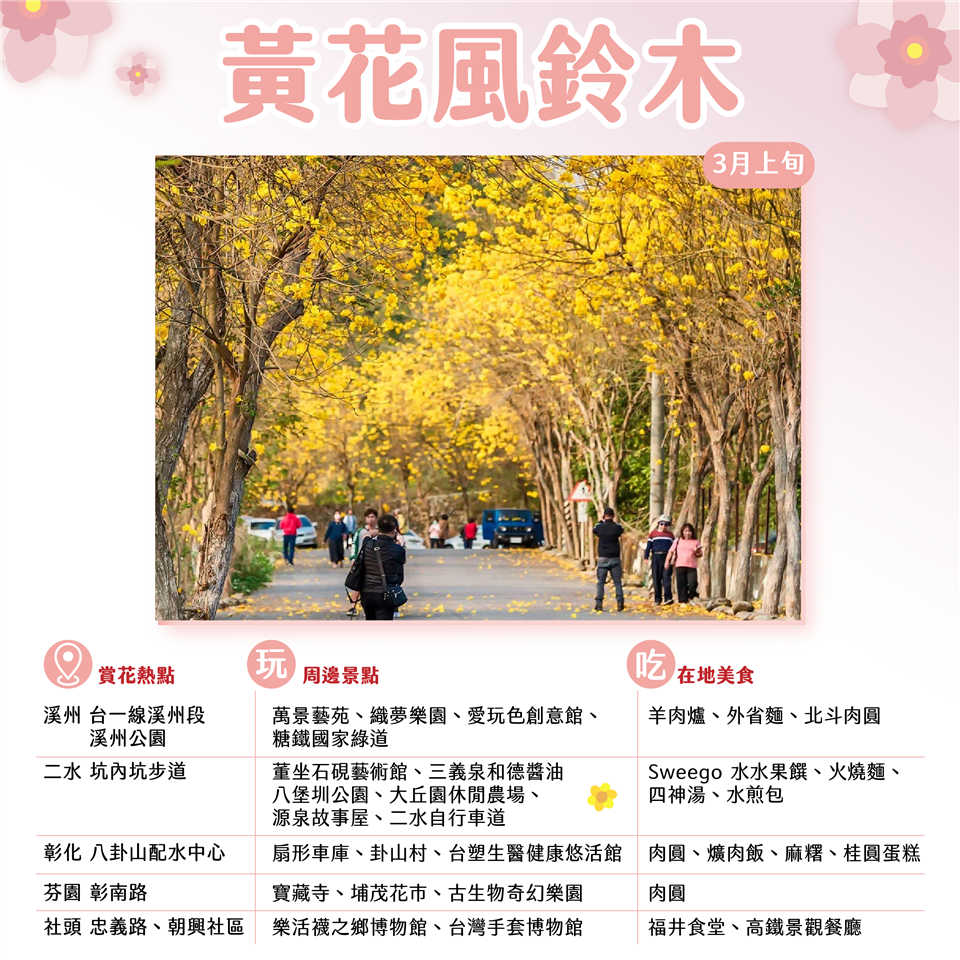春天是追花的季節,彰化各地花海競相綻放,包括黃花風鈴木、苦楝花、蜀葵花、二水粉紅花旗木、埤頭、二林及竹塘等地的木棉花,經過一年的等待,賞花季節已拉開序幕,為了吸引全國遊客到彰化賞花,各鄉鎮也結合在地特色也陸續推出花季限定活動,彰化縣長王惠美邀您春暖花開來彰化就對了,來一趟彰化賞花賞景輕旅行。 盛開中的「黃花風鈴木」,如燦爛的陽光點綴出彰化的活力,二水坑內坑步道兩側成排盛開的黃花風鈴木,黃金隧道在幽靜的林間彷如秘境,其他地點還有芬園彰南路、台1線彰化溪州段、社頭忠義路等,邀請民眾把握花期前來。 「木棉花」掛滿枝頭的情景,就好似烈火燃燒整條街,近年來超人氣的彰化木棉花道就位在東螺溪畔,從埤頭鄉至二林鎮綿延數公里,近期埤頭鄉的木棉花已悄悄進入花期,東螺溪景色隨著四季更迭,春天最適合來木棉花道騎著自行車,欣賞療癒稻田風光,木棉花道所在的埤頭鄉有稻米博物館「台灣穀堡」、冰粽發明館、怪獸百寶村等,二林鎮盛產釀酒的葡萄,有「葡萄酒的故鄉」美譽,其美食如蕎麥麵、炸粿、肉圓等也讓人口水直流,最適合來場「天嚐地酒微醺小旅行」,另外,位在竹塘鄉田頭堤防的木棉花道同樣擁有高人氣,竹塘鄉也即將於3月9日舉辦「2024竹塘鄉水神傳說木棉花季」,參加活動還可順遊全台最「寬」的九龍大榕公以及日式建築風格的明航寺等,處處是美景。 在這個賞花時節,能讓鐵道迷也為之瘋狂的,就不能不提到位在二水鄉源泉派出所附近的「粉紅花旗木」,花旗木枝條就像粉紅色的煙火垂下,美麗而浪漫,粉紅廊道緊鄰著台鐵集集線,每當小火車經過時,集集小火車與粉紅花旗木同框的畫面,殺了不少記憶體,近期花旗木已悄悄冒出枝頭,預計在三月中盛開,二水鄉也規劃在3月23日至4月21日舉辦花旗木活動,可順遊二水老街探訪百年老店三義泉和德醬油、品嘗二水美食火燒麵,去董坐石硯藝術館進行水墨體驗 DIY,賞花的同時也可感受人文懷舊風情。 一年盛開兩次的田中鎮梅州街的「九重葛」花牆,巨型花瀑傾瀉而下,壯觀美麗,現已開七成,預計三月迎來盛開,賞完花可以去參觀口罩國家隊華新口罩觀光工廠,來到田中老街吃有名的田中高麗菜飯、選購古早味蜜麻花再漫步田中森林公園來趟自然生態之旅;還有「苦楝花」賞景密境就在彰化市大肚溪棒壘球畔,白紫色花瓣爆滿盛開時就像春天雪一樣美麗,堤防步道上隨手一拍都很有意境,推薦順遊彰化市區半線走透透,參觀全台唯一扇形車庫、走訪文青氛圍小西街及職人手做卦山村,吃彰化排隊美食肉圓、爌肉飯或麻糬、蛋黃酥等,不論是正餐或點心都很經典,好吃又好拍。 四月份是花中巨人「蜀葵花」的季節,員林市也即將推出一年一度的「蜀葵花季」活動,徜徉在上萬株花比人高的花海迷宮裡,十分壯觀,來到員林還有知名景點百果山遊憩區、藤山步道,IG打卡聖地琉璃仙境休閒農場、極光森林、右舍咖啡等,員林在地美食包含米苔目、拉仔麵、雞腳凍、蜜餞,樸實無華卻很出眾。 歡迎民眾蒞臨花的故鄉彰化,與我們一同迎接春天的到來,享受賞花的樂趣,更多最新花況及旅遊活動就在「彰化旅遊資訊網」https://tourism.chcg.gov.tw/ 或「愛玩彰化」臉書粉絲專頁及IG即時更新推薦。 彰化一甲子獲選店家: https://changhua60years.oppa.tw/ 感謝邱家增先生與謝瑞家先生提供拍攝照片。