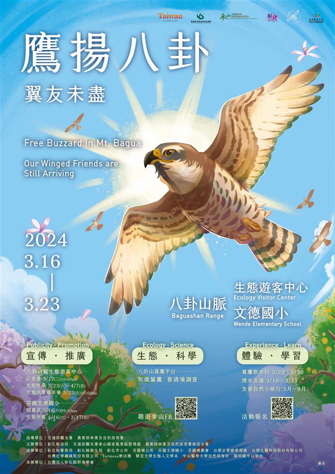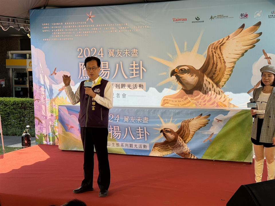 賞鷹季來了,彰化縣一年一度生態盛會「2024鷹揚八卦賞鷹活動」,今年已邁入第31年,這次「2024鷹揚八卦賞鷹活動」由彰化縣政府、交通部觀光署參山國家風景區管理處、農業部林業及自然保育署南投分署、彰化縣野鳥學會共同合作辦理一系列的生態、社區體驗遊程。今(12)日上午在八卦山脈生態遊客中心與主、協辦單位共同召開記者會,彰化縣副縣長林田富及交通部觀光署參山國家風景區管理處湯維堯副處長等人與會,邀請全國鄉親於3月16、17日一起來彰化賞鷹享受生態、生活及城市觀光的美好體驗。 今年縣府於3月16、17日兩天在芬園鄉文德國小舉辦精彩的活動,現場有南路鷹生態市集、手做小教室、生態導覽及生態踏查等活動,不僅讓民眾在文德國小觀景台觀賞灰面鵟鷹及其他猛禽鷹姿,更透過鷹揚八卦一系列的活動,向下扎根宣導生物多樣性及生態保育之重要性,為維護自然資源盡一份心力。 彰化縣政府更用心安排了遊戲闖關活動,只要這兩天在文德國小的生態市集中通過3個遊戲關卡,就可兌換1株桂花樹苗或高質感的手機吊飾 (二擇一),數量有限,送完為止!請大家把握一年一度的鳥界盛會,一起來彰化賞鷹! 為落實節能減碳,今年活動日由台塑相關企業提供免費接駁車,路線1.從彰化火車站直達台塑生醫悠活館,上午9時發車,約30分鐘一班車;路線2.從台塑生醫悠活館直達芬園鄉文德國小,上午9時15分發車,約30分鐘一班車,歡迎民眾多加利用,共同響應環保減碳愛地球。 副縣長林田富代表縣長王惠美誠摯邀請全國民眾,把握此次「2024鷹揚八卦-翼友未盡,攏來賞鷹!」的活動,踴躍前往體驗融合了灰面鵟鷹、生態觀光及生活美學的賞鷹盛會。 與會人員有立法委員謝衣鳯、黃秀芳服務團隊、交通部觀光署參山國家風景區管理處副處長湯維堯、農業部林業及自然保育署南投分署秘書秦思原、縣議員李成濟、黃柏瑜、楊子賢、花壇鄉民代表葉尚雯、彰化市長林世賢、芬園鄉公所秘書林威任、彰化縣野鳥學會理事長林仁勇、總幹事李益鑫、彰化縣旅遊產業協會秘書長湯凱杰、芬園鄉文德國小校長李政穎、大葉大學環境教育中心教授陳宜清、執行長賴美秀、南投縣政府風景區管理所所長張昭貴、農業處副處長蕭麗玲、動物防疫所所長董孟治、各級民代及地方仕紳等。
