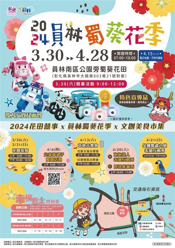 彰化縣長王惠美今(22)日上午參加由員林市公所主辦「2024員林蜀葵花季」記者會,在員林市南區公園旁蜀葵花田(員林市大饒路803巷21號對面)舉辦,員林市公所主秘賴冠宇代表員林市游振雄與會,王縣長表示,2024員林蜀葵花季,自前員林市長吳宗憲開始舉辦已有10年,感謝游振雄市長團隊的用心,越辦越好,今年自3月30日(六)開幕起至4月28日(日),開放免費入園參觀,員林蜀葵花期長達1個月,歡迎全國各地遊客前來員林欣賞「花中巨人」蜀葵花,漫步在萬紫千紅的蜀葵花海,欣賞顏色繽紛的美麗花朵,感覺幸福又浪漫。 王縣長表示, 春暖花開的時節,感謝大明社區理事長張俊郎用心照顧8分地的蜀葵花田,花開得十分美麗,特別感謝議長謝典林及議員們對於蜀葵花季活動的支持,員林市是南彰化經濟及文化中心,還有許多在地美食及好玩景點,有百果山遊憩區溜滑梯、共融公園-兔馬鹿公園、龍燈公園、藤山步道、彰化版秋紅谷「圓林園」、IG打卡熱門地點「右舍咖啡」、百果山探索樂園、琉璃仙境休閒農場等,另外,近期,還有黃花風鈴木、木棉花、蜀葵花、花旗木,接力綻放,歡迎來彰化,欣賞彰化的好、彰化的美。 員林市公所主秘賴冠宇表示,員林市蜀葵花季活動今年已經邁入第10年,這次種植面積約有8分多,感謝王惠美縣長縣府團隊的支持,也感謝員林代表會張國良主席及代表們支持公所,以及在地里長與大明社區所有成員的協助,讓今年活動可以辦得更加有聲有色。今年活動除了延續去年有的小魔女「小葵」、兔子「蜀來寶」人物造型外,也將員林燈會的燈飾移置到活動現場,從3月30日正式開園到4月28日止,中間還會安排各種特色活動,歡迎全國民眾來員林欣賞蜀葵花、吃美食,晚上還可以賞花燈。 城觀處表示,員林市公所舉辦的蜀葵花季活動到今年已邁入第10年,今年的蜀葵花季活動將於3月30日開幕,活動內容十分豐富,有精彩的表演、賞花區、文創美食市集、裝置藝術供民眾拍照打卡,且活動期間每週日還有表演,精彩不停歇,一年一度的花季活動,邀請各位鄉親把握最佳賞花期,到員林賞花、拍美照。3至4月是賞花的好時節,彰化各地開始百花齊放,有媲美金色隧道的「黃花風鈴木」、夢幻雪白的「苦楝花」、鐵道限定的賞花秘境「粉紅花旗木」、萬紫千紅的「蜀葵花海」以及熱情如火的「木棉花」等等,每月都有專屬季節的花兒熱情盛開,相關賞花資訊可至「愛玩彰化」搜尋,歡迎全國鄉親,來彰化賞花看表演、吃美食、遊景點。 與會貴賓還有縣議員凃俊任、劉惠娟、議員黃正盛服務處團隊、張欣倩服務處團隊、曹嘉豪服務處團隊、員林市公所主秘賴冠宇、員林市民代表會主席張國良、參山國家風景區管理處八卦山主任曾森裕、員林市里長聯誼會長洪光旭、大明社區理事長張俊郎、縣政秘書賴沛然、縣府城觀處、農業處、各級民代及地方仕紳等。