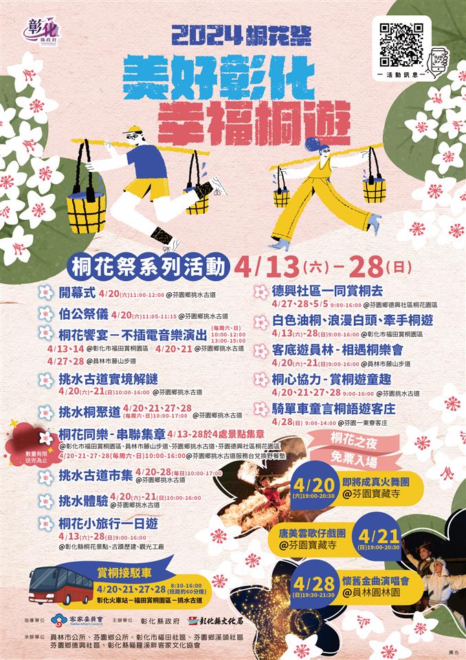 彰化縣挑水桐聚道 賞桐逍遙遊,一年一度的油桐花在八卦山脈綻放,在雪白浪漫的花季,彰化縣政府聯合彰化市公所、員林市公所、芬園鄉公所、彰化市福田社區、芬園鄉溪頭社區、德興社區,及彰化縣貓羅溪畔客家協會,今 (10) 日上午在芬園鄉挑水古道辦理宣傳記者會,彰化縣長王惠美、芬園鄉長林世明、彰化市長林世賢以及各社區理事長共同推薦,邀請全國民眾一同來彰化賞桐花。王縣長表示,2024桐花祭~美好彰化幸福桐遊將自4月13日起至4月28日辦理,油桐花陸續盛開,更有黃花風鈴木、苦楝花、蜀葵花、花旗木、木棉花等百花怒放,歡迎全國民眾有空來彰化走走,讓自己心花怒放。 王縣長表示,2024桐花祭系列活動將在芬園鄉挑水古道、德興社區、一東寮客庄、彰化市福田社區、員林市藤山步道五處賞桐景點舉行,不僅有伯公祭儀、實境解謎、桐遊小旅行、桐花市集等等,這次有四大亮點:第一是「桐聚道」,彰化在地青年結合桐花盛開,並利用在地食材來呈現美味餐點;第二是「挑水趣味體驗」,民眾以扁擔挑起水桶,走在「挑水古道」上,體驗先人的辛苦;第三個是「桐花之夜」,舉辦3場大型桐花之夜晚會,4月20、21日晚上7點,在芬園寶藏寺由「即將成真火舞團」及「唐美雲歌仔戲團」兩大表演團體演出;另外,4月28日晚上7點半在員林市圓林園,有懷舊金曲演唱會,邀請知名歌星黃仲崑、葉璦菱、沈文程、林佳儀、曾心梅、黃妃,輪番演唱,以上三場表演都免票入場;第四個是「桐花同樂串聯集章」,結合縣內賞桐景點、桐花之夜活動,集章兌換限量野餐墊。 芬園鄉長林世明表示,特別感謝王惠美縣長縣府團隊協助創造更優質的環境,芬園挑水古道是全國票選賞桐第一名的賞花地點,風景很好,美輪美奐,挑水古道長期由公所維護管理,另外,員林藤山步道、彰化八卦山步道也都很好,芬園有很多好吃好玩的,包括荔枝、龍眼、米粉聞名全國,還有一東寮客庄,是在地重要的客家聚落;另外,芬園寶藏寺不僅是縣定古蹟,也將舉辦系列精彩活動,值得來遊玩,感謝縣府及各界支持,透過客家桐花祭把八卦山脈沿線的彰化、員林、芬園休閒遊憩景點串連,讓彰化亮點起來,歡迎大家來遊玩。 文化局表示,今年系列活動內容有開幕式暨伯公祭儀、挑水趣味體驗、桐花饗宴-不插電音樂演出、挑水古道實境解謎、挑水桐聚道、桐花同樂-串聯集章、桐花古道市集、桐花小旅行、德興社區一同賞桐去、白色油桐浪漫白頭牽手桐遊、客底遊員林相遇桐樂會、桐心協力賞桐遊童趣、騎單車童言桐語遊客庄、桐遊彰化客庄小旅行一日遊、賞桐接駁車等14場活動。 「桐聚道」是客家委員會這兩年推動桐花活動的方向,希望像茶道、花道一樣,當桐花盛開時,親友同聚一起賞桐逍遙遊,並透過儀式傳遞敬天、惜物、愛人的精神。彰化縣政府今年在挑水古道配合推出挑水桐聚道,以祈花、尋花、花聚、花果4步驟營造儀式感,融入內心感受,期望每年桐花開時相聚首,話情誼。 其中花聚單元,由彰化縣在地青年幸福販賣所洪維駿、藍濃道具屋賴正晃、農食憶徐健瑜主廚所研發及布置,以桐花盛開為設計主題,將芬園在地有名小吃以及農產品擺盤設計成果實的形狀,寓意:開花結果生生不息。午餐每人收費600元(含特製餐點、友善餐具、DIY材料、完成禮挑水古道市集購物金50元),若於4/10(三)~4/16(二)早鳥報名,二人(含)以上成行即享9折優惠,洽詢電話:04-7250057分機1861,線上報名:https://reurl.cc/yY5OOa。 「桐花同樂-串聯集章」民眾自4/13至4/28在員林市藤山步道、彰化市福田賞桐園區、芬園鄉德興社區、芬園鄉挑水古道4處蓋章,集滿2處桐花景點加上在挑水市集消費200元,或集滿2處桐花景點加上1場桐花之夜,即可兌換野餐墊1個,限量2,000份。兌換時間地點:4/20、4/21、4/27、4/28,10:00-16:00芬園鄉挑水古道服務台;4/20、4/21,18:30-20:30芬園鄉寶藏寺「桐花之夜」服務台;4/28,19:00-21:30員林圓林園「桐花之夜」服務台。 「挑水趣味體驗」4/20-4/21,10:00-16:00在芬園鄉挑水古道賞桐區現場報名參加,用扁擔挑起水桶,於設定距離往返,即可獲得桐花祭紀念品或文創小物1份(數量有限,送完為止)。 「桐遊彰化客庄小旅行一日遊」自4/13至4/28辦理,規劃芬園線、永靖線、埔心線3條路線,參加費用:每人收費300元(含車資、保險、導覽、DIY、行政雜支、礦泉水、不含午餐)。洽詢電話:04-7250539。 另為服務搭乘大眾運輸的遊客到八卦山賞桐花,彰化縣政府安排接駁車,沿途停靠日月山景農場-福田賞桐園區-螢光橋-挑水古道,日期為4月20、21、27、28日,每日早上8時30分至下午4時,於彰化火車站發車,班距約60分鐘;車票採一日券方式,每站均可現場購買,每張20元,當日不限次數搭乘。 與會貴賓還有縣議員黃柏瑜、莊陞漢、議員許雅琳服務團隊、文化局長張雀芬、縣府秘書黃雅伶、縣政顧問林彩媚、員林市公所課長黃志豪、彰化縣貓羅溪畔客家文化協會理事長劉姿均、總幹事張龍雄、芬園寶藏寺主任委員張恊章、總幹事吳明蒼、芬園鄉德興社區發展協會理事長楊黃美春、紙風車文教基金會執行長任建誠、即將成真火舞團長郭彥甫、游月說兒童舞蹈團長游月說、幸福販賣所執行長洪維駿、農食憶主廚徐健瑜、各級民意代表與地方仕紳。 歡迎全國民眾來彰化旅遊並欣賞桐花白雪紛飛的景致,同時吃在地、食當季、玩當時,與好友歡聚同遊,享受優美的時光,詳