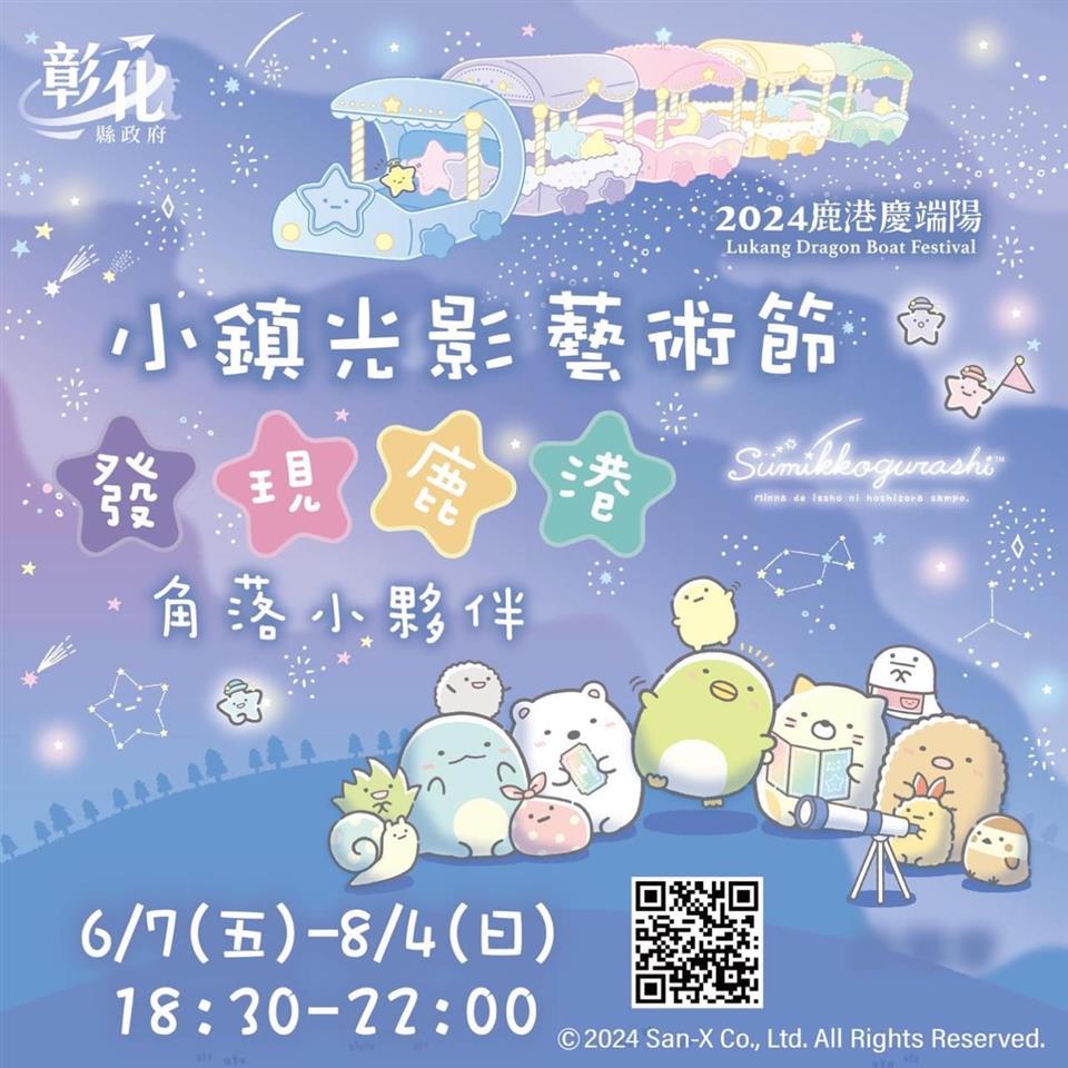 2024鹿港慶端陽-小鎮光影藝術節,訂於6月7日晚間7點於舊鹿港溪水中舞台舉辦開燈儀式,現場將送特製「角落小夥伴」燈球,限量1500個,猜猜看那一個角落小夥伴先登「鹿」;彰化縣長王惠美表示,今年還有特別從日本飛來的角落小夥伴人偶也會到現場與觀眾見面,絕對不能錯過。今年「小鎮光影藝術節」,縣府首度與日本San-X創作的療癒系IP「角落小夥伴」合作,將這群形象鮮明、可愛又療癒的角色帶到鹿港,這是「角落小夥伴」今年在台灣首場大型戶外展出,將展出至8月4日,每晚6:30-10:00點燈,6月7日當天亦有邀請來自花蓮的觀光業者展售當地特產,歡迎大家多多支持、購買。 「2024鹿港慶端陽-小鎮光影藝術節」從6月7日(五)起持續到8月4日(日),另外在6月8日到6月10日端午連假的鹿港慶端陽系列活動,除了重頭戲夜間國際龍舟賽,也規劃多項活動,如河中舞台音樂表演、探索小鎮集章樂、鹿港人文小旅行、美食市集、傳統宮廟煎堆及祈福活動、觀光工廠優惠手作體驗,鹿港鎮公所也舉辦「2024鹿港四季紅-夏鬧端陽系列活動」,活動精采多元,熱鬧非凡,絕對端午假期最夯旅遊熱點。