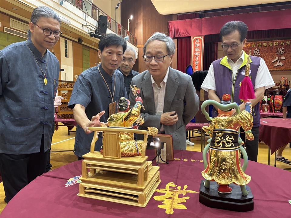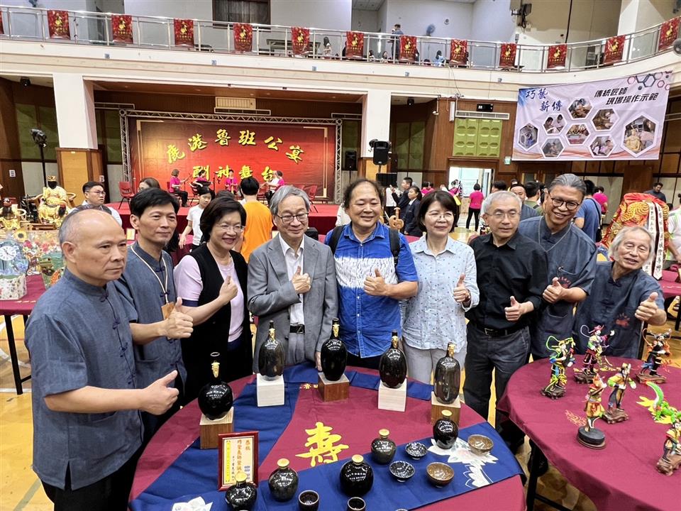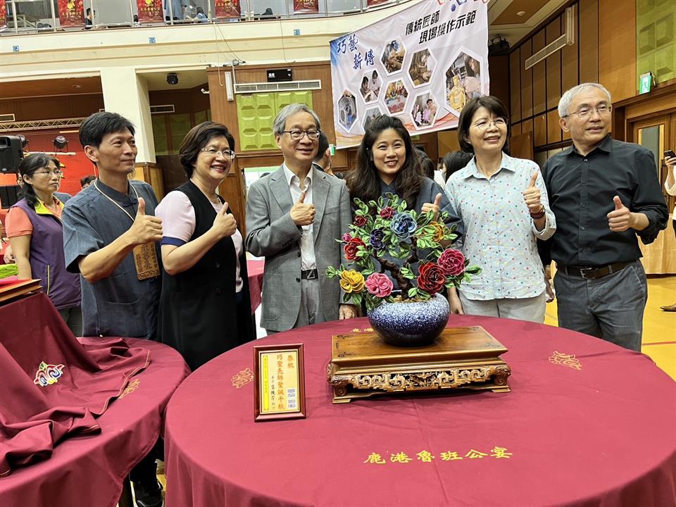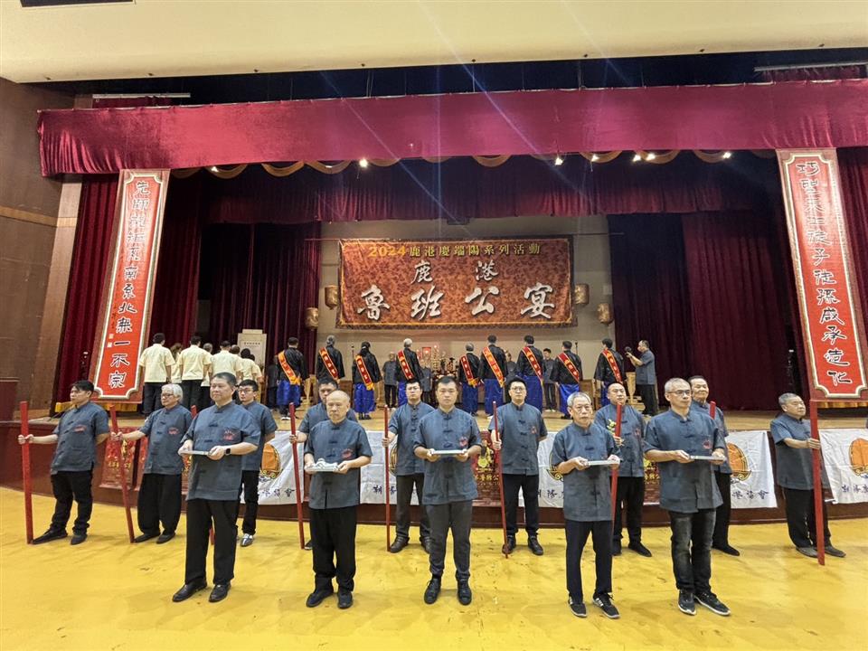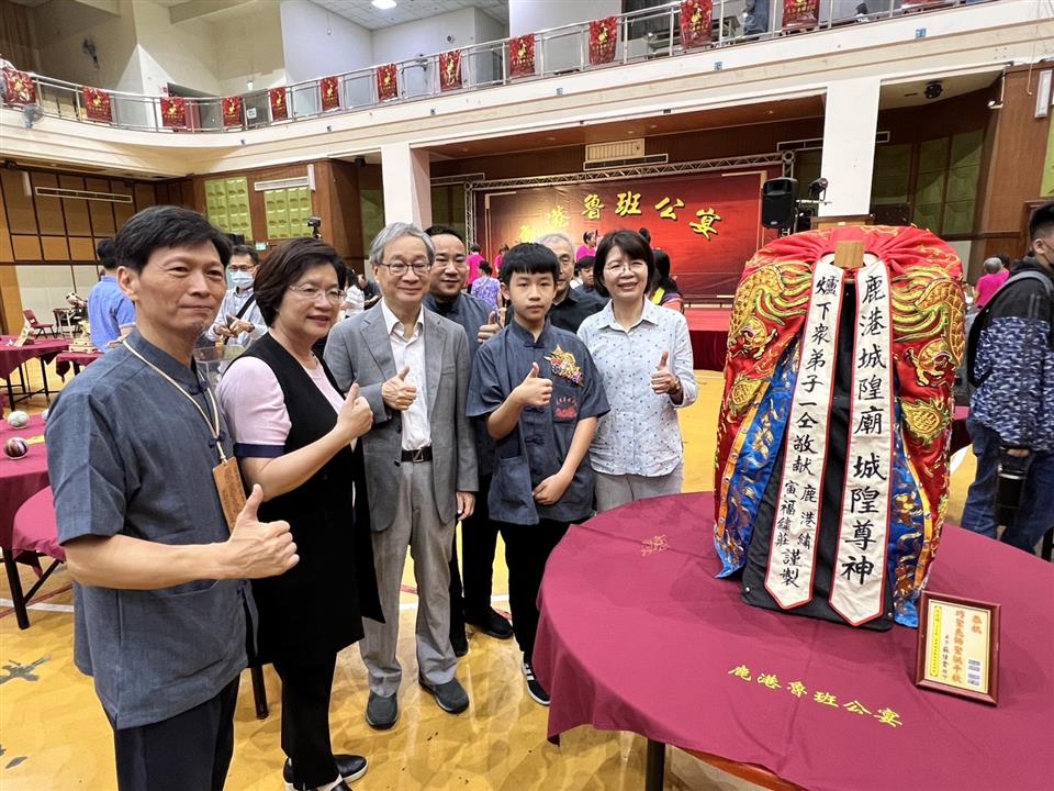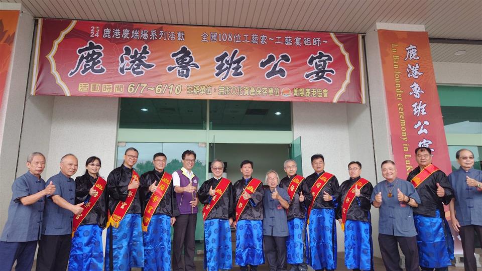 113年鹿港魯班公宴」巧聖先師祀典儀式於今(6/10)日上午在亞太鹿港渡假村舉行,彰化縣長王惠美、文化部長李遠、鹿港鎮朝陽鹿港協會理事長林新發等人出席祭典儀式,現場並展出108桌「看桌」形式的工藝 作品,展示作品共35類、超過500件,呈現壯闊的工藝作品排場。 鹿港魯班公宴,自1996年開辦以來,每年邀請全臺工藝家將集結一整 年心血結晶作品,以傳統民間祭拜習俗的「看桌」展示工藝品,將工藝作 品擺置於供桌齊心「宴祖師」,呈現結合宗教信仰與傳統工藝的藝文活動 ,有傳統工藝技藝的展現,更蘊涵深厚的歷史與文化。 「鹿港魯班公宴」為紀念工藝界的巧聖先師魯班公,於每年魯班公誕 辰日(農曆5月7日)前後舉行「巧聖先師祀典儀式」,祭祀鹿港巧聖先師 會、國立傳統藝術中心及國立臺灣工藝研究發展中心共3尊魯班公神尊, 在儀式中邀請各地工藝家擔任十大護法及五寶侍者,並請主祭官依傳統習 俗獻上班門五寶「文公尺、墨斗、斧頭、大鋸、規矩」,傳達尊師重道的 精神。此外,今年主辦單位於「獻五寶」儀式後增加「祭先賢子弟」儀禮 ,以表達對工藝先賢的崇敬,也復振過去魯班公宴的傳統儀式。 今(10)日為魯班公宴活動最後一日,延續早期鹿港地區魯班公會的組 織型態,下午於會場採跋桮的形式,擲選新任巧聖先師會值年爐主,以擲 最多聖桮獲選新任爐主,作為魯班公宴最後一個儀式,也是重要的起始儀 式,且巧聖先師會魯班公神尊由新任爐主請回家中供奉一年。文化部長李遠親自出席擔任主祭官並逐桌參觀工藝作品,部長表示自己小時候跟著爸爸在廟裡畫門神,今天看到這些工藝作品時,情感彷彿回到小時候。越在地越國際,相當驚艷臺灣的工藝融合現代,不斷精進,感謝臺灣工藝師一輩子奉獻於臺灣工藝。 主辦單位鹿港鎮朝陽鹿港協會表示,為推廣臺灣傳統工藝,今年特別 建立「線上藝廊」,於每件展示工藝品前設置QR code,讓民眾可以透過 線上藝廊進一步認識工藝家及其工藝作品;另外,今年鹿港魯班公宴擴大 舉辦系列活動,包含巧藝薪傳傳統匠師現場操作、百工獻藝傳統工藝市集 活動、DIY工藝小學堂,為進行教育推廣,並與鹿江國際中小學合作,提 供國、臺、英語三種語言導覽服務,讓民眾能多元化的體驗工藝之美,4 天精彩活動佳評如潮,吸引約4萬人次,且祭典維持有老、中、青三代工藝師參與的傳統,希望未來能繼續綿延不斷,一代傳一代來參加魯班公宴。 與會貴賓有故宮博物院院長蕭宗煌、文化部文化資產局局長陳濟民、國立臺灣工藝發展中心主任陳殿禮、國立傳統藝術中心副主任陳修程、人間國寶施鎮洋、陳萬能、立法委員黃秀芳、縣議員凃淑媚、施佩妤、福興鄉長蔣煙燈、鹿港鎮長許志宏、副縣長林田富、彰化縣文化局局長張雀芬、縣政顧問許富足等地方仕紳。