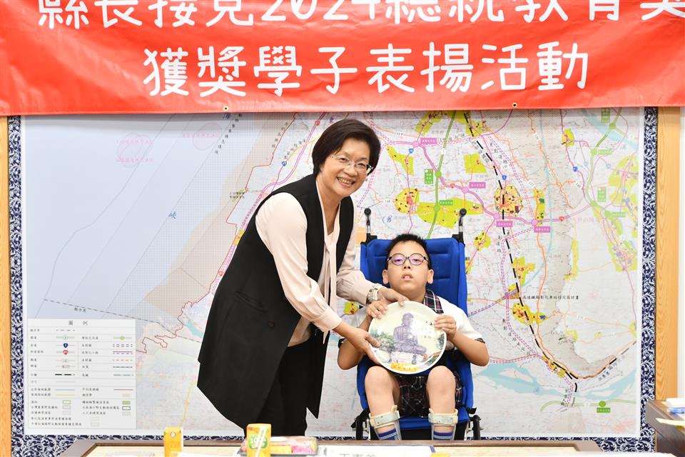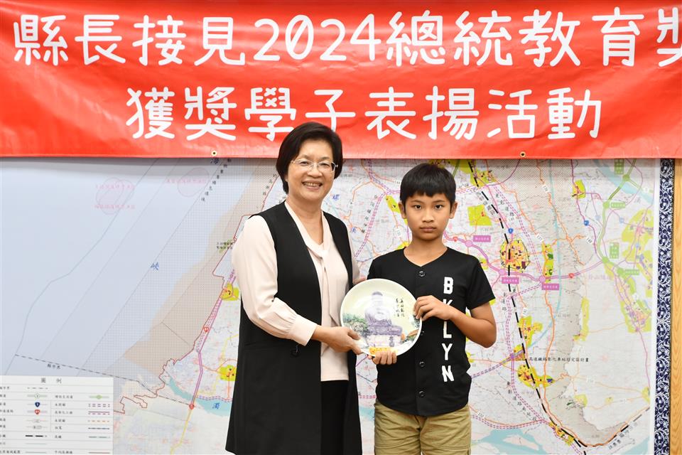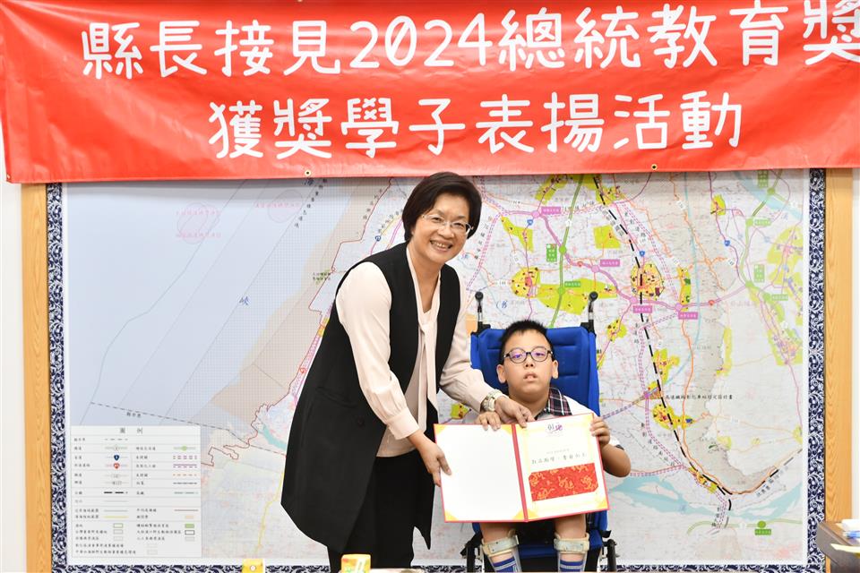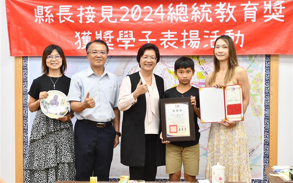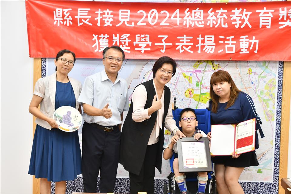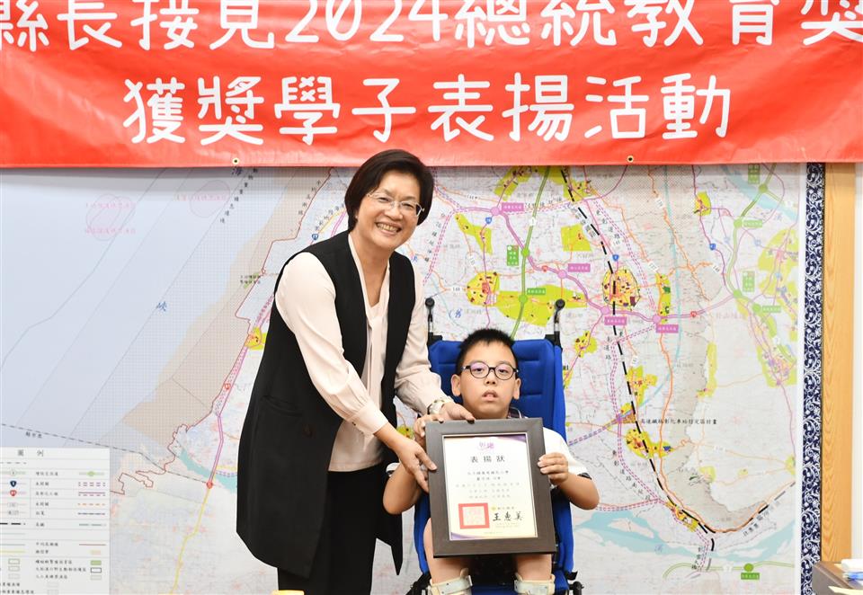 今年總統教育獎由全國各級學校推薦的410名學生中,歷經層層審查後,彰化縣計有3人得獎,分別是縣立成功高中國中部何姍頤同學、南興國小唐羽勤及萬來國小嚴宇浩同學,彰化縣長王惠美於21日在縣長室接見表揚並頒發獎學金各1萬元,王縣長表示,「敦品勵學 奮發向上」,恭喜三位同學克服障礙與努力不懈,於全國410名推薦學生中脫穎而出,榮獲2024總統教育獎,力爭上游的生命故事,不畏懼生活的困苦,克服先天的不便,奮發向上的精神值得鼓勵,也是彰化之光,感謝校長、教練、老師、家長的鼓勵與陪伴,命運掌握在自己手上,期許同學突破自我、再創佳績。 王縣長表示,萬來國小的嚴宇浩同學克服身體的障礙,雖然他的醫院治療師曾評估他終身無法執筆書寫,但他每天忍痛一筆一劃反覆練習,如今,已能書寫工整國字,在各科學習中經常獲得優異成績或進步獎,並二度蟬聯模範生。 王縣長指出,南興國小唐羽勤同學,自小因聽覺障礙,在學習過程上跌跌撞撞,但羽勤並不氣餒,雖然聽不到的耳,但經多次的練習後,眼睛可以看出聲音來,在閱讀、運動和繪畫方面展露長才,積極參加比賽,獲得多項獎項。特別是在閱讀方面,他獲得了學校多項書香獎,也富有正義感,經常幫助同學,未來立志成為一名有智慧且樂於助人的法官。 王縣長表示,成功高中國中部的何姍頤同學,自小家境清寒遭逢父親意外過世,但她從未向命運低頭,為了改變自己,她選擇加入拳擊隊,勤奮苦練,突破困難,不僅在112年獲得全中運銅牌及總統盃全國錦標賽金牌,展現了永不放棄的精神,現在更是學弟妹們的最佳指導員,期望未來朝拳擊隊國手之路努力。 萬來國小的嚴宇浩同學表示,很高興今天能夠來跟縣長媽媽見面,未來希望能夠用自己的力量幫助更多需要的人。 南興國小唐羽勤表示,他立志未來希望能夠成為一名法官。 成功高中何姍頤同學表示,能夠獲得總統教育獎,要謝謝教練、老師以及學校,期望能夠藉由她的故事,鼓勵更多人不畏逆境,勇往向前。 與會陪同貴賓有縣府教育處長蔡金田、縣立成功高中校長林克修、教練洪政代、南興國小老師謝佩君、萬來國小校長陳靜婷等。
