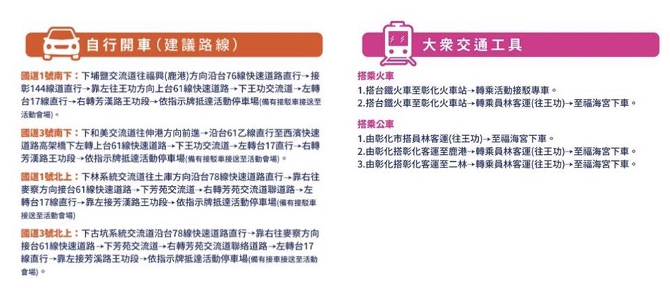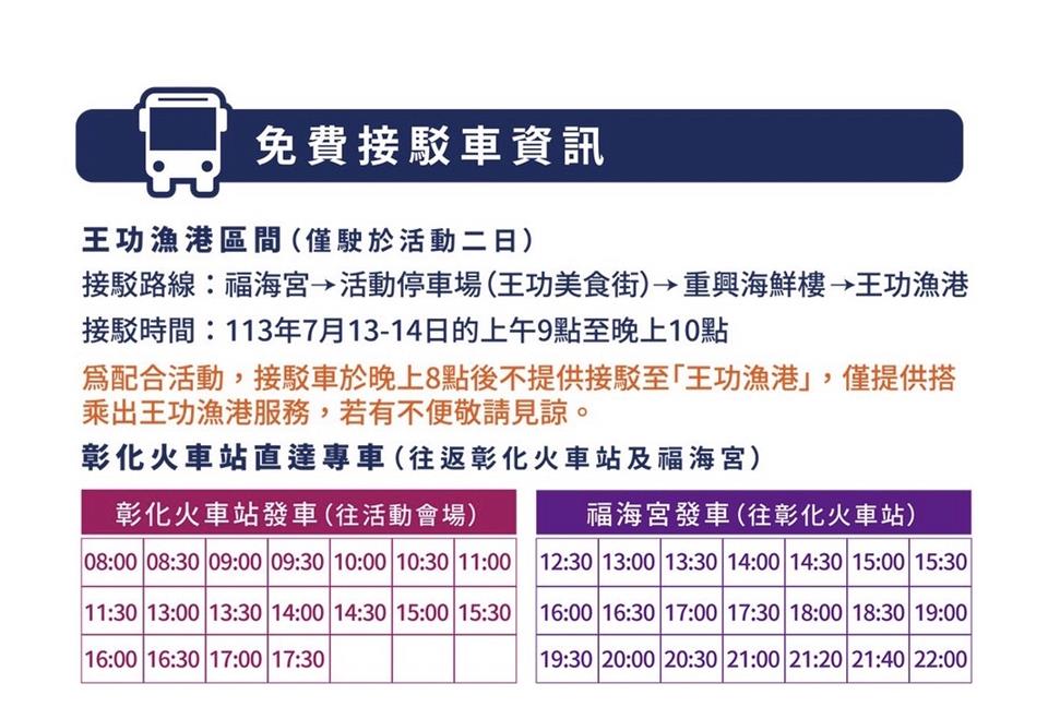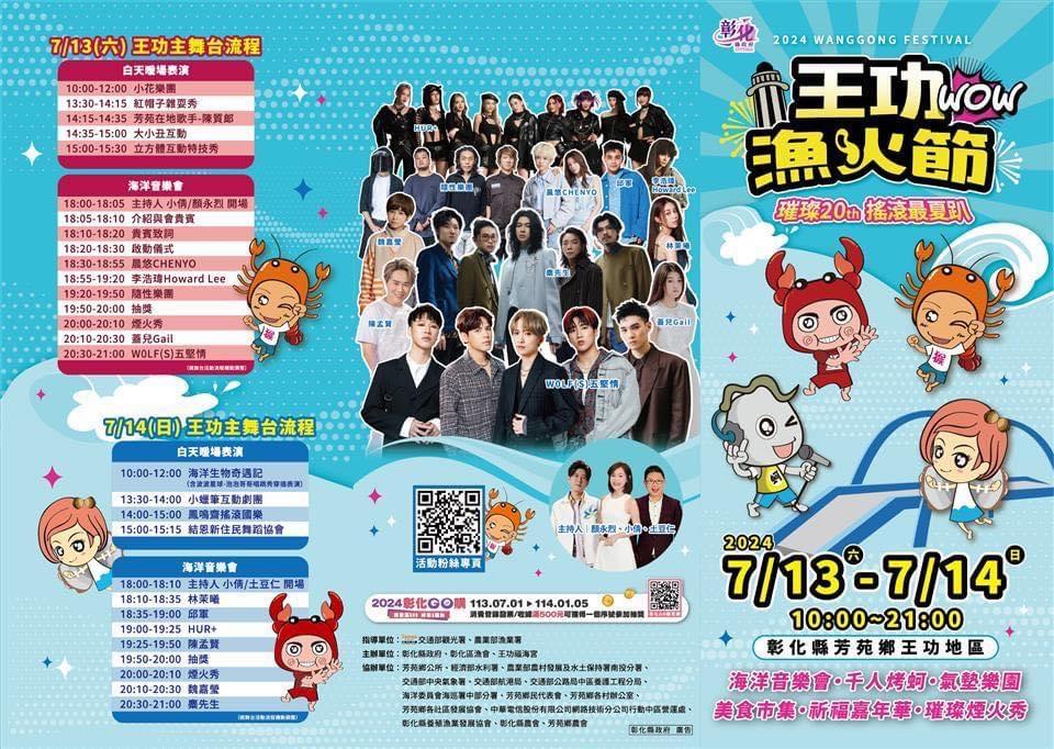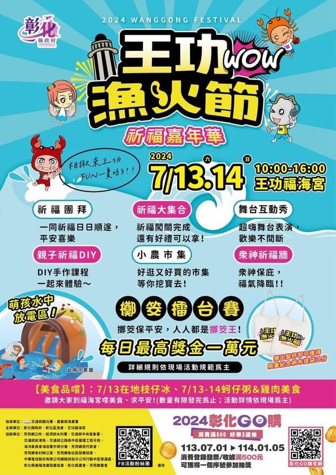 「北貢寮、中王功、南墾丁」,王功漁火節,邁入20週年,是中台灣最盛大的海洋音樂會,彰化縣長王惠美邀請大家一起嗨翻天!吃喝玩樂拿獎金! 今年活動盛大有三大亮點,包括在王功漁港有水陸氣墊樂園、千人烤蚵、祈福嘉年華、連續二天在晚上8點有7分鐘璀璨煙火秀、無人機及燈光秀、還有壓軸海洋音樂會,將由五堅情、麋先生、魏嘉瑩、陳孟賢等11組樂團歌手接力演出。另外在福海宮連續二天都有擲筊擂台賽,每日最高獎金1萬元。歡迎全國鄉親,7/13、14 相約彰化王功見! 活動期間為有效疏通人潮,每日上午9點至晚上10點在王功漁港至福海宮區間,提供定點免費接駁車服務,另外也規劃彰化火車站往返王功福海宮的直達專車,歡迎民眾多加搭乘利用。 王功漁火節活動官網:https://2024wanggong.com/ 愛玩彰化: https://tourism.chcg.gov.tw/CalendarlContent.aspx?id=610&chk=5498260e-0fb3-4213-9b22-fab2ba315c1f&